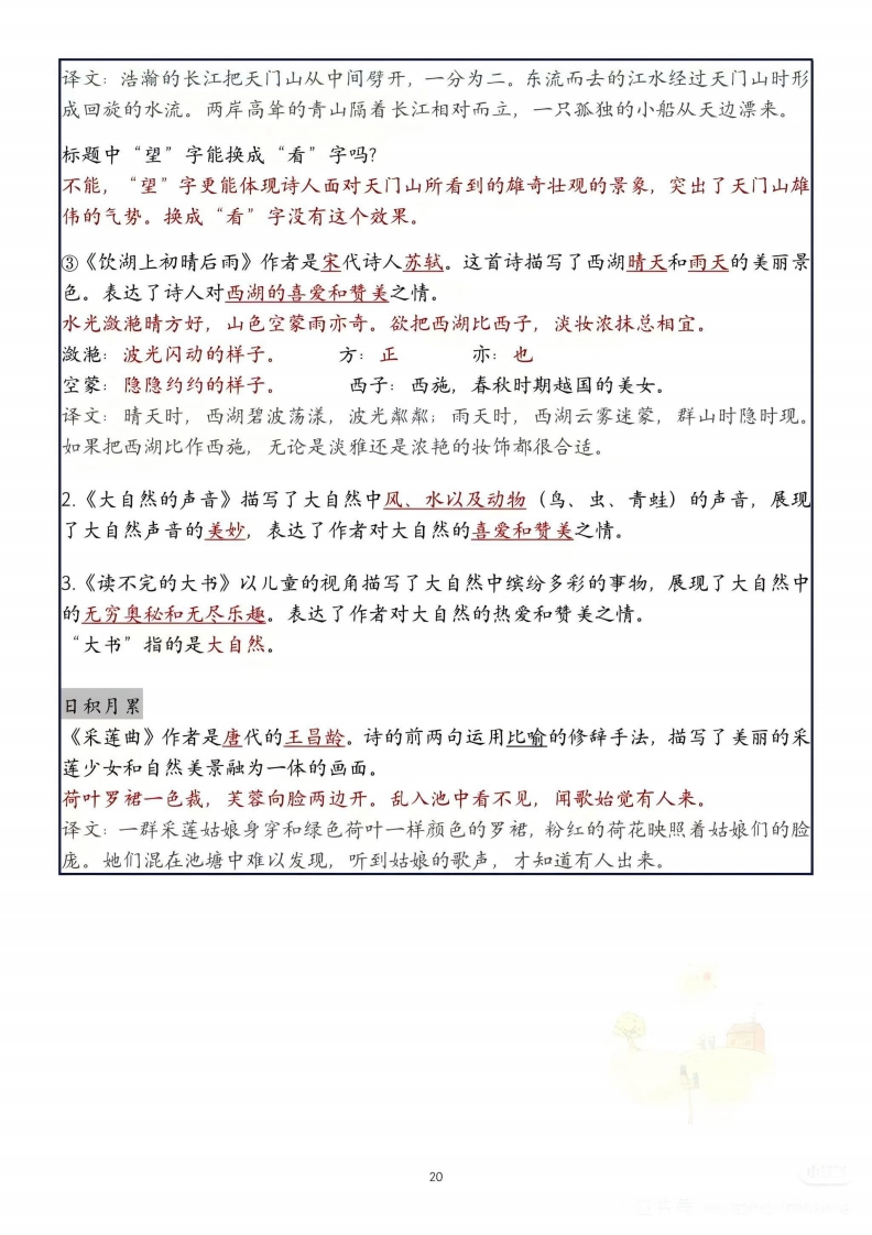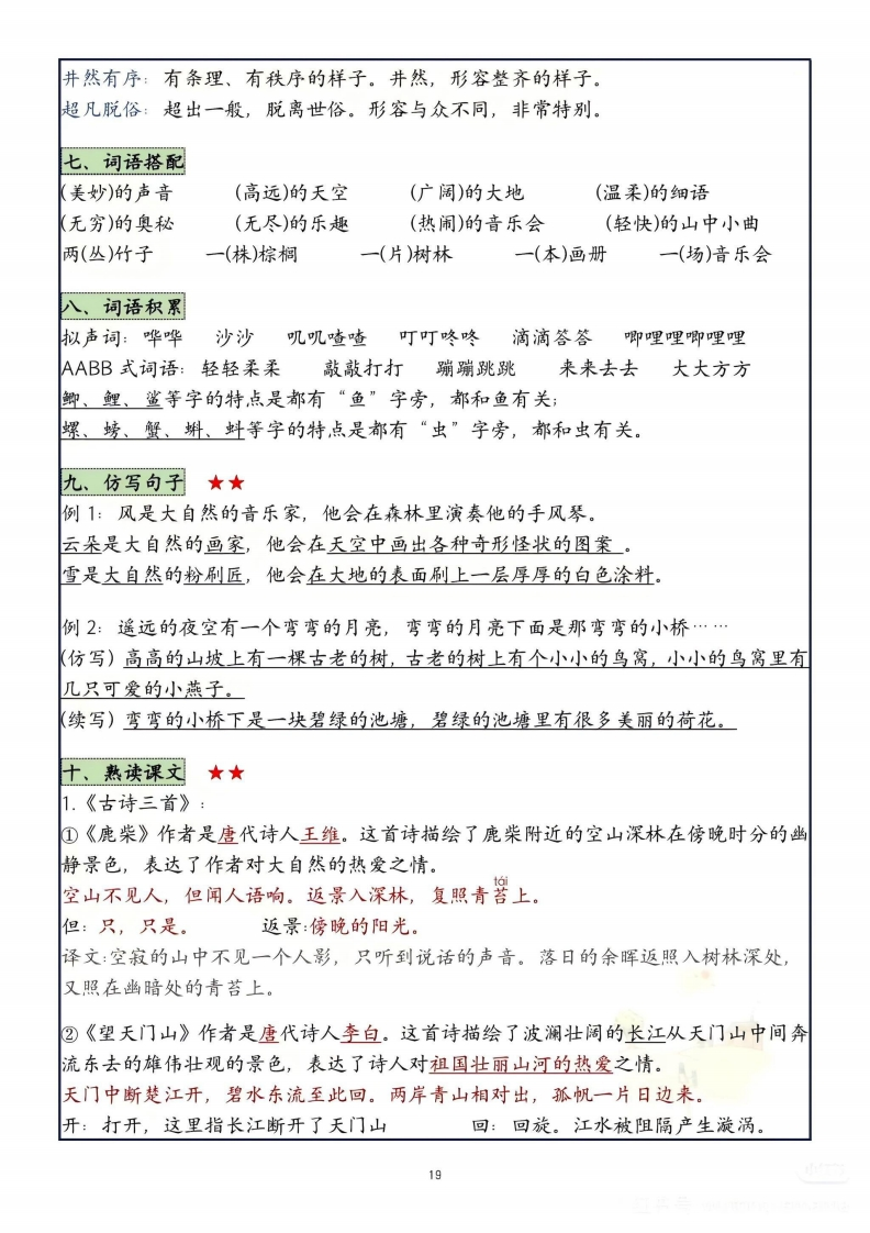 三年级上册语文第七单元知识点总结会辨音★★返回(fan)青苔(tai)亦是(yi)适宜(yi)呢喃(ninan)演奏(zòu)汇聚(hui)充满(chong)顺序(xù)奥秘(àomi)激动()伟大(wěi)击打()麻雀(md)盘旋(xudn)姿态(2i)忠贞(zhen)竹笋(sin)俗气(sú)超凡(chao fan)、会写词语★★标了拼音的字和音都要会写miao歌手美妙感受温柔合奏大自然音乐家威力充满乐器汇集屋顶河流手风琴轻快合唱虫鸣水塘龙虾昆虫井然有序万物不仅沉思搬家光荣干枯千姿百态植物精神刺鼻梨树鲜美池塘秋高气爽倒映游玩画册部分无穷奥秘无尽luopang xiesh田螺螃蟹鲤鱼鲫鱼鲨鱼会辨形近字★「孤(孤单)妙(美妙)饮(饮用)器(机器)「姿(姿态)狐(狐狸)秒(秒钟)吹(吹气)哭(哭泣)资(资本)「塘(池塘)充(充满)鸣(鸣叫)「枯(千枯)「荣(光荣)溏(溏心)L允(允许)L鸣(鸣咽)枝(树枝)L宋(宋朝)四、会辨多音字★mǒ(浓妆淡抹)ni(呢喃)ryue(音乐)】抹mò(拐弯抹角)》呢乐mā(抹布)ne(人呢)L1è(乐趣)五、近义词1.近义词美妙一美好愉悦一愉快沉思一深思如同一好像勇猛一勇敢2.反义词愉悦一难过激动一平静轻快一沉重温柔一粗暴汇集一分散六、词语释义呢喃细语:形容小声说话秋高气爽:秋天天空晴朗明净,气候凉爽宜人。18