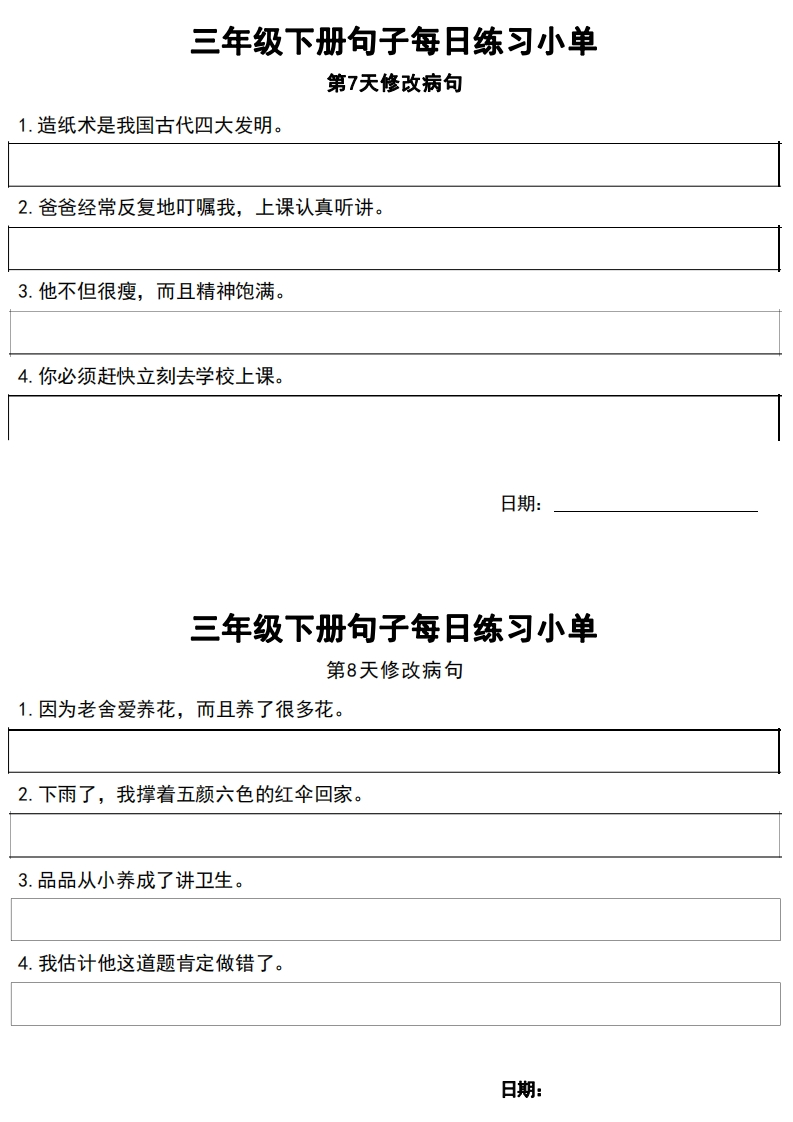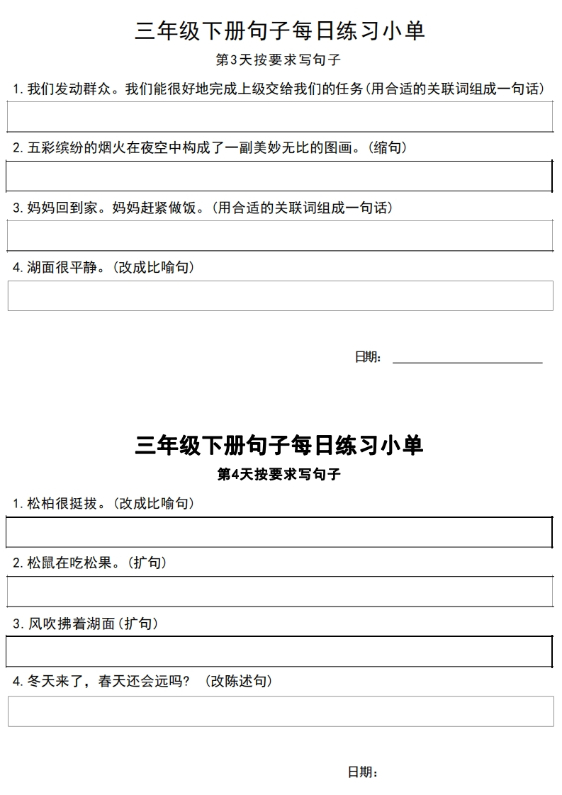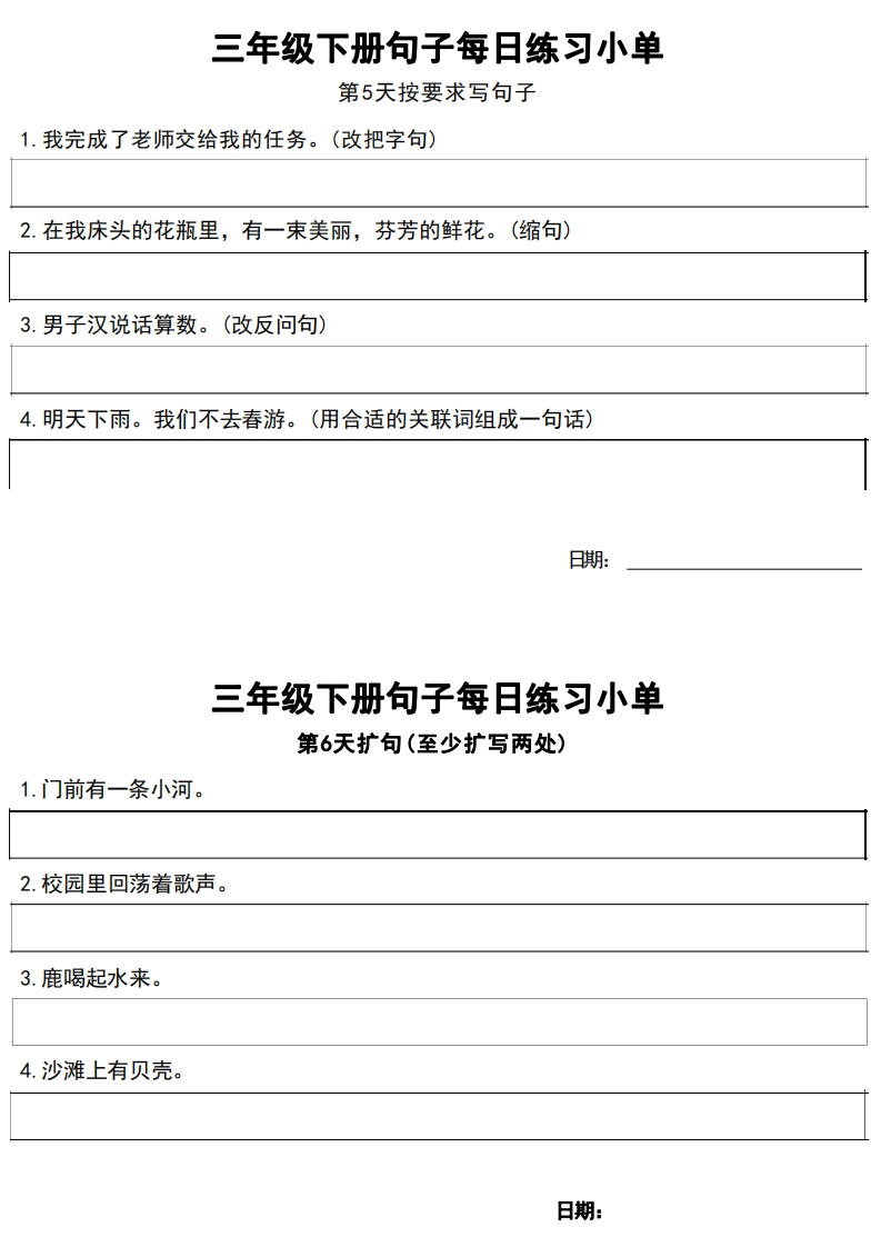 三年级语文下册每日句子练习单985文库2个月前发布关注私信1.61MB10页63815三年级语文下册每日句子练习单此内容为付费资源,请付费后查看¥3 限时特惠¥9.9黄金会员免费钻石会员免费登录购买付费资源 开学季半价抢会员,享受免费下载 点击开通 文章目录 1 封面图 2 文档部分预览截图 3 下载地址 第1页 / 共10页 第2页 / 共10页 第3页 / 共10页 第4页 / 共10页 试读已结束,还剩6页,您可下载完整版后进行离线阅读 版权声明 1 本网站名称: 985文库 2 本站永久网址:https://985wenku.cn 3 本站资源部分来自网络,由老师收集整理,如有侵犯你的权益请联系管理员E-mail:240407401@qq.com 我们会第一时间进行审核删除。 开通网站会员,全站资料免费下载 THE END三年级资料 文本预览 三年级下册句子每日练习小单第1天按要求写句子1.树叶飘落下来。(改写成比喻句)2.小草从地里长了出来。(改成拟人句)3.我终于取出了装在书包里的小人书。(改成把子句)4.人们怎能不把香港称为“东方之珠”呢?(改陈述句)日期:三年级下册句子每日练习小单第2天按要求写句子1.你怎么能独自一个人去看电影呢?(改陈述句)2.杭州的西湖像一颗光彩夺目的明珠。(改反问句)3.那皎洁的月光曾引起人们许许多多的美好遐想。(缩句)4.小华的字写的很快。小华的字写的很好(用合适的关联词组成一句话)日期: 查看更多 收起部分 喜欢就支持一下吧点赞15 分享QQ空间微博QQ好友海报分享复制链接收藏