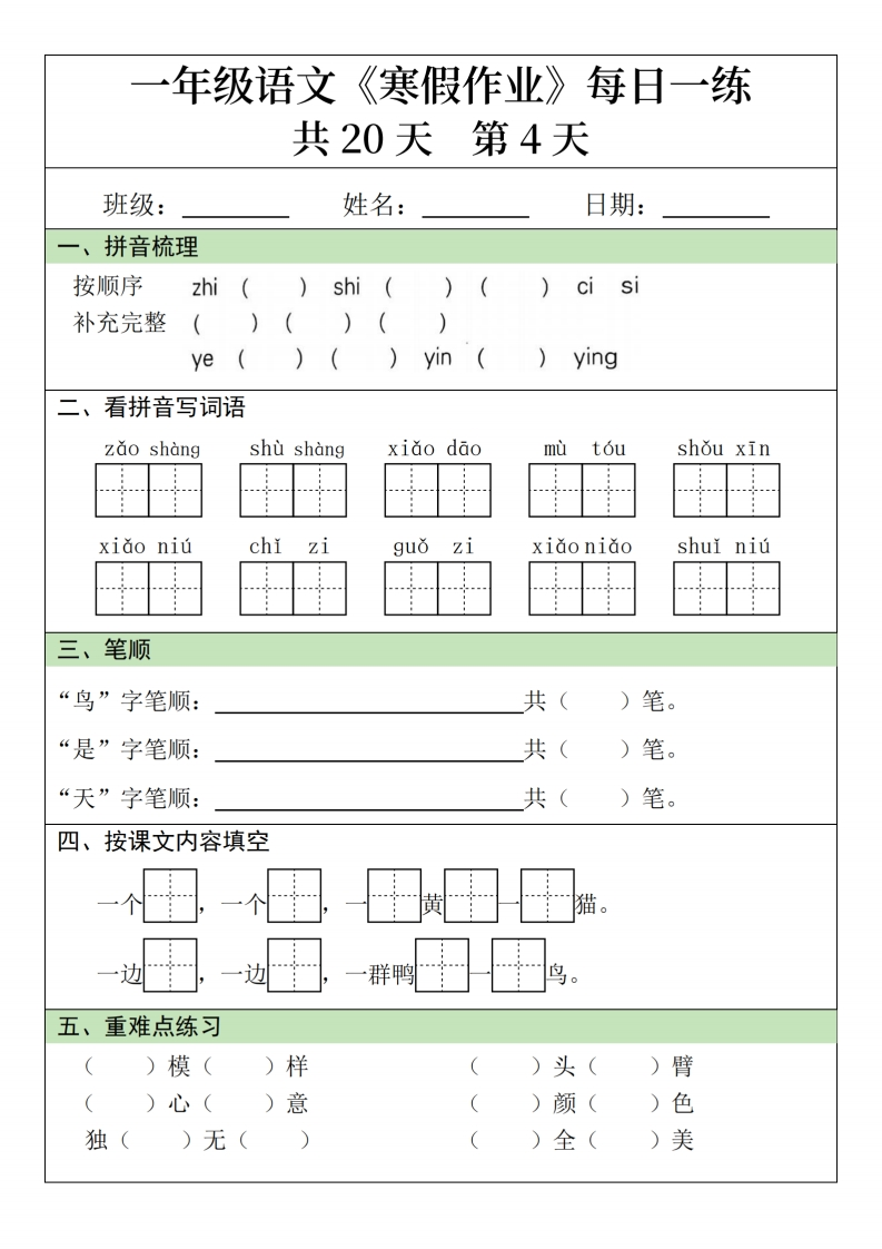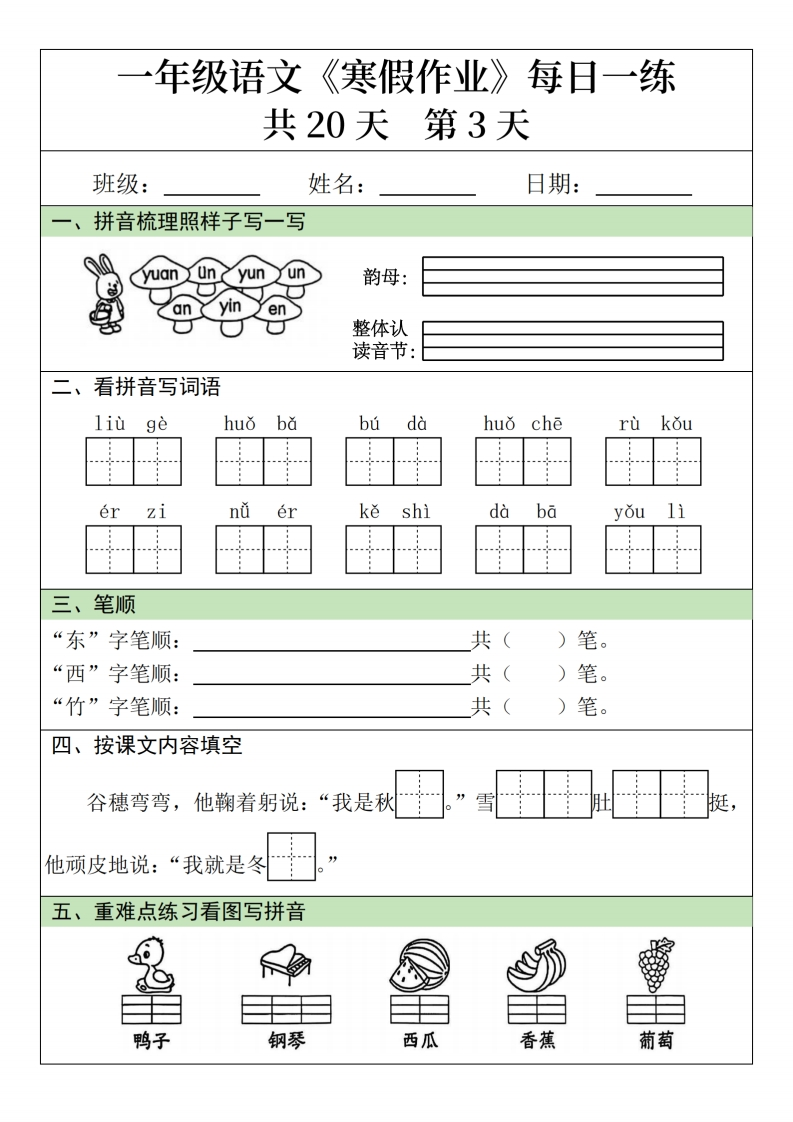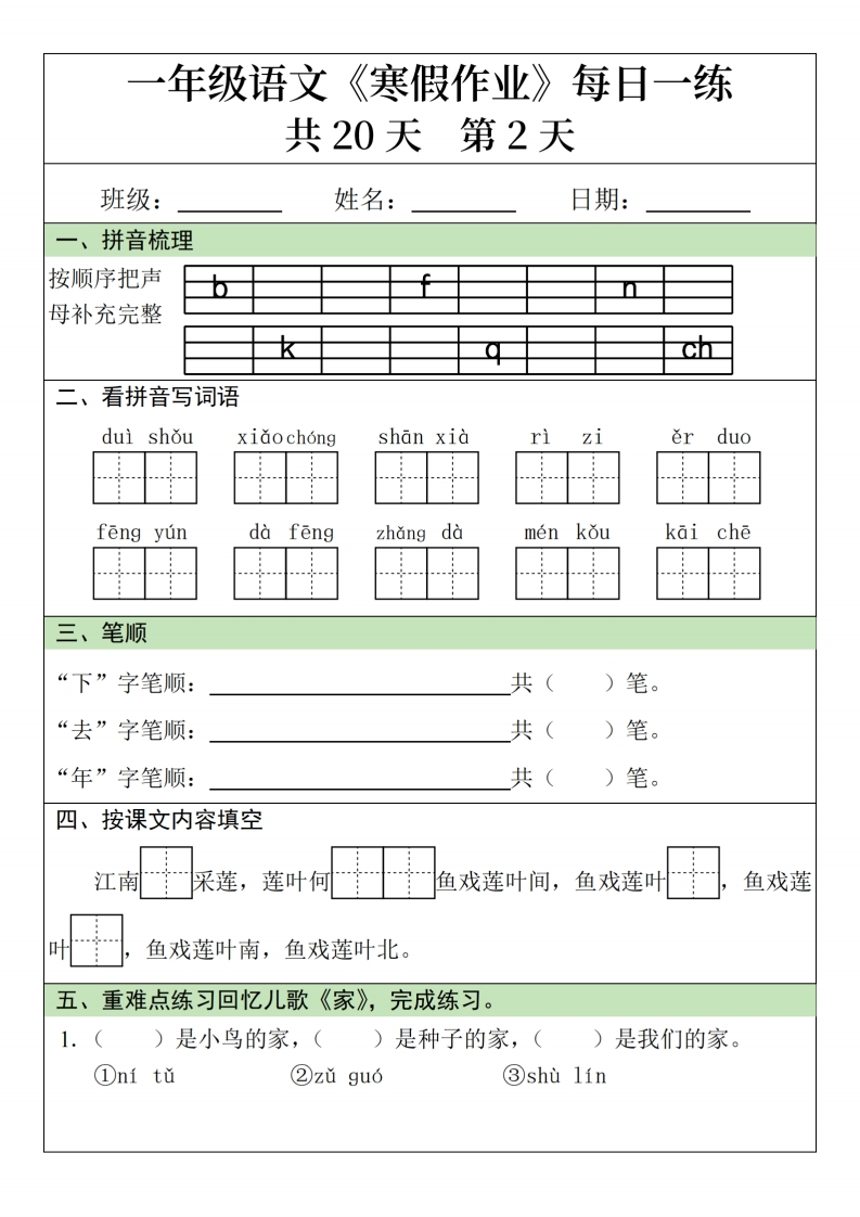 一年级语文寒假作业每日一练20天(20页)985文库1个月前发布关注私信6.11MB20页150115一年级语文寒假作业每日一练20天(20页)此内容为付费资源,请付费后查看¥3 限时特惠¥9.9黄金会员免费钻石会员免费登录购买付费资源 开学季半价抢会员,享受免费下载 点击开通 文章目录 1 封面图 2 文档部分预览截图 3 下载地址 第1页 / 共20页 第2页 / 共20页 第3页 / 共20页 第4页 / 共20页 试读已结束,还剩16页,您可下载完整版后进行离线阅读 版权声明 1 本网站名称: 985文库 2 本站永久网址:https://985wenku.cn 3 本站资源部分来自网络,由老师收集整理,如有侵犯你的权益请联系管理员E-mail:240407401@qq.com 我们会第一时间进行审核删除。 开通网站会员,全站资料免费下载 THE END一年级资料 文本预览 一年级语文《寒假作业》每日一练共20天第1天班级:姓名:日期:一、拼音梳理声母(23个)二、看拼音写词语renkǒuěrduom心guangshou xinjiémùdahuǒsheng rihemiáohuǒshanriyue三、笔顺“口”字笔顺:共()笔。“目”字笔顺:共()笔。“共”字笔顺:共()笔。四、按课文内容填空鹅,鹅,鹅,曲项向…歌。毛浮绿…红掌拨清波。五、重难点练习十三禾六从上到下:先横后竖: 查看更多 收起部分 喜欢就支持一下吧点赞15 分享QQ空间微博QQ好友海报分享复制链接收藏