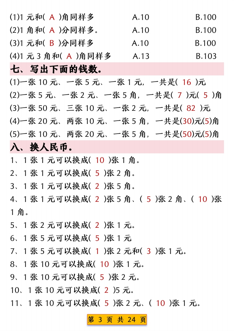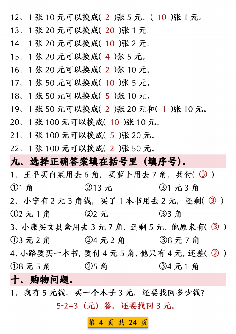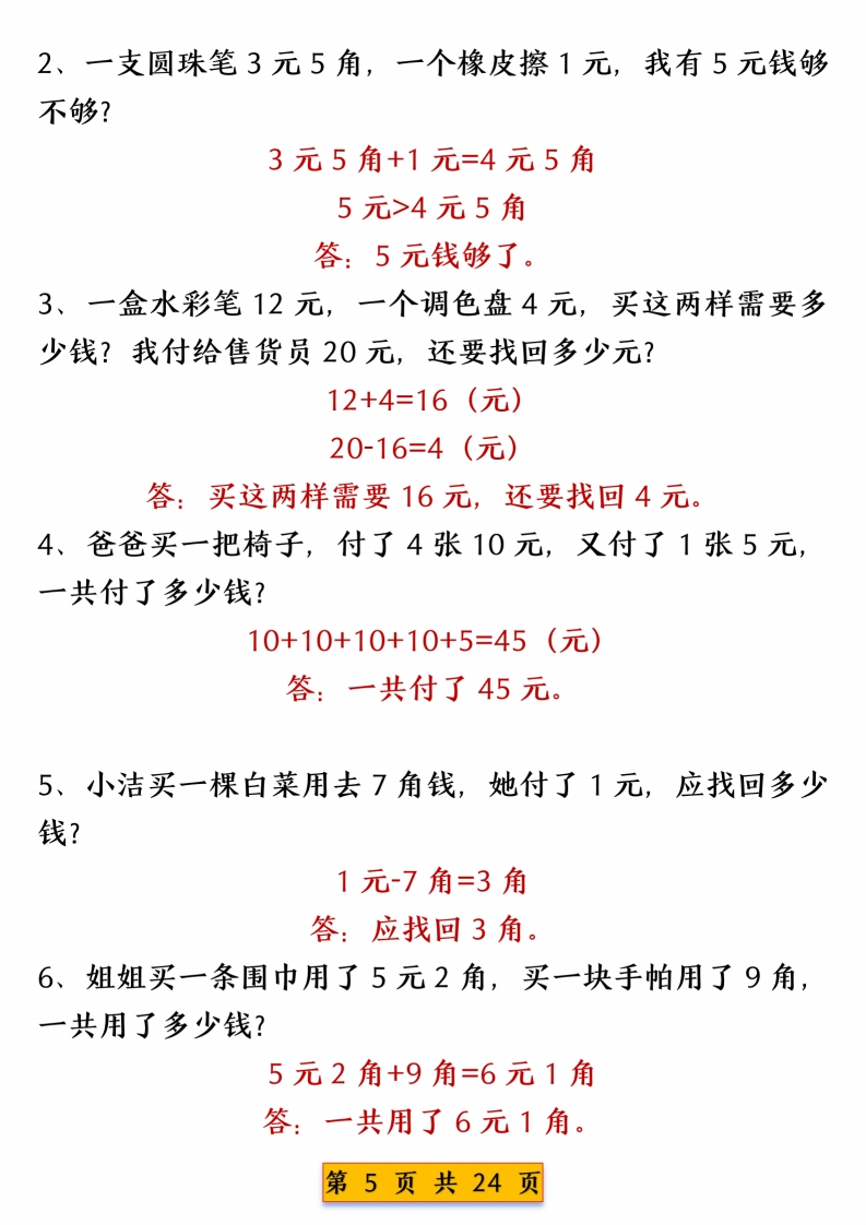 一年级下册数学人民币换算专项练习含答案985文库1个月前发布关注私信10.18MB24页11809一年级下册数学人民币换算专项练习含答案此内容为付费资源,请付费后查看¥3 限时特惠¥9.9黄金会员免费钻石会员免费登录购买付费资源 开学季半价抢会员,享受免费下载 点击开通 文章目录 1 封面图 2 文档部分预览截图 3 下载地址 第1页 / 共24页 第2页 / 共24页 第3页 / 共24页 第4页 / 共24页 第5页 / 共24页 试读已结束,还剩19页,您可下载完整版后进行离线阅读 版权声明 1 本网站名称: 985文库 2 本站永久网址:https://985wenku.cn 3 本站资源部分来自网络,由老师收集整理,如有侵犯你的权益请联系管理员E-mail:240407401@qq.com 我们会第一时间进行审核删除。 开通网站会员,全站资料免费下载 THE END一年级资料 文本预览 一年级数学下册人民币换算专项练习人民币换算练习一一、在()里填上合适的数。20分=(2)角7角=(70)分60角=(6)元1元=(100)分40角=(4)元1元=(10)角5角4分=(54)分65角=(6)元(5)角9角=(90)分3元6角=(36)角23分=(2)角(3)分70角=(7)元二、在O里填上“>”、“<”或“=”。50分曰5角4分③4角1元©9角3角©31分7元©7角6元8角☒7元42分③4元1角三、人民币换算。12.00元=(12)元3.20元=(3)元(2)角0.60元=(6)角14.10元=(14)元(1)角0.75元=(7)角(5)分100.40元=(100)元(4)角2.40元=(2)元(4)角6元9角-6角=(6)元(3)角0.90元=(0)元(9)角17.30元=(17)元(3)角(0)分1.20元=(1)元(2)角8.73元=(8)元(7)角(3)分9.80元=(9)元(8)角7元3角-5元=(2)元(3)角9角+9元1角=(10)元3元6角+3角=(3)元(9)角4元3角+7角=(5)元4元2角+5角=(4)元(7)角四、填空题。1、人民币的单位有(元)、(角)、(分)。第1页共24页 查看更多 收起部分 喜欢就支持一下吧点赞9 分享QQ空间微博QQ好友海报分享复制链接收藏