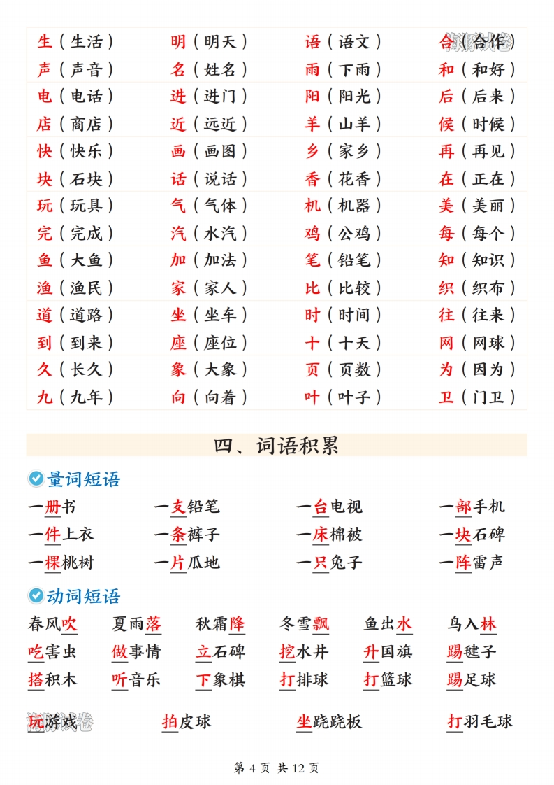 26春一年级下册语文寒假预习知识点汇总985文库1个月前更新关注私信7.41MB12页864526春一年级下册语文寒假预习知识点汇总此内容为付费资源,请付费后查看¥3 限时特惠¥5黄金会员¥1钻石会员¥0.5登录购买付费资源 开学季半价抢会员,享受免费下载 点击开通 文章目录 1 封面图 2 文档部分预览截图 3 下载地址 第1页 / 共12页 第2页 / 共12页 第3页 / 共12页 第4页 / 共12页 试读已结束,还剩8页,您可下载完整版后进行离线阅读 版权声明 1 本网站名称: 985文库 2 本站永久网址:https://985wenku.cn 3 本站资源部分来自网络,由老师收集整理,如有侵犯你的权益请联系管理员E-mail:240407401@qq.com 我们会第一时间进行审核删除。 开通网站会员,全站资料免费下载 THE END一年级资料 文本预览 26春一年级下册语文寒假预习知识点汇总一、日积月累⊙亲情类词语(语文园地四)尊老爱幼其乐融融血浓于水手足情深同心协力同甘共苦天伦之乐欢聚一堂⊙歇后语(语文园地五)芝麻开花—节节高竹篮打水一一场空十五个吊桶打水一七上八下⊙天气谚语(语文园地六)朝霞不出门,晚霞行千里。有雨山戴帽,无雨半山腰。早晨下雨当日晴,晚上下雨到天明。蚂蚁搬家蛇过道,大雨不久要来到。⊙学习类名言(语文园地七)】不知则问,不能则学。一《荀子》一日无书,百事荒芜。一陈寿读万卷书,行万里路。董其昌二、汉语拼音字母表Aa:::Bb::.Cc::Dd:E:f::Gg::h::::Kk:::::Mm:Nn00::Pp::Qq::Rr::.Ss::Tt:u:Vv::W:w..XxYy:ZZ第1页共12页 查看更多 收起部分 喜欢就支持一下吧点赞5 分享QQ空间微博QQ好友海报分享复制链接收藏