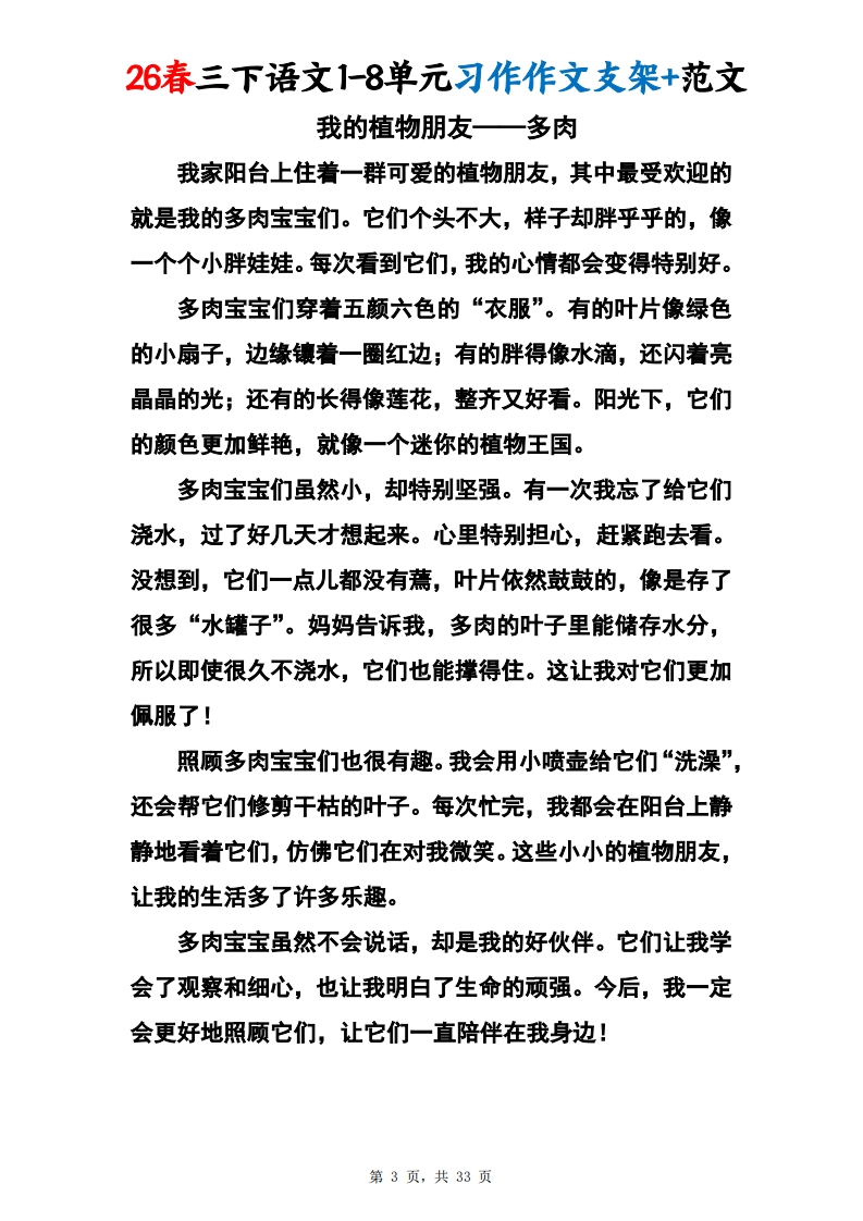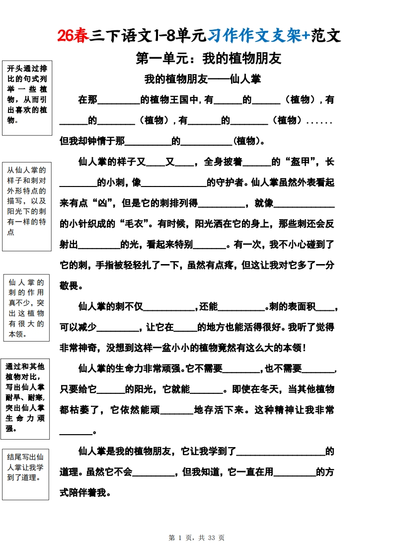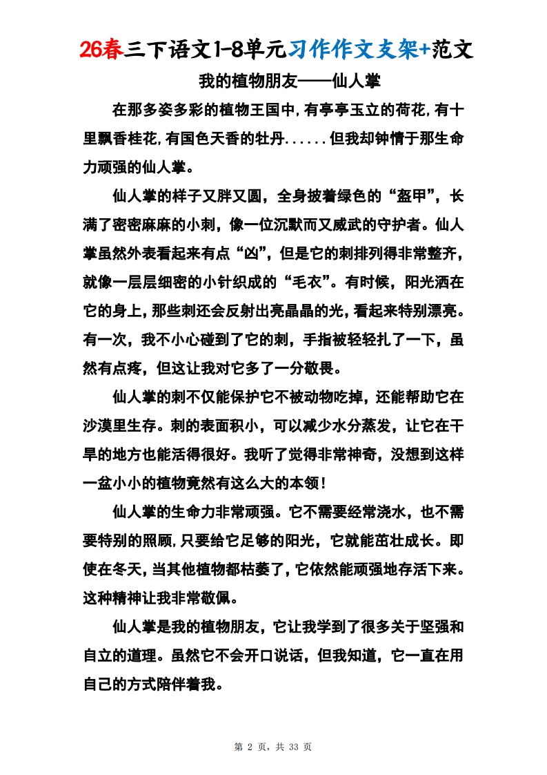 26春三年级下册语文1-8单元习作支架加范文985文库1个月前更新关注私信0.47MB34页10961426春三年级下册语文1-8单元习作支架加范文此内容为付费资源,请付费后查看¥3 限时特惠¥5黄金会员¥1钻石会员¥0.5登录购买付费资源已售 1 开学季半价抢会员,享受免费下载 点击开通 文章目录 1 封面图 2 文档部分预览截图 3 下载地址 第1页 / 共34页 第2页 / 共34页 第3页 / 共34页 第4页 / 共34页 试读已结束,还剩30页,您可下载完整版后进行离线阅读 版权声明 1 本网站名称: 985文库 2 本站永久网址:https://985wenku.cn 3 本站资源部分来自网络,由老师收集整理,如有侵犯你的权益请联系管理员E-mail:240407401@qq.com 我们会第一时间进行审核删除。 开通网站会员,全站资料免费下载 THE END三年级资料 文本预览 26春三下语文1-8单元习作作文支架+范文目录第一单元:我的植物朋友,1范文(3篇)2-4第二单元:放风筝。6范文(3篇)6-8第三单元:我做了一项小实验9范文(3篇)10-12第四单元:中国传统节日.13范文(3篇)14-16第五单元:奇妙的想象17范文(3篇)18-21第六单元:身边那些有特点的人22范文(3篇)23-25第七单元:国宝大熊猫26范文(3篇)27-29第八单元:这样想象真有趣30范文(3篇)31-33 查看更多 收起部分 喜欢就支持一下吧点赞14 分享QQ空间微博QQ好友海报分享复制链接收藏