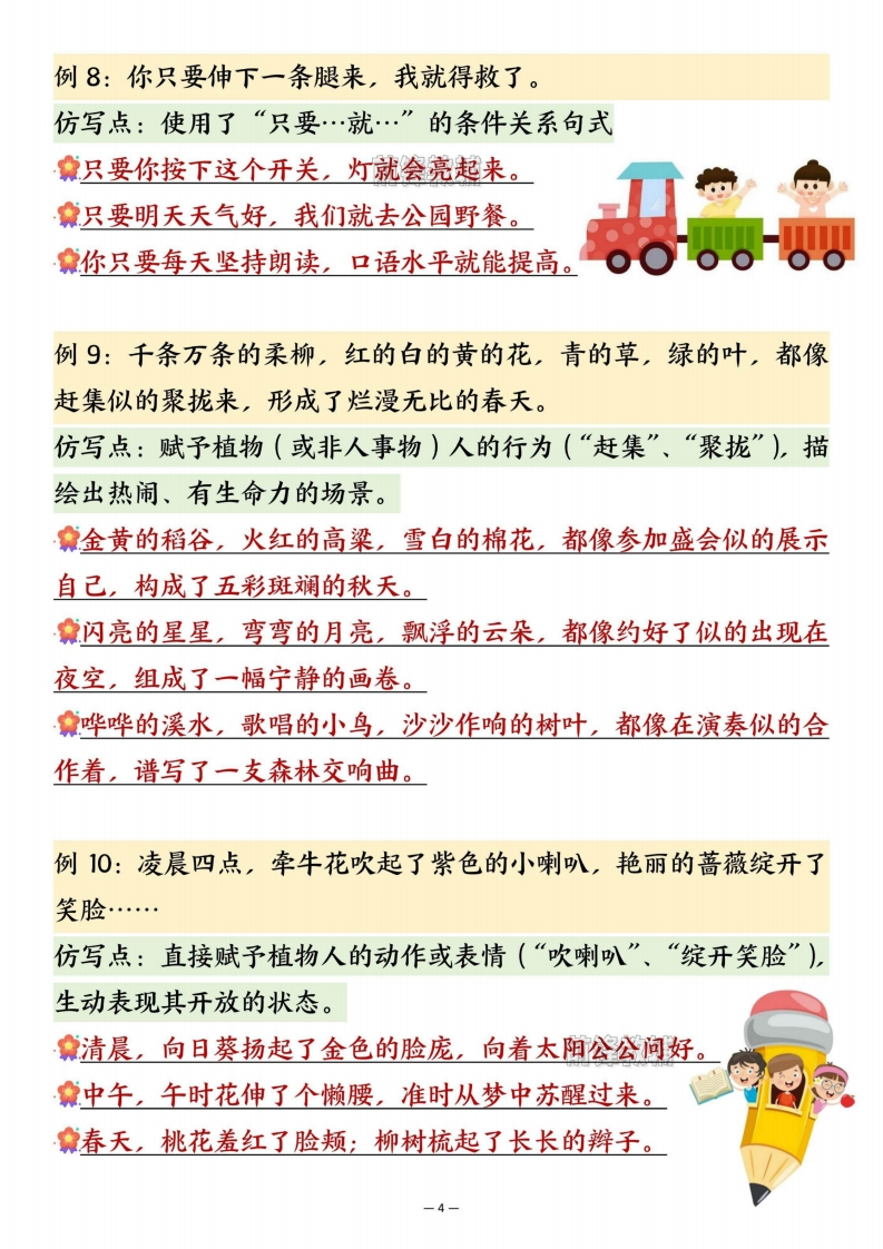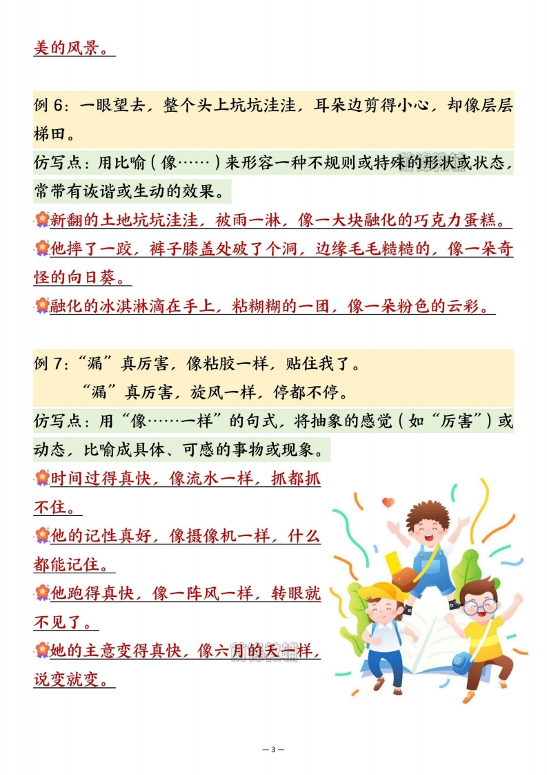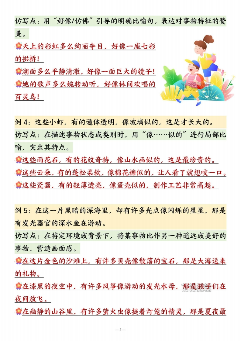 26春三年级下册语文重点句子仿写汇总985文库1个月前更新关注私信4.57MB11页10601526春三年级下册语文重点句子仿写汇总此内容为付费资源,请付费后查看¥3 限时特惠¥5黄金会员¥1钻石会员¥0.5登录购买付费资源 开学季半价抢会员,享受免费下载 点击开通 文章目录 1 封面图 2 文档部分预览截图 3 下载地址 第1页 / 共11页 第2页 / 共11页 第3页 / 共11页 第4页 / 共11页 试读已结束,还剩7页,您可下载完整版后进行离线阅读 版权声明 1 本网站名称: 985文库 2 本站永久网址:https://985wenku.cn 3 本站资源部分来自网络,由老师收集整理,如有侵犯你的权益请联系管理员E-mail:240407401@qq.com 我们会第一时间进行审核删除。 开通网站会员,全站资料免费下载 THE END三年级资料 文本预览 26春三年级下册语文重点仿写句子汇总亲爱的家长朋友们,将这份知识“秘籍”打印出来吧!让孩子抢先一步,在预习的奇妙旅程中,探索知识的宝藏,为新学期的学习之旅扬起自信的风帆。例1:荷叶挨挨挤挤的,像一个个碧绿的大圆盘。仿写点:将某事物直接比作另一个具体、常见的事物(A像B),使描写更形象。食银杏叶纷纷扬扬地落下,像一把把金色的小扇子。清晨的露珠挂在草尖上,像一颗颗晶莹的钻石。妹妹的小脸蛋圆圆的,像一个红扑扑的苹果。例2:一身乌黑的羽毛,一双剪刀似的尾巴,一对轻快有力的翅膀凑成了那样可爱的活泼的小燕子。仿写点:通过并列几个带有比喻(“…似的”)的局部特征,来组合描绘一个完整事物的外形。食一身雪白的绒毛,一对红宝石似的眼睛,加上短短的小尾巴,凑成了那样机灵的小白兔。拿一身坚硬的铠甲,两把大刀似的前肢,加上灵活的触角,凑成了那样威武的螳螂。食一身五彩的鳞片,一把扇子似的大尾巴,加上薄纱般的鱼鳍,凑成了那样美丽的热带鱼。例3:我的角多么精美别致,好像两束美丽的珊瑚」-1 查看更多 收起部分 喜欢就支持一下吧点赞15 分享QQ空间微博QQ好友海报分享复制链接收藏