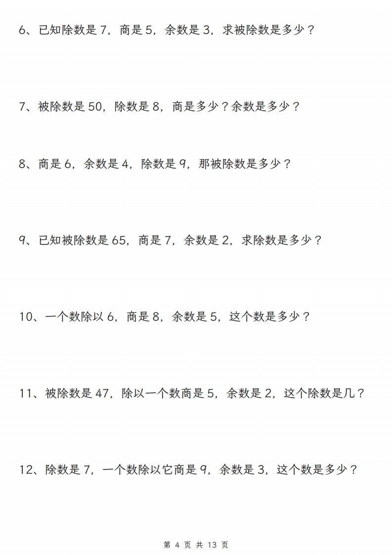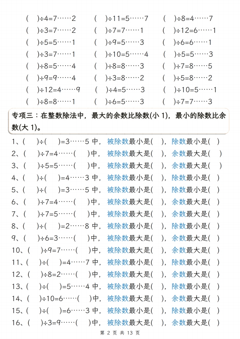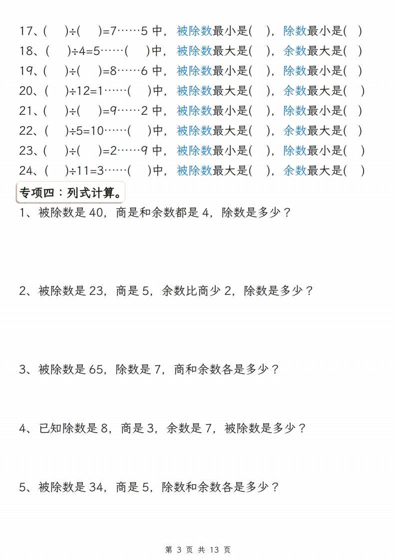 二年级下册数学有余数的除法五大专项练习含答案985文库1个月前更新关注私信4.64MB13页82514二年级下册数学有余数的除法五大专项练习含答案此内容为付费资源,请付费后查看¥3 限时特惠¥5黄金会员¥1钻石会员¥0.5登录购买付费资源 开学季半价抢会员,享受免费下载 点击开通 文章目录 1 封面图 2 文档部分预览截图 3 下载地址 第1页 / 共13页 第2页 / 共13页 第3页 / 共13页 第4页 / 共13页 试读已结束,还剩9页,您可下载完整版后进行离线阅读 版权声明 1 本网站名称: 985文库 2 本站永久网址:https://985wenku.cn 3 本站资源部分来自网络,由老师收集整理,如有侵犯你的权益请联系管理员E-mail:240407401@qq.com 我们会第一时间进行审核删除。 开通网站会员,全站资料免费下载 THE END二年级资料 文本预览 二年级下册数学有余数的除法五大专项专项一:已知被除数、商和余数,求除数除数=(被除数-余数)÷商32÷()=5…237÷()=9…119÷()=2…354÷()=7…526÷()=3…536÷()=4…422÷(()=4…280÷()=8…817÷()=3…234÷()=6…435÷()=4…319÷()=2…533÷())=3…653÷()=5…346÷()=6…426÷()=6…238÷()=7…379÷()=9…714÷()=4…229÷()=5…451÷()=5…642÷()=4…245÷()=7…341÷()=5…134÷()=8…257÷()=6…331÷()=3…121÷()=2…547÷()=9…215÷()=7…120÷()=3…237÷()=5…249÷()=6…158÷()=9…413÷()=3…143÷())=8…331÷()=4…319÷()=6…129÷()=3…234÷()=6…414÷()=3…233÷()=4…1专项二:已知除数、商和余数,求被除数被除数=除数×商+余数()÷4=7…3()÷5=6…3()÷7=3…4()÷8=9…6()÷6=7…5()÷9=4…4()÷3=5…2()÷10=4…7()÷5=5…4()÷6=8…4()÷7=8…6()÷4=5…1()÷9=4…2()÷8=6…7()÷2=9…1()÷6=8…5()÷7=4…6()÷10=7…1()÷4=8…3()÷9=6…5()÷6=7…1第1页共13页 查看更多 收起部分 喜欢就支持一下吧点赞14 分享QQ空间微博QQ好友海报分享复制链接收藏