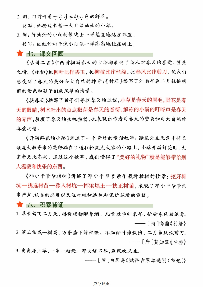 26年新版二年级下册语文单元知识清单.afa7fbf362dc230459b25390081309a0985文库29天前发布关注私信12.10MB16页1378826年新版二年级下册语文单元知识清单.afa7fbf362dc230459b25390081309a0此内容为付费资源,请付费后查看¥3 限时特惠¥5黄金会员免费钻石会员免费登录购买付费资源 开学季半价抢会员,享受免费下载 点击开通 文章目录 1 封面图 2 文档部分预览截图 3 下载地址 第1页 / 共16页 第2页 / 共16页 第3页 / 共16页 第4页 / 共16页 试读已结束,还剩12页,您可下载完整版后进行离线阅读 版权声明 1 本网站名称: 985文库 2 本站永久网址:https://985wenku.cn 3 本站资源部分来自网络,由老师收集整理,如有侵犯你的权益请联系管理员E-mail:240407401@qq.com 我们会第一时间进行审核删除。 开通网站会员,全站资料免费下载 THE END二年级资料 文本预览 第一单元知识清单☆一、易读错的字、多音字裁剪(cdi)化妆(zhuang)醉人(zu)趁机(chen)符合(f)遮遮掩掩(zhe)(a)你好啊!懊丧(sdng)(ā)啊,这里真美!正巧(qio)发挥(hui)啊(6)啊,你说什么?茁壮(zhu6)杜鹃(juan)绚丽(Xudn)(ǎ)啊,这是谁的呀?包裹(guǒ)漏水(Iòu)高龄(ling)(à)啊,伟大的祖国!兴致(zh)咨询(xdn)厕所(ce)★二、词语听写古诗碧玉化妆绿色丝带剪刀儿童回归春天寻找眉毛野花柳枝桃花冲走吐字见闻荡秋千鲜花先生原来大叔太太做客正巧惊奇快活美好礼物通往植树格外休息小心笔直姓邓满意场所剧本碧空如洗万里无云引人注目★三、近义词、反义词近义词:仔细一认真满意一满足惊奇一惊讶美好一美妙笔直一笔挺美丽一漂亮反义词:快活一难过奇怪一平常打开一关闭笔直一弯曲美好一丑恶仔细一粗心★四、词语搭配(快活)地蹦跳(精心)地挑选(美好)的礼物(满意)的笑容(绚丽多彩)的鲜花(五颜六色)的鲜花(碧绿)的田野(细长)的柳条(蔚蓝)的天空(温暖)的阳光(和煦)的微风(绿油油)的草坪★五、四字词语春风拂面梳妆打扮碧空如洗万里无云引人注目兴致勃勃躲躲藏藏叮叮咚咚点点嫩芽花朵簇簇☆六、句子仿写1.例:早开的野花一朵两朵,那是春天的眼睛吧?仿写:漫天五颜六色的风筝,那是春天的发卡吧?第1/16页 查看更多 收起部分 喜欢就支持一下吧点赞8 分享QQ空间微博QQ好友海报分享复制链接收藏