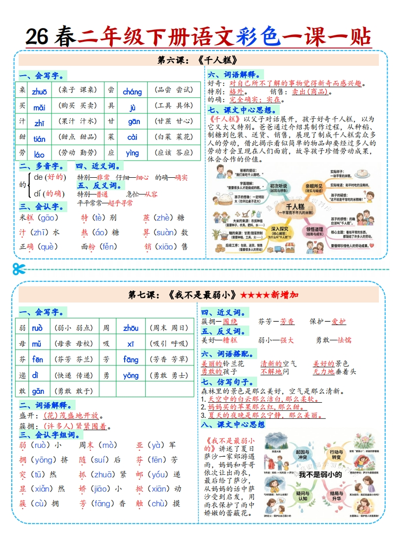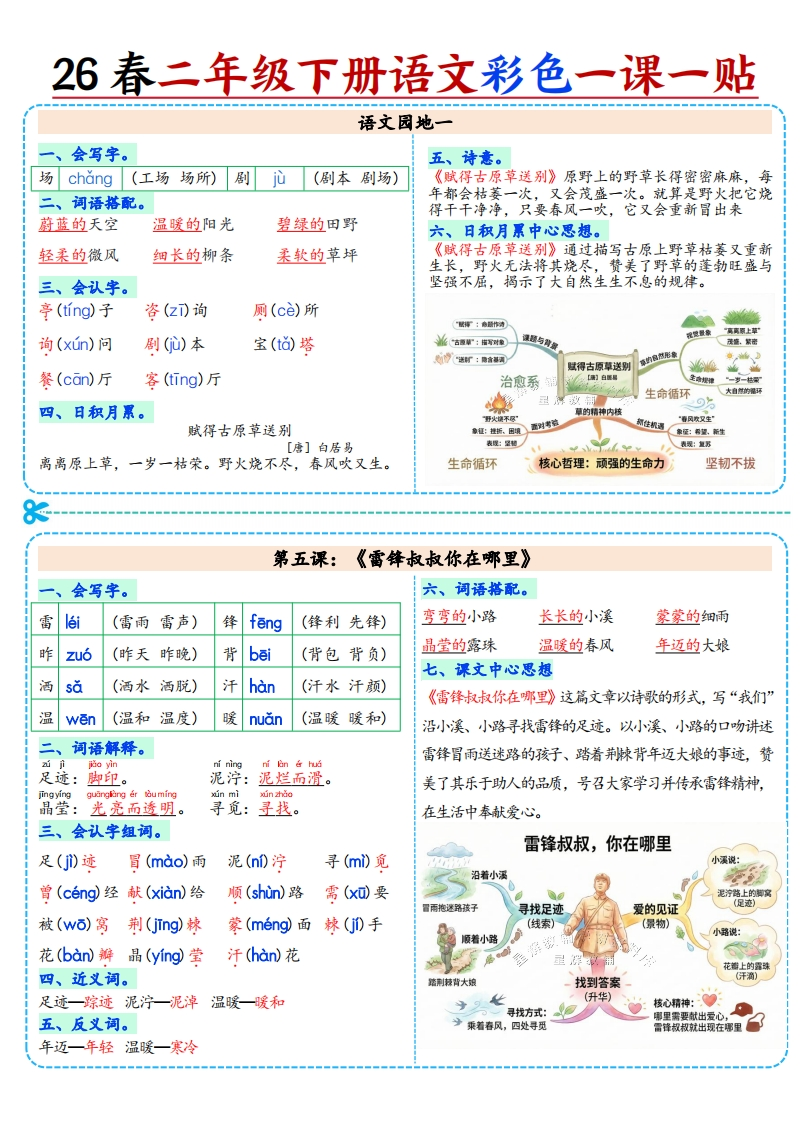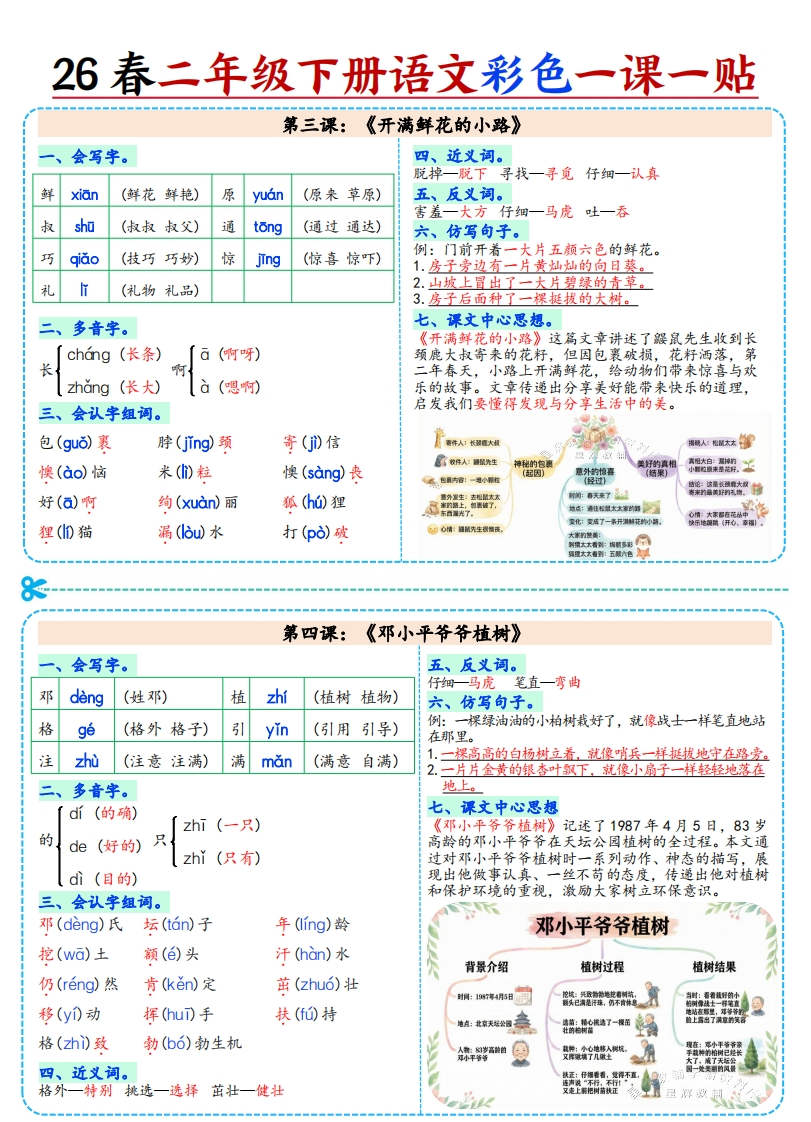26春二年级下册语文知识点总结课课贴带思维导图.26ed656d647b6ff3e941e48bdb4864d8985文库29天前发布关注私信9.78MB18页731726春二年级下册语文知识点总结课课贴带思维导图.26ed656d647b6ff3e941e48bdb4864d8此内容为付费资源,请付费后查看¥3 限时特惠¥5黄金会员免费钻石会员免费登录购买付费资源 开学季半价抢会员,享受免费下载 点击开通 文章目录 1 封面图 2 文档部分预览截图 3 下载地址 第1页 / 共18页 第2页 / 共18页 第3页 / 共18页 第4页 / 共18页 试读已结束,还剩14页,您可下载完整版后进行离线阅读 版权声明 1 本网站名称: 985文库 2 本站永久网址:https://985wenku.cn 3 本站资源部分来自网络,由老师收集整理,如有侵犯你的权益请联系管理员E-mail:240407401@qq.com 我们会第一时间进行审核删除。 开通网站会员,全站资料免费下载 THE END二年级资料 文本预览 26春二年级下册语文彩色一课一贴第一课:《古诗二首》会写字。《村居》青草生长、群莺飞舞的早春二月,柳条轻轻抚摸着提岸,仿佛陶醉在了春日的雾气之中。孩子们放诗shT(诗人诗句)碧6(碧绿碧玉)学后早早地回家,赶紧趁着春风放起一只只风筝。七、课文中心思想。妆zhuang(化妆梳妆)绿I0(绿色绿灯)《咏柳》是一首咏物诗,通过描写初春二月柳树在丝sT(丝带蚕丝)剪jian(剪刀剪发)春风中的迷人姿态,勾勒出了春天万物复苏、生机盎然的景象,表达了诗人对春天的喜爱与赞美之情。童tong(儿童童年)归gut(回归归还)《村居》通过刻画儿童放学归来放风筝的场景,描二、多音字。三、反义词。写了诗人在乡村居住时所见的春天景象以及孩童心(绿色)(绿草)放风筝的欢乐情景,展现了盎然春意和童真童趣,归来一离去绿表达了诗人对春天来临的喜悦和赞美之情。ù(绿林好汉)四、近义词。五、会认字。垂一坠落裁一剪归来一回来村居》《咏柳》歌咏(yng祝贺(h)化妆(huang)唐]贺如章轻拂(fO黄莺(yIng裁剪(c麻醉(zD河提(dD趁机(chen《村居》【清高需古诗二首《咏柳》唐]贸知章六、诗意。迷人春最写最巧岁比端(国棉到《咏柳》叶子像翠绿的玉石点缀整棵柳树,纤细的柳时间家围:二月无。春霜酬树艺体+整玉拉视一树高最:草长篱几。托常核域对比与共性千万条柳线+绿出绵垂下枝像无数条绿色丝带倒垂下来。不知道这又细又嫩的快乐儿童写人共司点The Sam)侧重点e0奇特想象(赞春风)叶子是谁裁剪出来的,原来是二月的春风,它就像一把剪刀一样。物:同体:界国信感:爱美春天州:国落比瑞:二月春风如期刀第二课:《找春天》会写字。六、仿写句子。冲chong(冲浪冲洗)寻xun(寻找寻常)我们看到了她,我们听到了她,我们闻到了她,我们触chù到了她。眉mei(眉头眉毛)吐tu(谈吐吐露)1.我们看见了风,我们听见了风。我们摸到了风,我们感受到了风。闻wen(新闻闻名)柳衍(柳树柳枝)2.我们看见了风我们听见了风。我们摸到了风。我们感受到了风。荡dang(摇荡回荡)桃táo(桃花桃树)七、课文中心思想《找春天》讲述了孩子们脱掉棉袄,奔向田野找春天二、多音字。三、近义词。的过程。作者以孩子的视角,用比喻、拟人的修辞手tǔ(谈吐)脱掉一脱下寻找一寻觅法展现了春天的生机,表达了对春天的喜爱,也传递仔细一认真出热爱生活、积极探索美好的态度。tù(呕吐)四、反义词。【心情急切:春天来了型比喻:餐个案羞的站湖候神库托害羞一大方仔细一马虎出发寻春天的印象-连电动作:点:培地鞋及:袖机五、会认字组词。找春天脱(tuō)掉袄(ǎo)子害羞(xi)看象小草(出→春天遮(zh)挡掩(yan)护探(tan)路仔细寻找找到了嫩(ndn)芽豆芽(y)符(f0)号在构技上瑞秋千)量年(健出点)三春天的音在只革尾已上罐国框在飘、城星(春天的琴解()救杜(d鹃杜鹃(juan花在桃花花头阅 查看更多 收起部分 喜欢就支持一下吧点赞7 分享QQ空间微博QQ好友海报分享复制链接收藏
