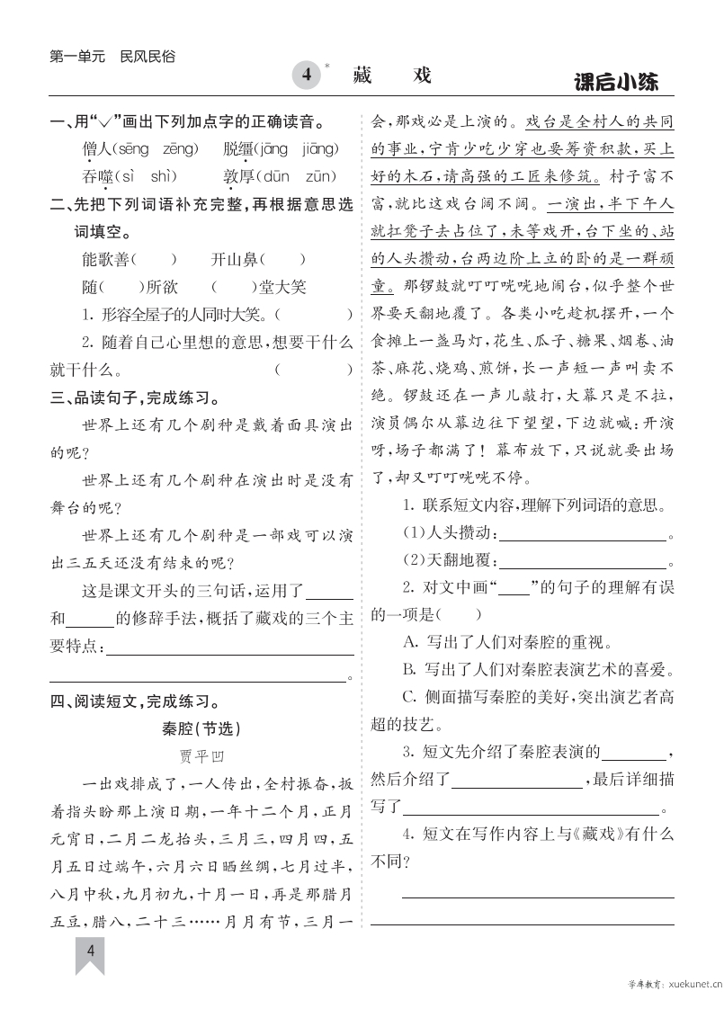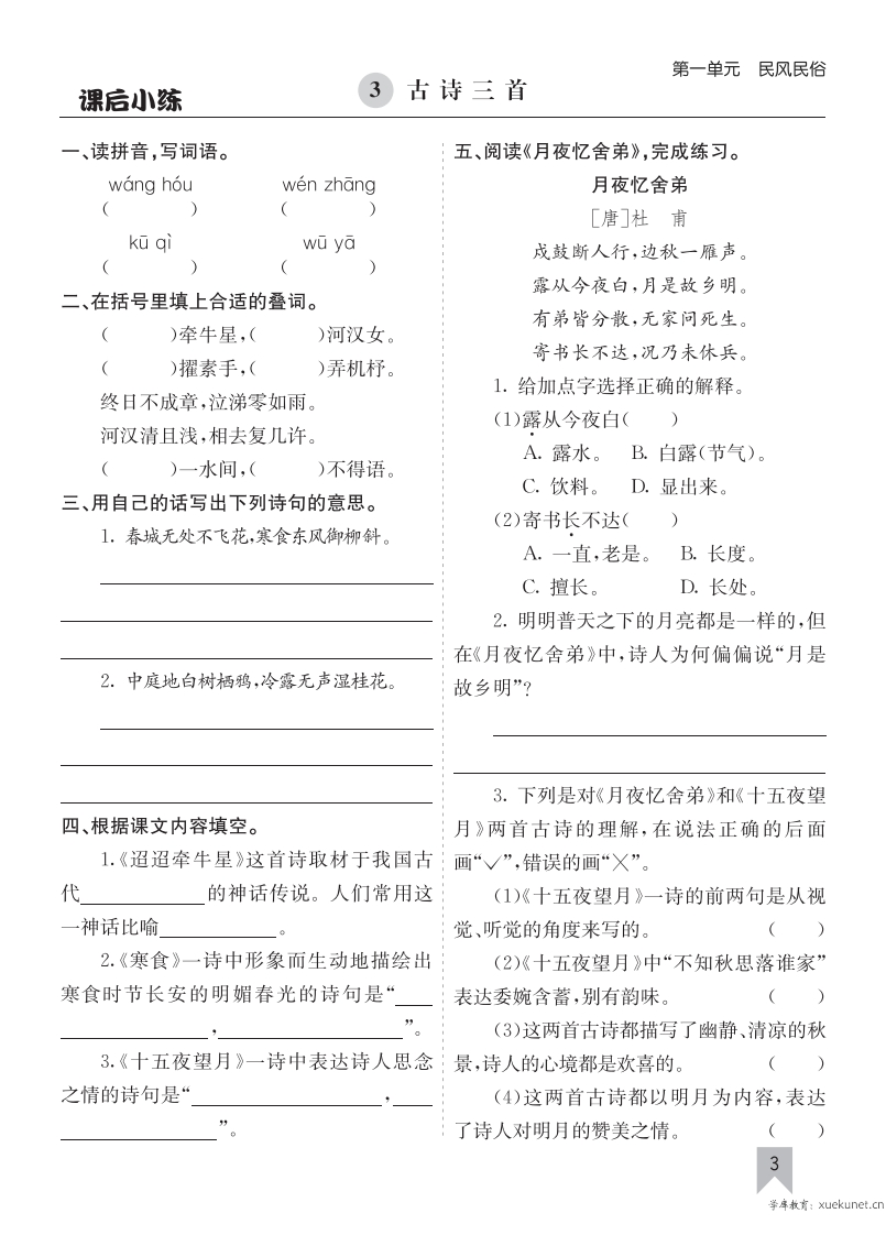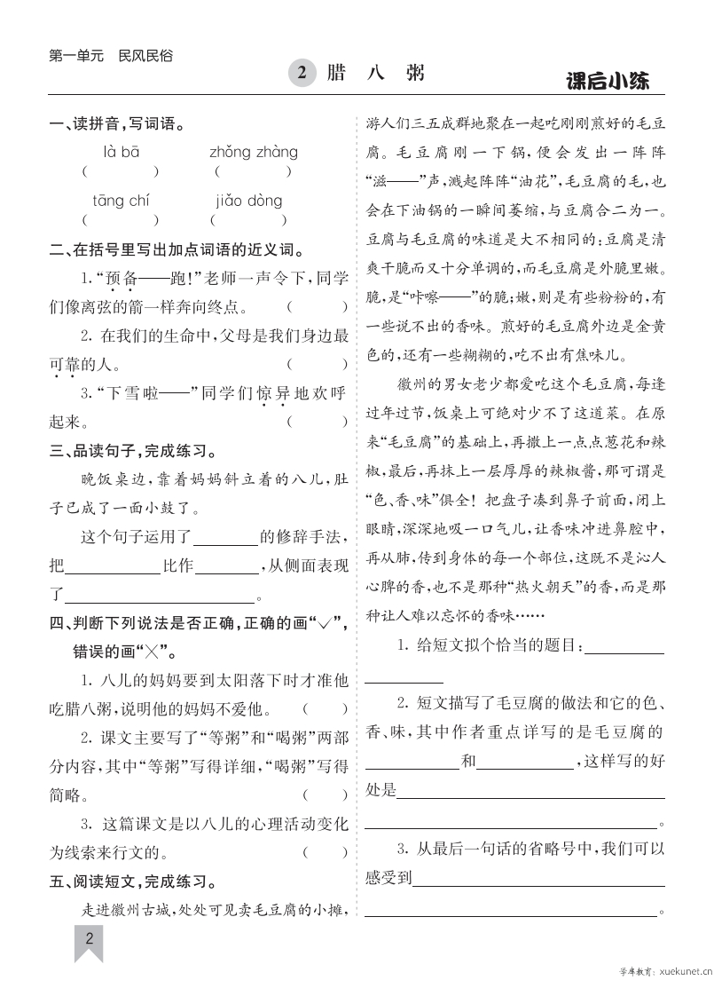 26春六年级下册语文同步课后练习含答案.5c91460166bc70499efcbfd18bd55710985文库29天前发布关注私信14.60MB30页7211126春六年级下册语文同步课后练习含答案.5c91460166bc70499efcbfd18bd55710此内容为付费资源,请付费后查看¥3 限时特惠¥5黄金会员免费钻石会员免费登录购买付费资源 开学季半价抢会员,享受免费下载 点击开通 文章目录 1 封面图 2 文档部分预览截图 3 下载地址 第1页 / 共30页 第2页 / 共30页 第3页 / 共30页 第4页 / 共30页 试读已结束,还剩26页,您可下载完整版后进行离线阅读 版权声明 1 本网站名称: 985文库 2 本站永久网址:https://985wenku.cn 3 本站资源部分来自网络,由老师收集整理,如有侵犯你的权益请联系管理员E-mail:240407401@qq.com 我们会第一时间进行审核删除。 开通网站会员,全站资料免费下载 THE END六年级资料 文本预览 第一单元民风民俗课后小练1北京的春节一、下列加点字读音相同的一项是()。中最隆重的传统节日。在节气中大年初一A.店铺商铺铺张浪费这一天也称元日,也就是过年。北方人都会B.时间房间刹那间包饺子以贺春节,饺子内还要包上一些钱C.正月正好义正辞严物,吃到的人在今年就会有格外好的运气。D.观看美观白云观南方人则吃年糕,取的是“年年高兴、年年高二、读拼音,写词语。升”的吉祥之意。春节之时,亲朋好友还要chi cujiǎozi互相拜年,吃年节酒。这个习俗古已有之,)(《法苑珠林》中提到,唐朝时,长安城内“每至zha yanIuòtuo元日以后,遂饮酒相邀迎,号‘传座酒”。古三、照样子,用加点词语写句子。人在大年初一时还会喝屠苏酒、柏味酒、椒有名的老铺都要挂出几百盏灯来:有的华酒以贺新年,取吉避邪。一律是玻璃的,有的清一色是牛角的,有的都正月十五元宵节,除了看花灯、猜谜语是纱灯;有的通通彩绘《红楼梦》或《水浒传》等节日活动外,吃汤圆是万万不能少的。汤故事,有的图案各式各样。圆是在南方的称呼,在北方多称元宵。相传吃汤圆始于春秋时期,宋代时已经称其为“圆子”“团子”,取“团团圆圆”之意。流传甚广的民谣《卖汤圆》,“吃了汤圆好团圆”,这四、根据课文内容填空。对中国人来说是最吉祥美好的祝福了。课文通过写1.根据短文内容,填写表格。这北京春节期间的三个高潮,生动节日饮食风俗寄托的希望和情怀大年初一,北方人包饺地描绘了过年时热闹的场景。子,饺子里包一些钱物五、阅读短文,完成练习。正月十五吃汤圆岁时的寄托(节选)2.春节时,北方人、南方人和古人分别中国人对春天有着深厚的感情,春季的有什么习俗?节日也格外多,如春节、元宵节、寒食节、清北方人:明节等。人们对春天的希望,对人生的畅想南方人:全在这些岁令时节中淋漓尽致地表达出来。古人:」春节是农历的大年初一,是中国一年之学库教育:xuekunet.cn 查看更多 收起部分 喜欢就支持一下吧点赞11 分享QQ空间微博QQ好友海报分享复制链接收藏