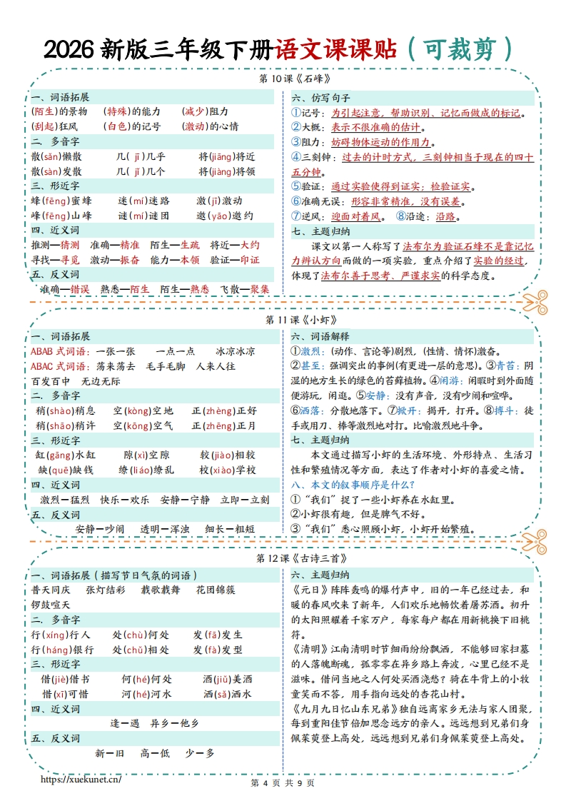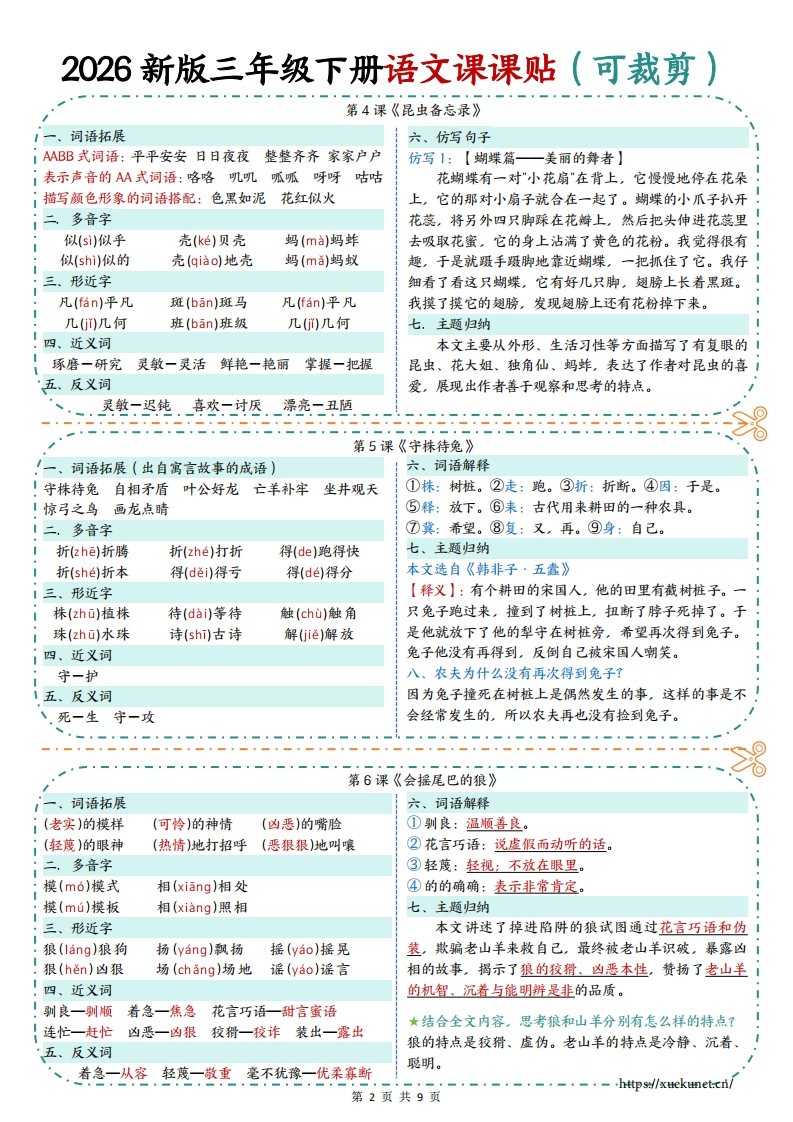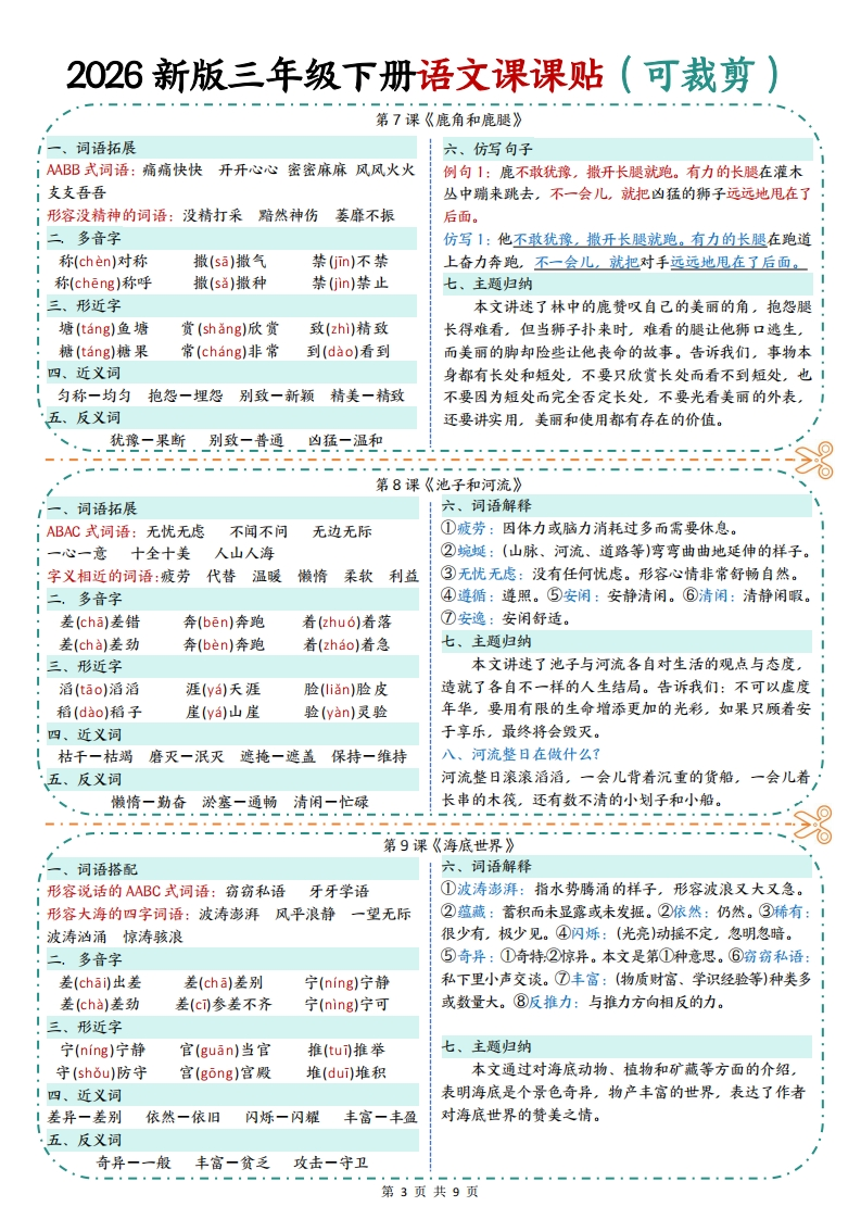 26春新版三年级下册语文课课贴9页彩色版.c3eb1cdf828729e4e0d14fba91ba5c82985文库29天前发布关注私信0.81MB9页8521026春新版三年级下册语文课课贴9页彩色版.c3eb1cdf828729e4e0d14fba91ba5c82此内容为付费资源,请付费后查看¥3 限时特惠¥5黄金会员免费钻石会员免费登录购买付费资源 开学季半价抢会员,享受免费下载 点击开通 文章目录 1 封面图 2 文档部分预览截图 3 下载地址 第1页 / 共9页 第2页 / 共9页 第3页 / 共9页 第4页 / 共9页 试读已结束,还剩5页,您可下载完整版后进行离线阅读 版权声明 1 本网站名称: 985文库 2 本站永久网址:https://985wenku.cn 3 本站资源部分来自网络,由老师收集整理,如有侵犯你的权益请联系管理员E-mail:240407401@qq.com 我们会第一时间进行审核删除。 开通网站会员,全站资料免费下载 THE END三年级资料 文本预览 2026新版三年级下册语文课课贴(可裁剪)第1课《古诗三首》一、词语拓展六、词语解释春暖花开风和日丽春光明媚春意盎然春光无限①迟日:春日。②泥融:这里指泥士变湿软。春深似海和风细雨鸟语花香春风拂面莺歌燕舞③萎蒿:多年生草本植物,叶子可以做艾的代用品。二,多音字④芦芽:芦苇的嫩芽。⑤河豚:一种肉味鲜美的鱼,有尽in)尽量行(hang)银行燕(yan)燕子毒性。⑥三衢:地名,在今浙江衢州一带。尽Gin)尽力行(xing)行动燕(yan)燕国七、主题归纳三、形近字《绝句》的作者是唐代诗人杜甫。全诗描绘了一幅融(rong)融化鸳(yuan)鸳鸯芦(ú)芦芽春日美景图,表达了诗人对春天的喜爱之情。隔(gé)隔壁怨(yuan)怨恨庐ú)庐山《惠崇春江晚景》是题画诗。作者是宋代诗人苏·四、近义词轼。诗中再现了画中江南早春的景色,抒发了诗人对早添一增减一少满一遍尽一完融一溶欲一想春美景的喜爱、赞美之情。五、反义词《三衢道中》的作者是宋代诗人曾几。诗中展现的增一减暖一冷迟一早阴一晴香一臭短一长是初夏的宜人风光,表达了作者舒畅、愉悦的心情。外一内(里)晚一早。。。。。。第2课《燕子》一、词语搭配六、仿写句子i(剪刀似)的尾巴(伶俐可爱)的小燕子(光彩夺目)的图画例句1:一身乌黑的羽毛,一对轻快有力的翅膀。加上剪刀i(旷亮无比)的天空(烂漫无比)的春天(光辉灿烂)的明天似的尾巴,凑成了那样可爱的活泼的小燕子。(波光粼粼)的湖面(五光十色)的烟花仿写1:一身棕色的皮毛,四条细长的腿,加上左顾右盼的二,多音字小脑袋,凑成了那样调皮的可爱的小狗。似(sh)似的着(zho)着急圈juan)圈养仿写2:一身雪白的绒毛,一对尖尖的耳朵,加上长长的尾1似(s)相似着(zhe)等着圈(quan)圈养巴,凑成了那样聪明又警觉的小猫。形近字仿写3:一身漂亮的羽毛,一顶火红的鸡冠,加上一个高高ⅰ拂(fú)吹拂沾(zhan)沾水痕(hén)水痕昂起的头,凑成了一只骄傲的大公鸡。佛(f6)佛像站(zhan)车站很(hěn)很好七、主题归纳四、近义词本文写了活泼可爱的小燕子为如诗如画般的春天带活泼一开朗聚拢一聚集平添一增添偶尔一偶然来了无限的生机,表达了作者对小燕子和大自然的热爱五、反义词之情。乌黑一雪白伶俐一笨拙轻快一笨重。。。第3课《荷花》1一、词语拓展六、仿写句子iAABB式词语:挨挨挤挤星星点点偷偷摸摸例句1:荷叶挨挨挤挤的,像一个个碧绿的大圆盘。iAABC式词语:翩翩起舞炯炯有神依依不舍仿写1:太阳火火辣辣的,像一个个大火球。量词搭配:一(阵)清香一(朵)荷花一(条)小鱼例句2:白荷花在这些大圆盘之间冒出来。有的才展开两三二,多音字片花瓣儿,有的花瓣儿全展开了,露出嫩黄色的小莲蓬,有!挨(ai)挨近佛(fú)仿佛骨(g)花骨朵儿的还是花骨朵儿,看起来饱胀得马上要破裂似的。挨(i)挨冻佛(f6)佛祖骨(g心)骨气仿写1:微风送来了菊花的清香远远望去菊花已经开了不少形近字了。有的舒展着细长的花瓣像在随风舞蹈。有的昂着头向「姿(2i)姿势仿(ǎng)仿佛人们展开美丽的笑容。有的三五成群仿佛在商量着什么。资(zi)资产访(ng)访问七、主题归纳四、近义词课文描写了作者夏日里去公园,被一池荷花盛开时仿佛一好像姿势一姿态雪白一洁白赶紧一赶快的景象吸引,而沉浸在其中,仿佛与荷花融为一体的感五、反义词受,表达了作者对荷花的赞美和对大自然的热爱之情。·、·一展开二合拢-雪白二乌黑停止二继续第1页共9页 查看更多 收起部分 喜欢就支持一下吧点赞10 分享QQ空间微博QQ好友海报分享复制链接收藏