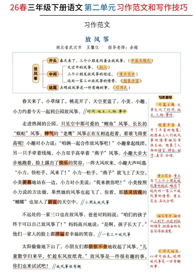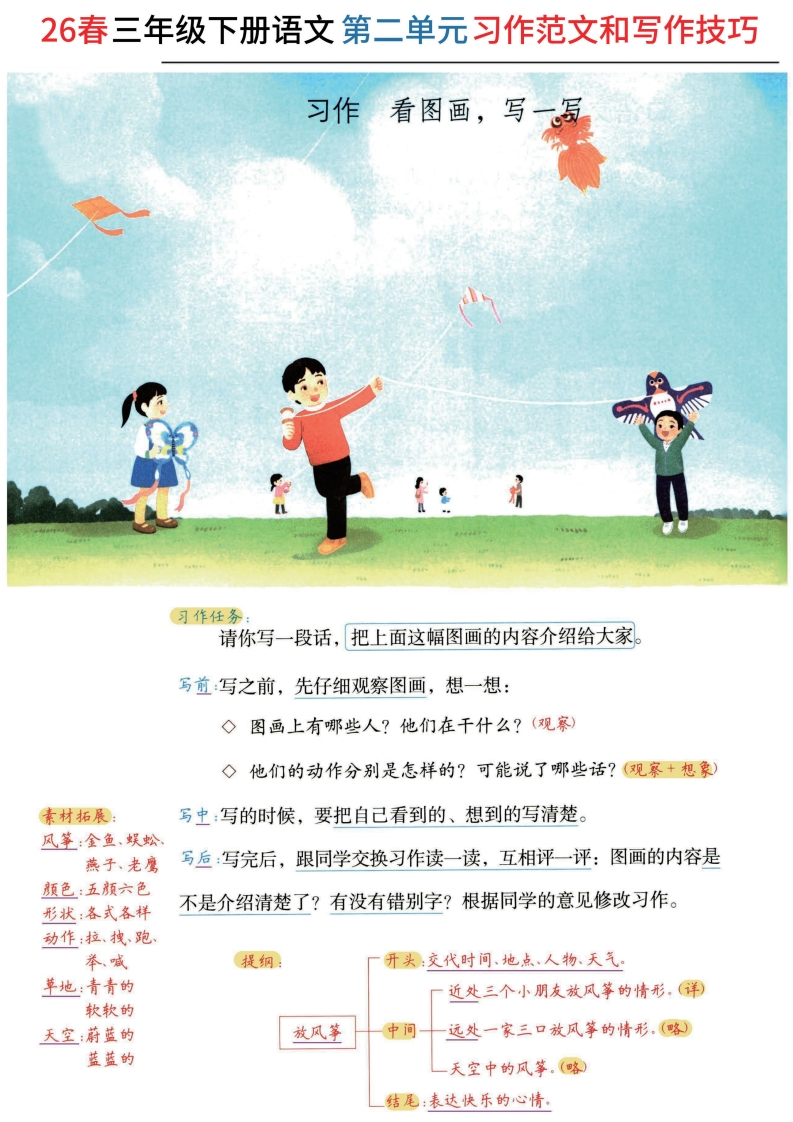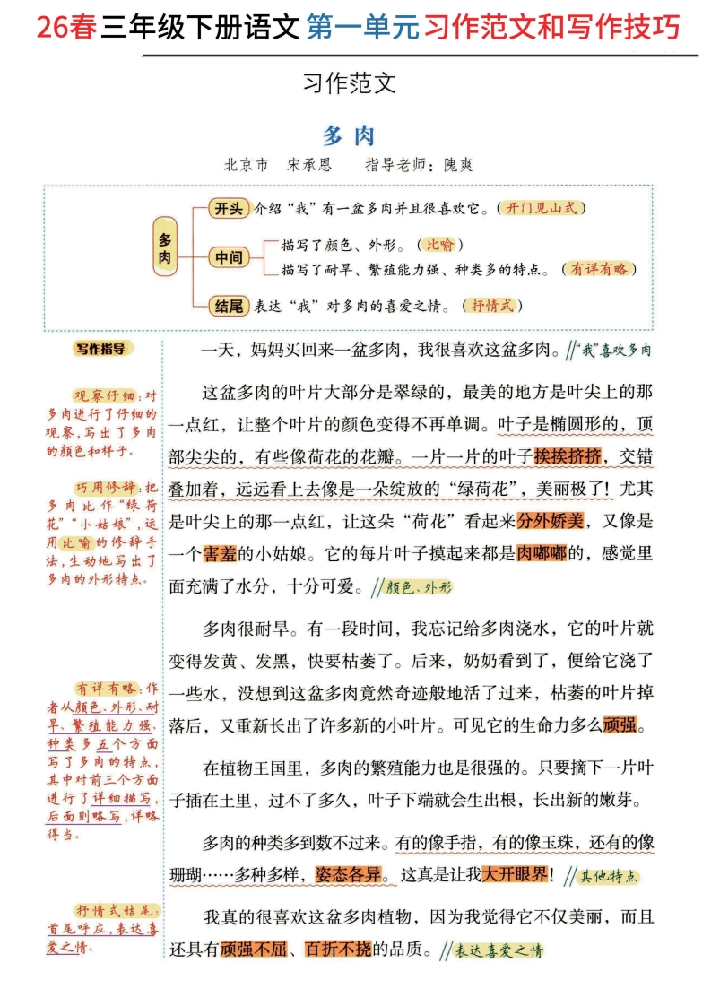 26春三年级下册语文1-8单元《习作范文及技巧点拨》.f903709c2b91da5da0ad661953aa89f0985文库29天前发布关注私信24.37MB16页964526春三年级下册语文1-8单元《习作范文及技巧点拨》.f903709c2b91da5da0ad661953aa89f0此内容为付费资源,请付费后查看¥3 限时特惠¥5黄金会员免费钻石会员免费登录购买付费资源 开学季半价抢会员,享受免费下载 点击开通 文章目录 1 封面图 2 文档部分预览截图 3 下载地址 第1页 / 共16页 第2页 / 共16页 第3页 / 共16页 第4页 / 共16页 试读已结束,还剩12页,您可下载完整版后进行离线阅读 版权声明 1 本网站名称: 985文库 2 本站永久网址:https://985wenku.cn 3 本站资源部分来自网络,由老师收集整理,如有侵犯你的权益请联系管理员E-mail:240407401@qq.com 我们会第一时间进行审核删除。 开通网站会员,全站资料免费下载 THE END三年级资料 文本预览 26春三年级下册语文第一单元习作范文和写作技巧习作我的植物朋友观察→记录→写作春天到了,到处都生机勃勃。让我们选择一种植物,走近它,了解它,和它交朋友。可以写生活中常见的植物,照样子,为自己的植物朋友做个记录卡吧。如蝴蝶兰、文竹、绿萝等.记录卡:图配文的方式名称:桃花记录卡:样子:花骨朵儿胀鼓鼓的。已经绽放的花朵,一L.记录要及时。2.内容根据植物的个花瓣儿挨着一个花瓣儿,围成圆形。特点灵活安排。颜色:粉红3.用关键词或简短气味:淡淡的清香的句子记录4.适当记录观察时其他:春天开放,结出的果实就是桃子。也有只的感受开花不结果的观赏桃花。颜色还有鲜红的、纯白的。不一定是亲自观察到的,可以联系生活经验或查闷资料来补充记录。借助记录卡,写一写你的植物朋友,让更多的人了解它。写前写之前再去观察一下,看一看,摸一摸,闻一闻…也许你会有新的发现。写中:写的时候,试着把你观察和感受到的写清楚。写后:写完后,把自己的习作读给同学听。写同一种植物的同学还可以一起交流。构思(借助记录卡完成习作:中间:植物的特点)(开头)看(颜色、形态、动静…)】(结尾:写出自己的感受)介绍植物的生活摸(光滑、粗糙、有刺…)抒发喜爱之情环境植物名闻(花香、青草味…)想(结出果实、美化家国】 查看更多 收起部分 喜欢就支持一下吧点赞5 分享QQ空间微博QQ好友海报分享复制链接收藏