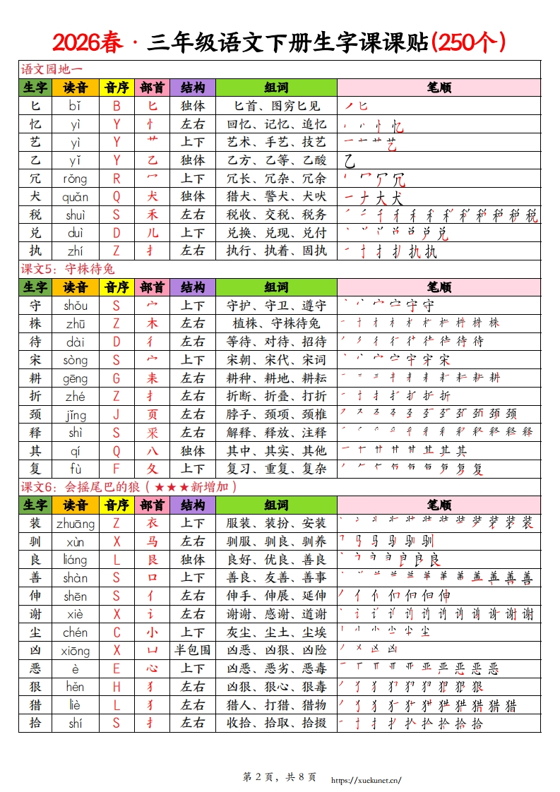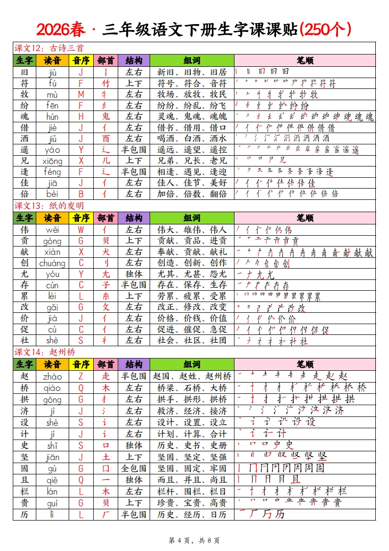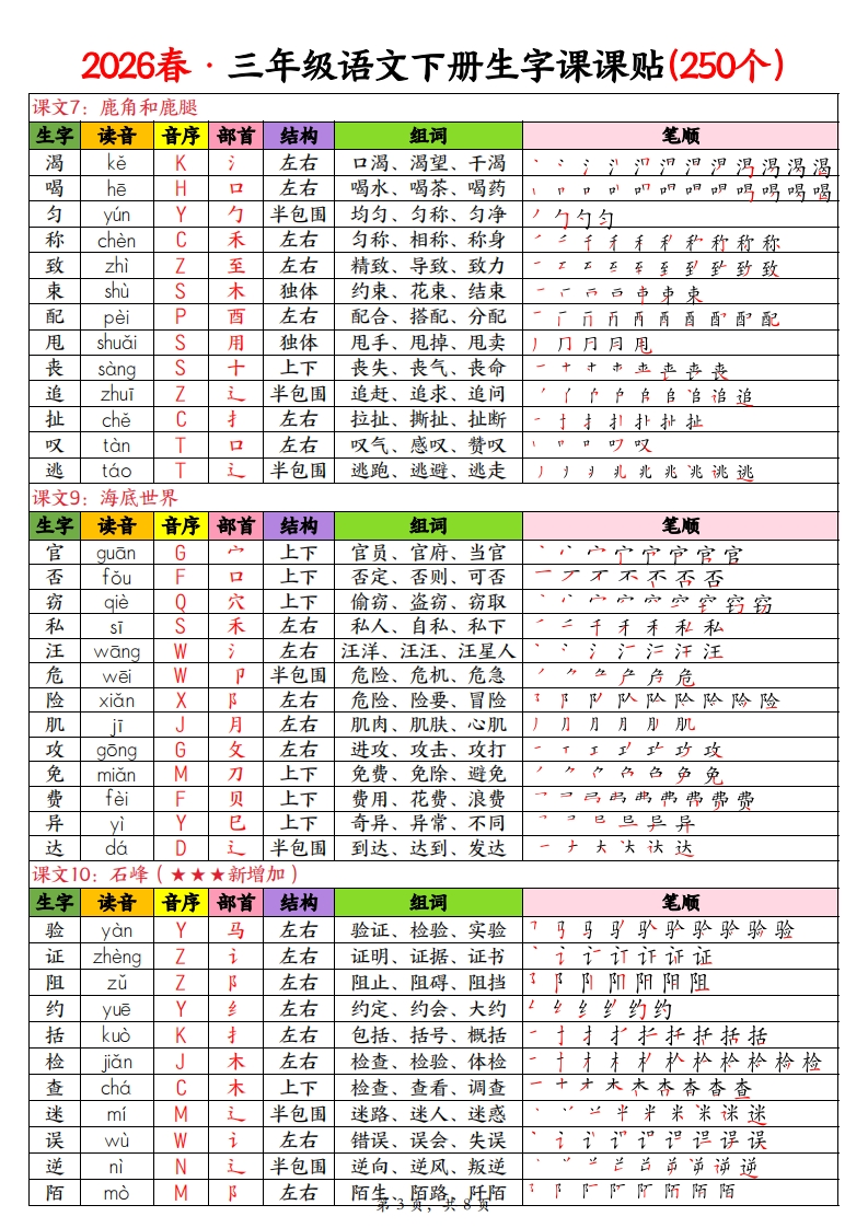 2026春三年级下册语文生字表课课贴含笔顺、组词(250字).9eab90e082e7cc00fe586125ea12176b985文库29天前发布关注私信3.37MB8页1044102026春三年级下册语文生字表课课贴含笔顺、组词(250字).9eab90e082e7cc00fe586125ea12176b此内容为付费资源,请付费后查看¥3 限时特惠¥5黄金会员免费钻石会员免费登录购买付费资源已售 2 开学季半价抢会员,享受免费下载 点击开通 文章目录 1 封面图 2 文档部分预览截图 3 下载地址 第1页 / 共8页 第2页 / 共8页 第3页 / 共8页 第4页 / 共8页 试读已结束,还剩4页,您可下载完整版后进行离线阅读 版权声明 1 本网站名称: 985文库 2 本站永久网址:https://985wenku.cn 3 本站资源部分来自网络,由老师收集整理,如有侵犯你的权益请联系管理员E-mail:240407401@qq.com 我们会第一时间进行审核删除。 开通网站会员,全站资料免费下载 THE END三年级资料 文本预览 2026春·三年级语文下册生字课课贴(250个)课文1:古诗三首生字读音音序部首结构组词笔顺融rongR虫左右融化、融合、消融后戶月月高高爵爵即融融融燕yan上下燕子、燕窝、飞燕世甘甘甘甘封#燕抗燕燕燕鸳yuan鸟上下驾鸯锷鸳鸯yangY鸟上下鸳鸯海鸯鸯惠huiH心上下优惠、恩惠、惠顾市市由由惠惠惠崇chongC山上下崇高、崇拜、崇敬出出出学岸崇芽yaY+上下发芽、嫩芽、麦芽芒苹芽梅meiM木左右梅花、梅子、腊梅扩扩杜梅梅梅梅泛fan左右广泛、泛滥、泛舟减jian左右减少、减法、减轻源减减减课文2:燕子生字读音音序部首结构组词笔顺凑couC左右凑合、凑数、凑齐江决决法港凑凑泼poP左右泼水、活泼、泼洒氵产沙涉泼泼集j住上下集合、集体、收集住隼集集偶ou0左右偶尔、偶然、偶像才个加何但但侣偶偶偶尔ěrE小独体偶尔、尔后、尔等一个尔尔沾zhanZ氵左右沾水、沾边、沾湿氵洲汁沙沾沾闲xianX门半包围清闲、空闲、休闲广门闩问闭闲纤xianX左右纤细、纤弱、纤巧1乡多纩华纤杆ganG木左右旗杆、标杆、栏杆十才木杆课文3:荷花生字读音音序部首结构组词笔顺荷heH+上下荷花、荷叶、荷塘一艹产产花花荐荐荷挨aiA左右挨着、挨近、挨边收收竖竖坚紧紧紧jin糸上下紧张、紧密、赶紧扌并井护护拦指挨蓬pengP艹上下莲蓬、蓬松、蓬乱“中芳艾芝客茎茎筝蓬蓬胀zhangZ月左右膨胀、发胀、肿胀月月月'肚胀胀裂èL衣上下裂开、破裂、分裂万列列列烈型裂翠裂势shi力上下势力、形势、趋势于扌扎执执势势微weiW左中右微小、细微、微笑代程得得微微记左右记忆、记住、笔记讠订记记第1页,共8页 查看更多 收起部分 喜欢就支持一下吧点赞10 分享QQ空间微博QQ好友海报分享复制链接收藏