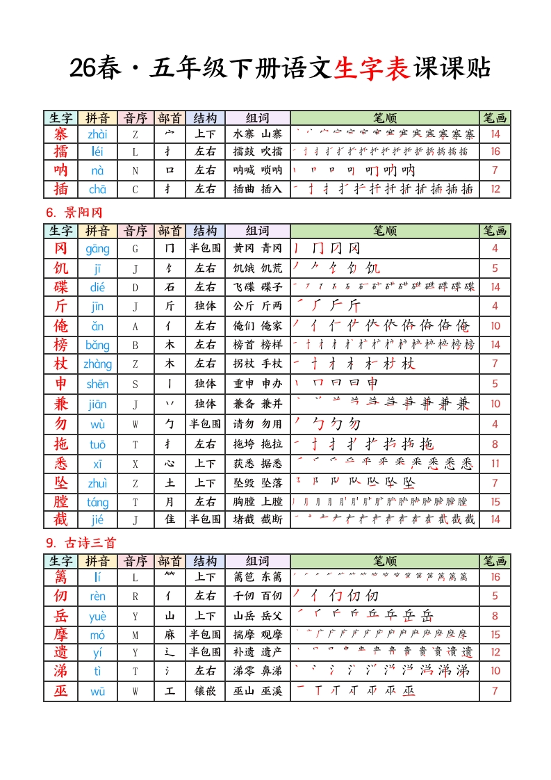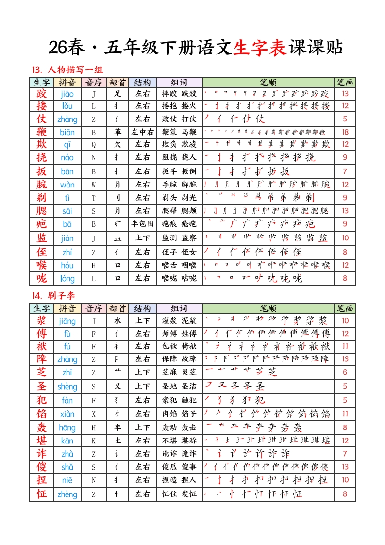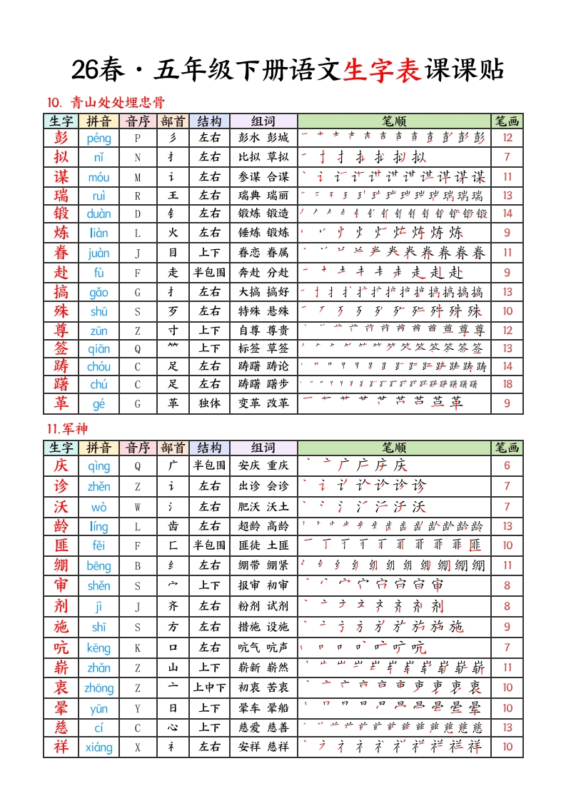 26春语文五下生字课课贴.6dd40d271553a69a191a2ae89f8a0040985文库29天前发布关注私信3.64MB7页778826春语文五下生字课课贴.6dd40d271553a69a191a2ae89f8a0040此内容为付费资源,请付费后查看¥3 限时特惠¥5黄金会员免费钻石会员免费登录购买付费资源 开学季半价抢会员,享受免费下载 点击开通 文章目录 1 封面图 2 文档部分预览截图 3 下载地址 第1页 / 共7页 第2页 / 共7页 第3页 / 共7页 第4页 / 共7页 试读已结束,还剩3页,您可下载完整版后进行离线阅读 版权声明 1 本网站名称: 985文库 2 本站永久网址:https://985wenku.cn 3 本站资源部分来自网络,由老师收集整理,如有侵犯你的权益请联系管理员E-mail:240407401@qq.com 我们会第一时间进行审核删除。 开通网站会员,全站资料免费下载 THE END五年级资料 文本预览 26春·五年级下册语文生字表课课贴1.古诗三首生字拼音音序部首结构组词笔顺笔画昼zhouZ上下白昼昼夜”尸尺尺尽斥昼昼9耘yunY耒左右耕耘夏耘丰丰老耘耘10桑sang木上下沧桑蚕桑予五五桑桑桑10晓xiǎoX日左右分晓拂晓旷贼脑晓晓102.祖父的园子生字拼音音序部首结构组词笔顺笔画蝴huH虫左右蝴蝶蝴蝶花虫虫址封琳站均蝴蝴蝴15蚱zhàZ虫左右蚂蚱蚱蜢中虫虹蚧蚧蚱11嗡wengW口左右嗡嗡嗡子叭哈哈哈咛啥嗡嗡嗡13樱yingY木左右樱桃樱花于才才和和样槽抑柳棚樱樱樱15榆yuY木左右榆树榆林十才利护护检检榆榆榆榆13拔báB寺左右拔高拔尖于打扩抄拔拔8瞎xiaX目左右瞎说瞎闹Ⅱ巾日日官旷护时腔腔晾瞎瞎15铲chanC左右铲除铲地车钅铲铲铲铲11锄chuC全左右锄禾锄头上上专车有氧氧氧知翻锄12割geG左右分割割除宫宝宝害害割12拴shuan左右拴住拴上寸才扎扑抄拎拎拴9瓢piaoP瓜左右瓢虫水瓢节币雨西更季手票季别瓢瓢瓢16逛guangG半包围游逛逛街才犭茅狂狂狂诳逛105.草船借箭生字拼音音序部首结构组词笔顺笔画妒duD女左右嫉妒妒忌女女女炉妒7忌J心上下顾忌忌讳己己尼忌忌7曹caoC日上下曹操曹公曲曹曹曹11督duD目上下督促督导知权权督督督督13委weiW禾上下部委常委禾天委委8鲁1心L鱼上下粗鲁鲁莽角鱼鱼单鲁鲁鲁12遮zheZ半包围遮蔽遮挡广户序麻府府府府庶底斌遮14漆qiQ左右喷漆漆黑氵汁沐沙淡沐漆漆漆14疑yiY匕左右猜疑迟疑“卢:旦车莫墅野鞣霸疑14惑huoH心上下惶惑惑众式或或或惑惑惑12 查看更多 收起部分 喜欢就支持一下吧点赞8 分享QQ空间微博QQ好友海报分享复制链接收藏