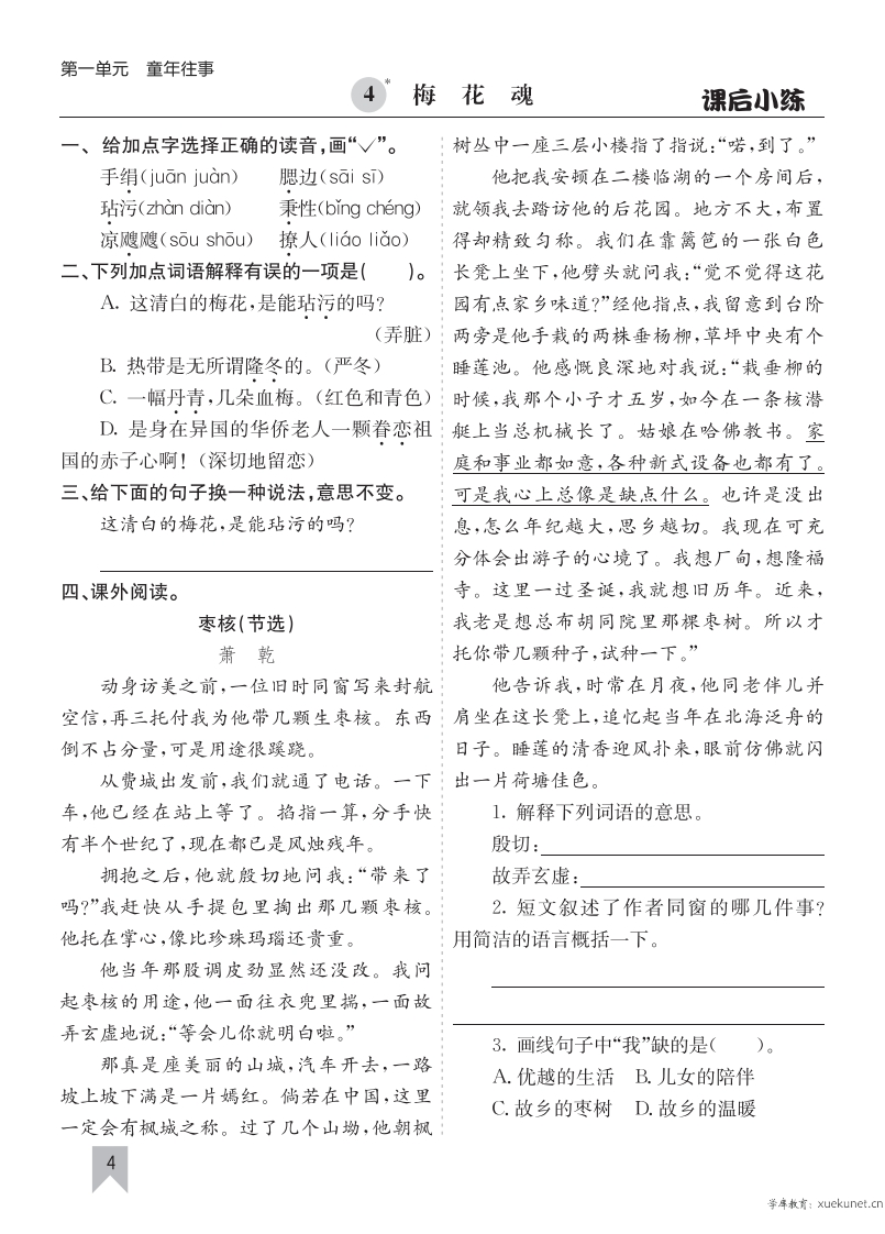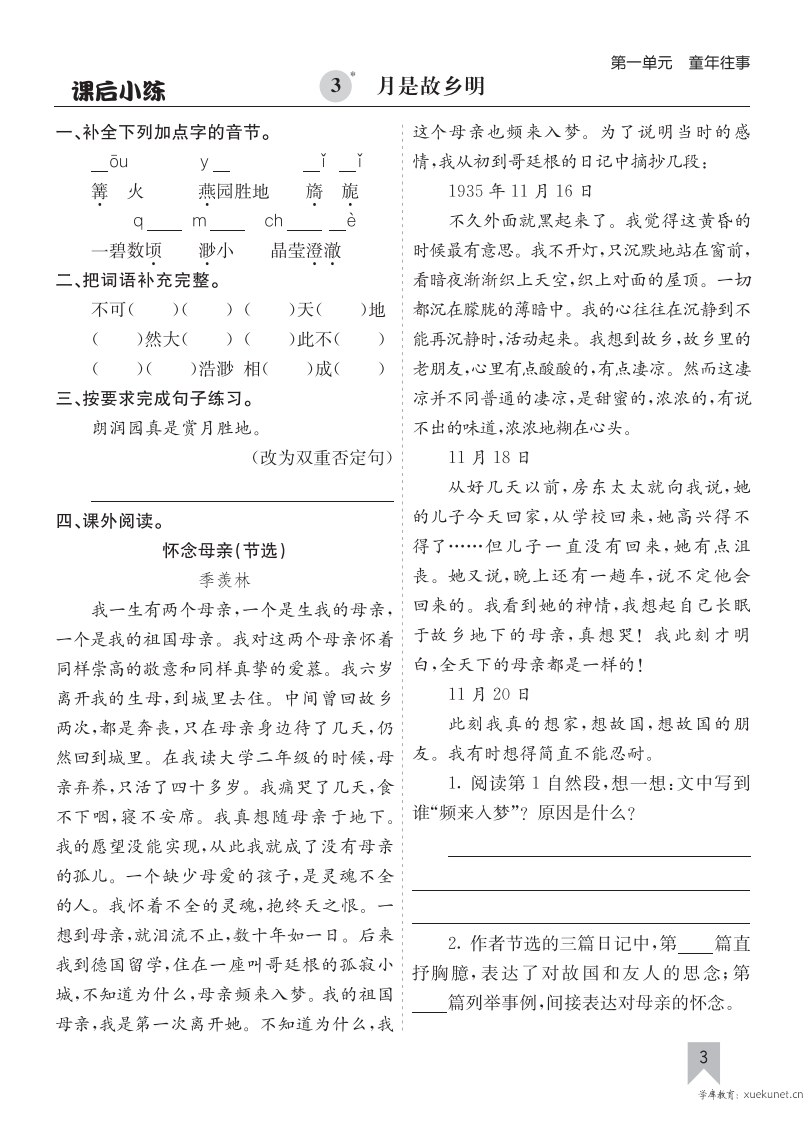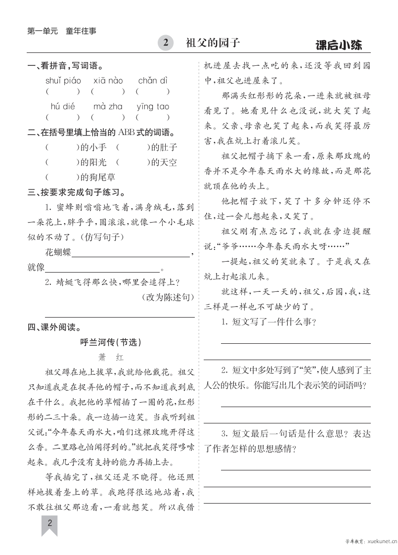 26春五年级下册语文同步课后练习含答案.b23cb0ee43788dd7e6207de8fe0be77a985文库29天前发布关注私信17.37MB37页1261926春五年级下册语文同步课后练习含答案.b23cb0ee43788dd7e6207de8fe0be77a此内容为付费资源,请付费后查看¥3 限时特惠¥5黄金会员免费钻石会员免费登录购买付费资源 开学季半价抢会员,享受免费下载 点击开通 文章目录 1 封面图 2 文档部分预览截图 3 下载地址 第1页 / 共37页 第2页 / 共37页 第3页 / 共37页 第4页 / 共37页 试读已结束,还剩33页,您可下载完整版后进行离线阅读 版权声明 1 本网站名称: 985文库 2 本站永久网址:https://985wenku.cn 3 本站资源部分来自网络,由老师收集整理,如有侵犯你的权益请联系管理员E-mail:240407401@qq.com 我们会第一时间进行审核删除。 开通网站会员,全站资料免费下载 THE END五年级资料 文本预览 第一单元童年往事课后小练古诗三首一、看拼音,写汉字。2.宋代杨万里的《稚子弄冰》,诗题直接zhòuyun揭示了古诗的主要内容,刻画出儿童无忧无()夜耕(虑、天真烂漫的性格。()xiaosang3.《田时田园杂兴(其三十一)》《稚子弄知())树冰》《村晚》这三首古诗都描写了古代乡村中二、多音字组词。供/9ong(的儿童生活。(heng(横五、课外阅读。gòng(heng()观刈”麦(节选)三、给加点的字词选择正确的解释,并说说你田家少闲月,五月人倍忙。眼前浮现出怎样的情景。夜来南风起,小麦覆陇②黄。1.牧童归去横牛背,短笛无腔信口吹。归去()①归还。②回去。妇姑③荷箪食④,童稚携壶浆⑤。相随饷田⑤去,丁壮在南冈。信口()①随口。②口信。情景:【注释】①刈(y):割。②陇:同“垄”,指农田中种植作物的土埂,这里泛指麦地。③妇姑:媳妇和婆婆,这里泛指妇女。④荷箪食:担着用竹篮盛的饭。荷,背负,肩担。箪食,装在竹篮里的饭食。⑤浆:古代一种2.稚子金盆脱晓冰,彩丝穿取当银钲。略带酸味的饮品,有时也可以指米酒或汤。稚子()①幼苗。⑥饷(Xiǎng)田:给在田里劳动的人送饭。②幼小的孩子。1.这首诗的作者是唐代诗人白居易,钲()①一种金属打击乐器。我们还学过他的诗词《》《②金属撞击的声音。》情景:2.这首诗描写的季节是,诗中最能体现这一季节的两句诗是“”。四、判断下列说法的正误,正确的画“√”,错3.“夜来南风起,小麦覆陇黄”两句诗描误的画“X”。绘了怎样的画面?请用自己的语言加以1.《四时田园杂兴(其三十一)》用朴实描述。的语言展现了农家春天农忙时劳动的场景,表现了农村儿童的天真可爱。学库育:xuekunet.cn 查看更多 收起部分 喜欢就支持一下吧点赞9 分享QQ空间微博QQ好友海报分享复制链接收藏
