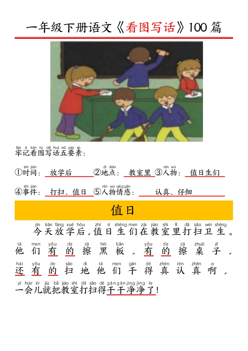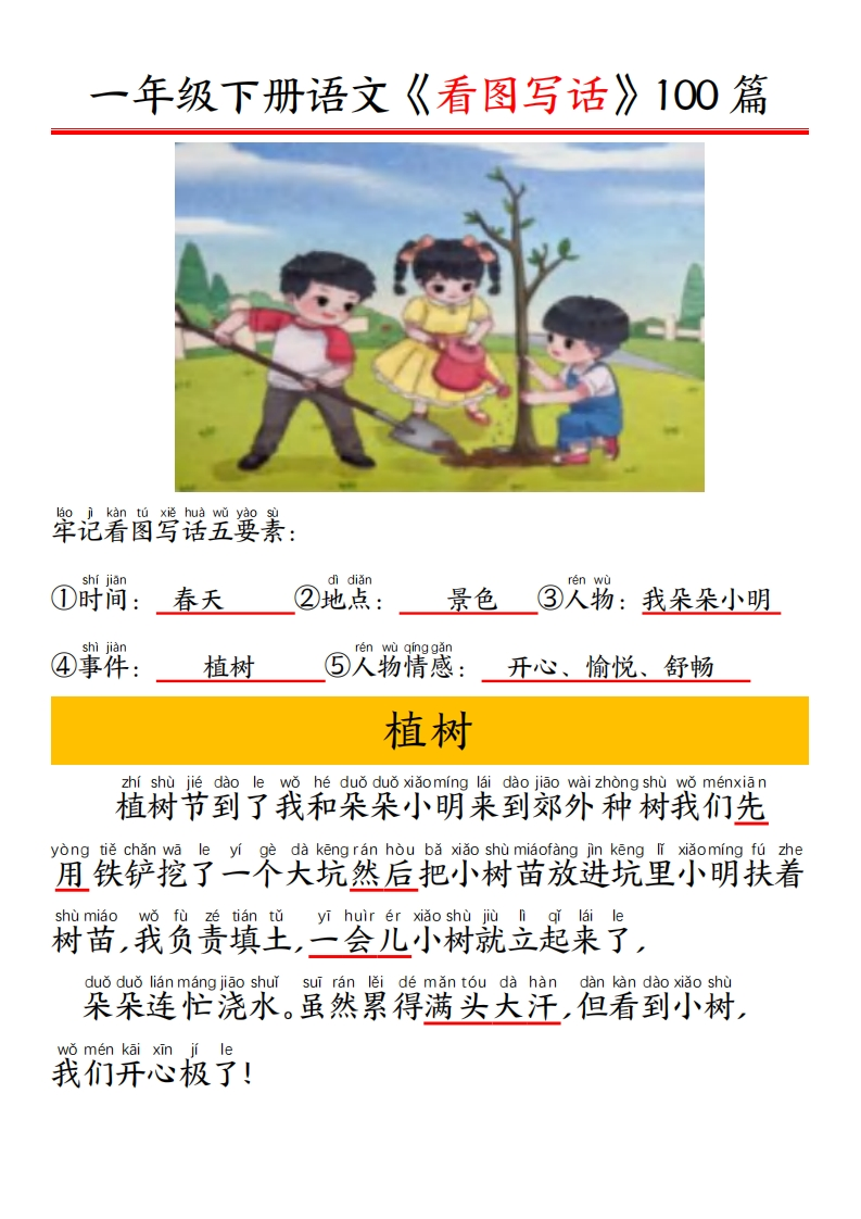 一年级下册语文《看图写话》100篇lao j kan tu xi径huaw心yaos0牢记看图写话五要素:shi jiandi dian①时间:春天②地点:花园中③穴物:小朋友们shi jianren wu qing gan④事件:放风筝④人物情感:开心、愉快放风筝chan gūniang mai zhe qingying de bùZimanman zǒulai春姑娘迈着轻盈的步子,慢慢走来。拂关宁寒冷,带来宁温暖,微微的春风吹拂着树苗。dai lai le wennuan wei wei de chunfengchui fu zhe shu miaoxiaopeng you men na zhe zi j de fengzheng lai dao hua yuanzhongfangfengzheng小朋友们拿着自己的风筝来到花园中放风筝。da jia br sai kan shuf ba fengzhengfang de zui gao zui yuan大家比赛看谁把风筝放得最高最远。xiaoniao yěfei lai zhùwei yun duǒjiějiěyěpiao lai guan kan小鸟也飞来助威。云朵姐姐也飘来观看。