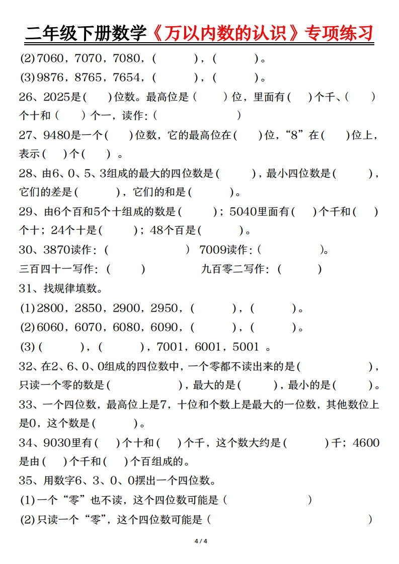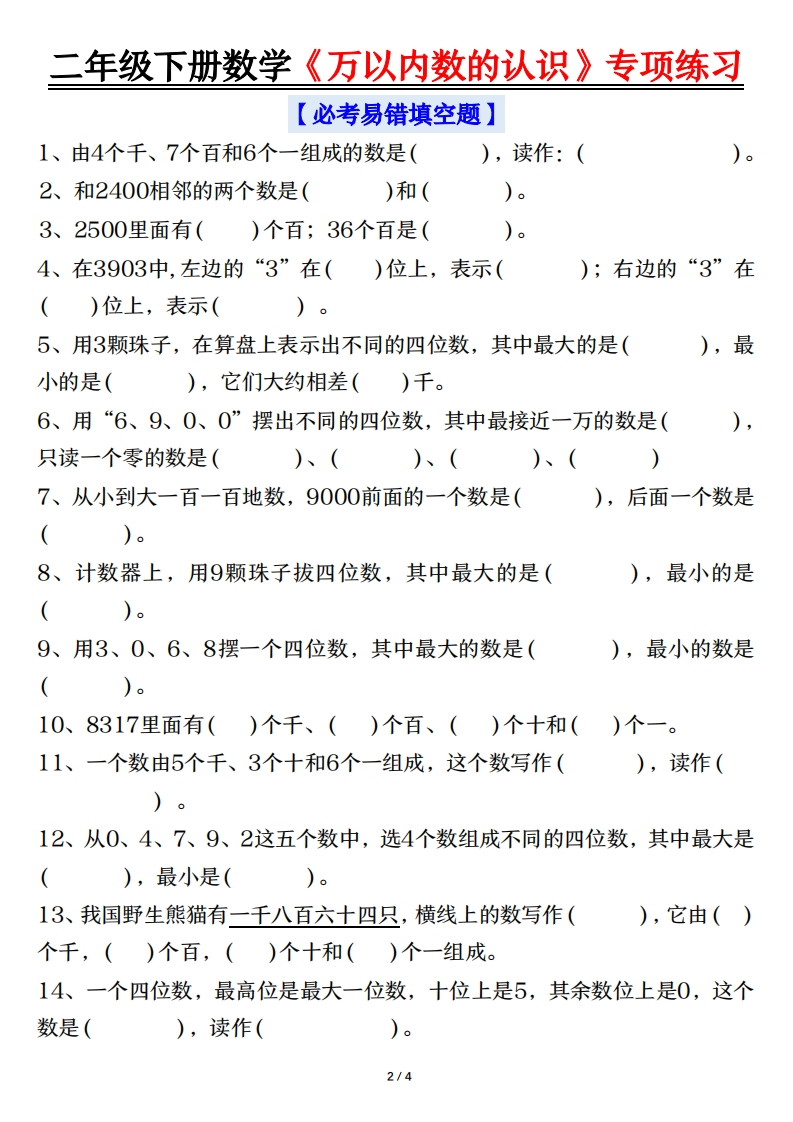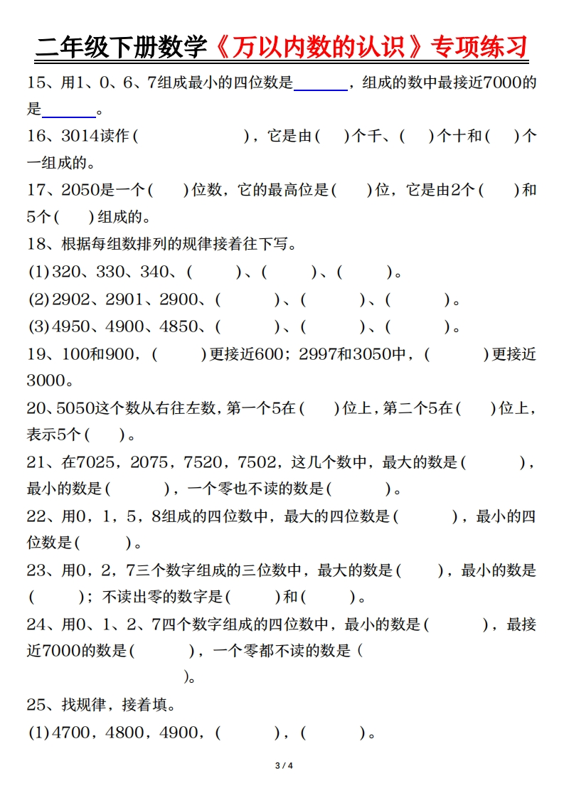 二年级下册数学(万以内数的认识)专项练习含答案.36ef1f0e7c65f3bf285dace291bde56b985文库29天前发布关注私信0.54MB8页14309二年级下册数学(万以内数的认识)专项练习含答案.36ef1f0e7c65f3bf285dace291bde56b此内容为付费资源,请付费后查看¥3 限时特惠¥5黄金会员免费钻石会员免费登录购买付费资源 开学季半价抢会员,享受免费下载 点击开通 文章目录 1 封面图 2 文档部分预览截图 3 下载地址 第1页 / 共8页 第2页 / 共8页 第3页 / 共8页 第4页 / 共8页 试读已结束,还剩4页,您可下载完整版后进行离线阅读 版权声明 1 本网站名称: 985文库 2 本站永久网址:https://985wenku.cn 3 本站资源部分来自网络,由老师收集整理,如有侵犯你的权益请联系管理员E-mail:240407401@qq.com 我们会第一时间进行审核删除。 开通网站会员,全站资料免费下载 THE END二年级资料 文本预览 二年级下册数学《万以内数的认识》专项练习《万以内数的认识》知识点梳理填空一、1000以内数的认识1、10个一百就是02、读数时,要从位读起。百位上是几就读几百,十位上几就读几十,个位上是几就读几。中间有一个0,就读“”,末尾不管有几个0,都3、写数时,要从位写起,几个百就在位写几,几个十就在位写几,几个一就在位写几,哪一位上一个数也没有就写占位。4、数的组成:看每个数位上是几,就由几个这样的组成。例如:4692由_个千、_个百、_个十、_个1组成,4692=4000+600+90+2二、10000以内数的认识1、10个一千是。2、万以内数的读法和写法与1000以内的数读法和写法相同。3、最小两位数是,最大的两位数是;最小三位数是,最大的三位数是;最小四位数是最大的四位数是;最小的五位数是最大的五位数是三、比较数的大小(1)先比的那个数大;(2)如果位数相同,就从位开始,一位一位的比,直到比出大小为止。四、准确数和近似数:利用“四舍五入”取准确数的近似值(1)取整百,看位的数,比5小就大于或者等于5就向位进一;(2)取整千,看位的数,比5小就,大于或者等于5就向位进一。五、整百、整千数加减法1、整百、整千加减法的计算方法。(1)把整百、整千数看成然后(2)先把前面的数相加减,再在添上与整百、整千数相同个数的2、估算:把数看做它的再计算。1/4 查看更多 收起部分 喜欢就支持一下吧点赞9 分享QQ空间微博QQ好友海报分享复制链接收藏