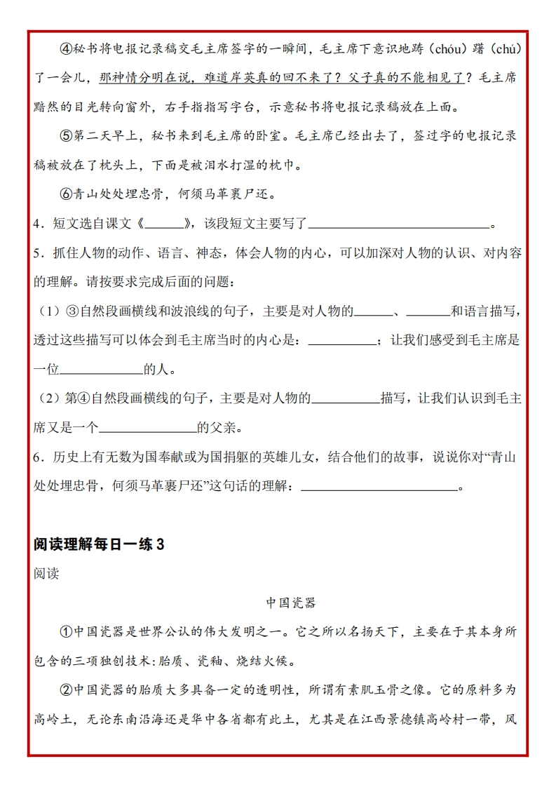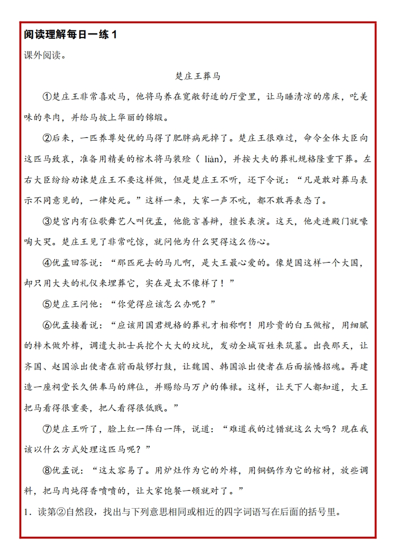 五年级语文下册《阅读理解常考题型每日一练》35篇含答案985文库22天前更新关注私信2.41MB130页3965五年级语文下册《阅读理解常考题型每日一练》35篇含答案此内容为付费资源,请付费后查看¥3 限时特惠¥5黄金会员免费钻石会员免费登录购买付费资源 开学季半价抢会员,享受免费下载 点击开通 文章目录 1 封面图 2 文档部分预览截图 3 下载地址 第1页 / 共130页 第2页 / 共130页 第3页 / 共130页 第4页 / 共130页 试读已结束,还剩126页,您可下载完整版后进行离线阅读 版权声明 1 本网站名称: 985文库 2 本站永久网址:https://985wenku.cn 3 本站资源部分来自网络,由老师收集整理,如有侵犯你的权益请联系管理员E-mail:240407401@qq.com 我们会第一时间进行审核删除。 开通网站会员,全站资料免费下载 THE END五年级资料 文本预览 五年级下册语文阅读理解常芳题型每日一练700每日一练 查看更多 收起部分 喜欢就支持一下吧点赞5 分享QQ空间微博QQ好友海报分享复制链接收藏