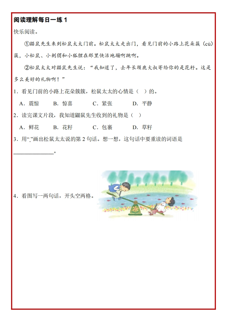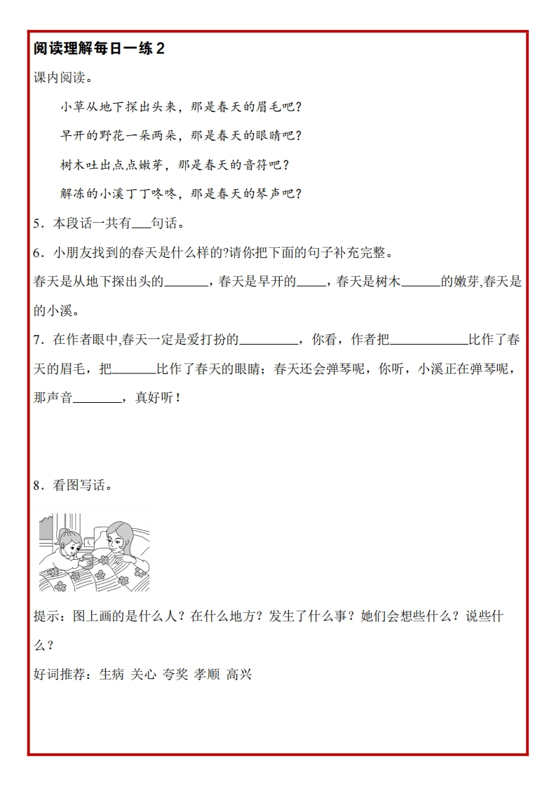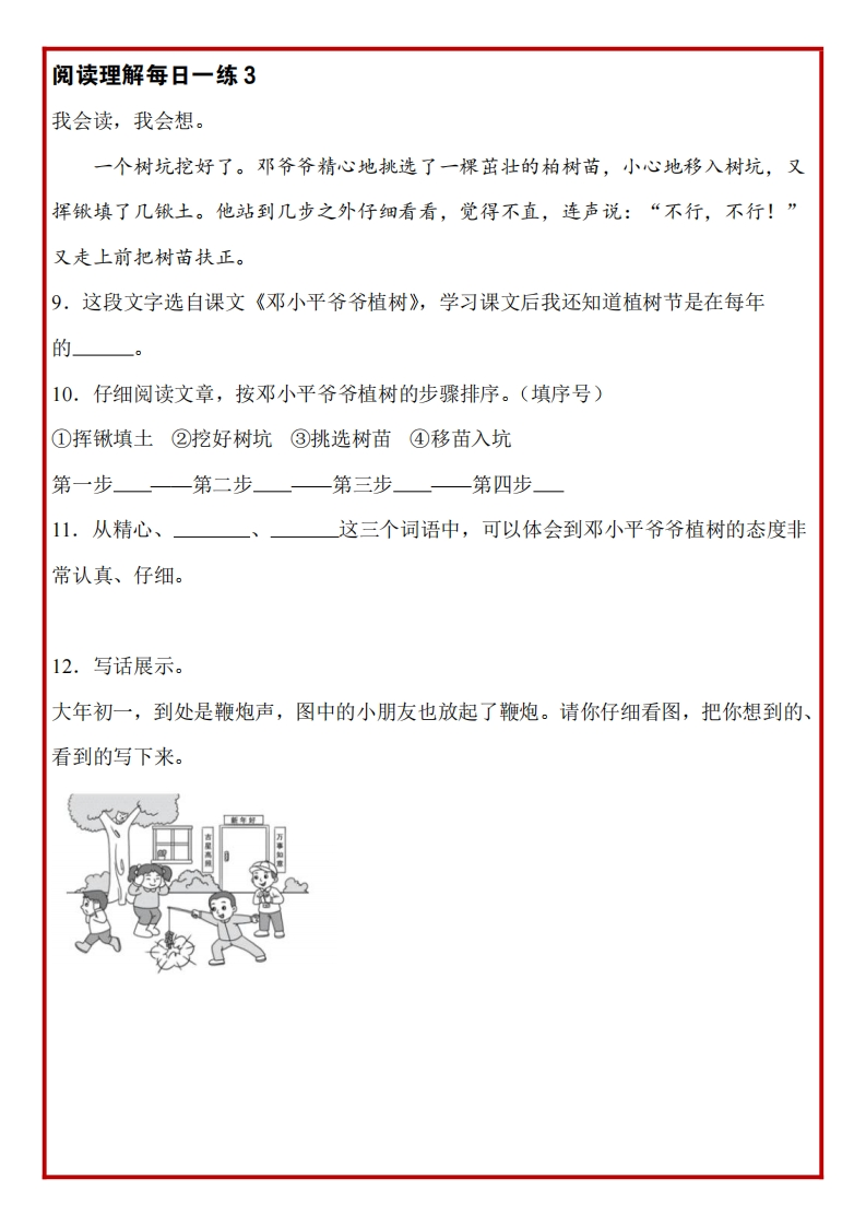 二年级语文下册《阅读理解常考题型每日一练》28篇含答案985文库22天前更新关注私信2.35MB65页12665二年级语文下册《阅读理解常考题型每日一练》28篇含答案此内容为付费资源,请付费后查看¥3 限时特惠¥5黄金会员免费钻石会员免费登录购买付费资源 开学季半价抢会员,享受免费下载 点击开通 文章目录 1 封面图 2 文档部分预览截图 3 下载地址 第1页 / 共65页 第2页 / 共65页 第3页 / 共65页 第4页 / 共65页 试读已结束,还剩61页,您可下载完整版后进行离线阅读 版权声明 1 本网站名称: 985文库 2 本站永久网址:https://985wenku.cn 3 本站资源部分来自网络,由老师收集整理,如有侵犯你的权益请联系管理员E-mail:240407401@qq.com 我们会第一时间进行审核删除。 开通网站会员,全站资料免费下载 THE END二年级资料 文本预览 二年级下册语文阅读理解看图写话每日一练700每日一练 查看更多 收起部分 喜欢就支持一下吧点赞5 分享QQ空间微博QQ好友海报分享复制链接收藏