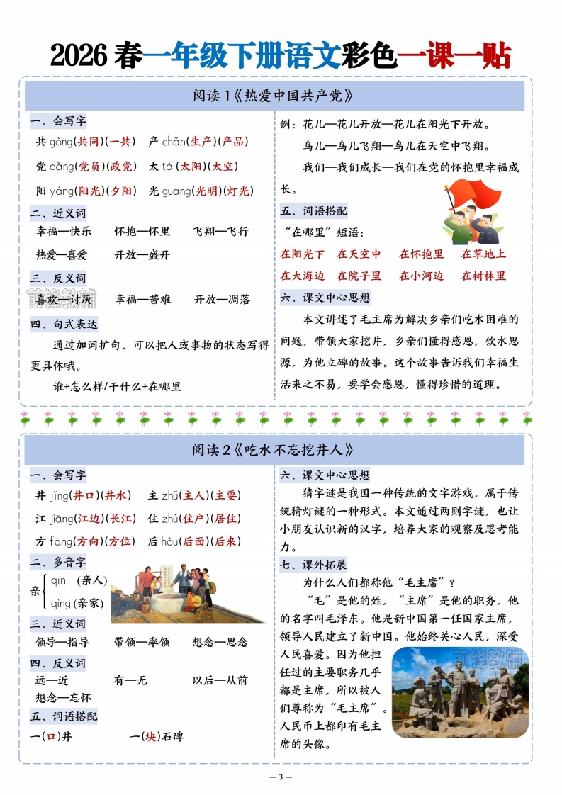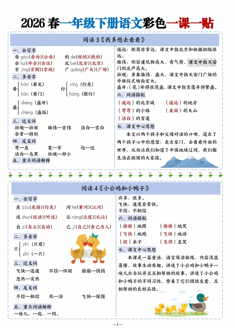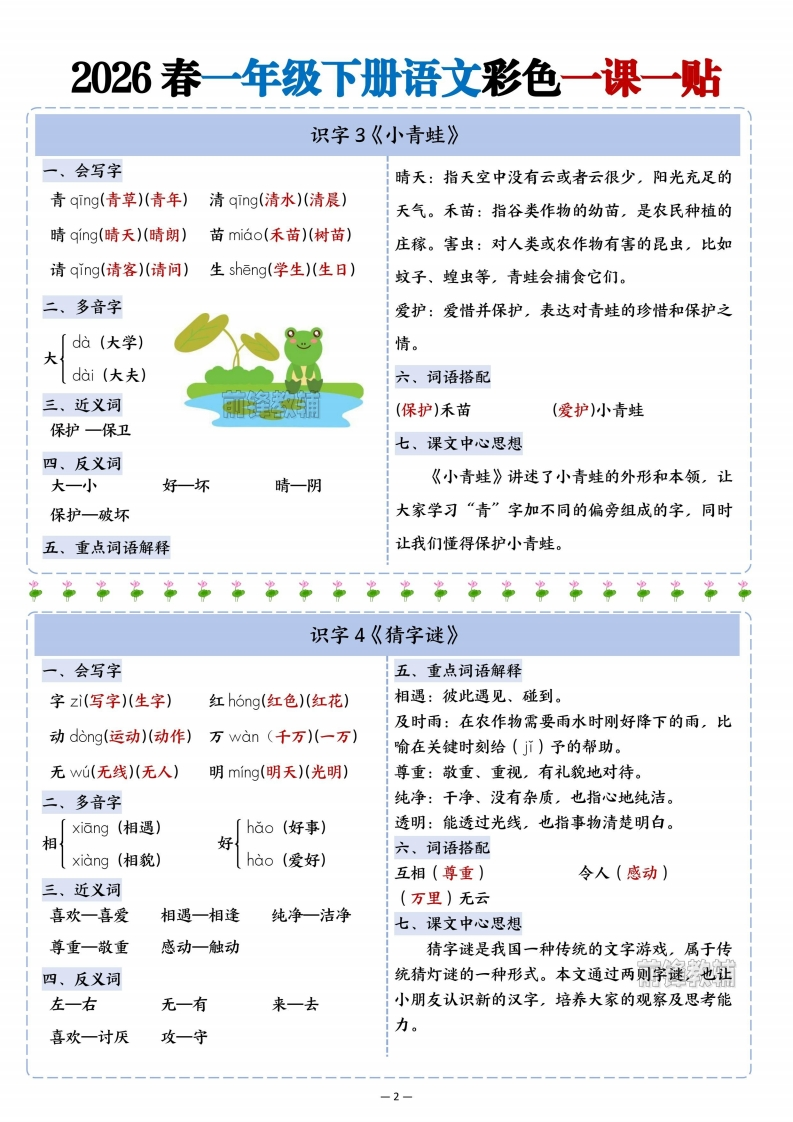 2026春一年级下册语文1-8单元重点知识彩色一课一贴_985文库22天前更新关注私信10.91MB14页83992026春一年级下册语文1-8单元重点知识彩色一课一贴_此内容为付费资源,请付费后查看¥3 限时特惠¥5黄金会员免费钻石会员免费登录购买付费资源 开学季半价抢会员,享受免费下载 点击开通 文章目录 1 封面图 2 文档部分预览截图 3 下载地址 第1页 / 共14页 第2页 / 共14页 第3页 / 共14页 第4页 / 共14页 试读已结束,还剩10页,您可下载完整版后进行离线阅读 版权声明 1 本网站名称: 985文库 2 本站永久网址:https://985wenku.cn 3 本站资源部分来自网络,由老师收集整理,如有侵犯你的权益请联系管理员E-mail:240407401@qq.com 我们会第一时间进行审核删除。 开通网站会员,全站资料免费下载 THE END一年级资料 文本预览 2026春一年级下册语文彩色一课一贴识字1《春夏秋冬》会写字秋霜:秋天的霜,是气温降低后在地面或植物上春chun(春天)(春风)冬dong(冬天)(冬日)凝结的白色冰晶,出现在枫叶变红的时节,标志吹chui(吹风)(吹气)花hua(花朵)(鲜花)飞fēi(飞机)(飞行)入ù(入口)(进入)着天气转凉。二、多音字冬雪:冬天的雪,是天空飘落的白色冰晶,常和jiang(下降)雪人、寒冷的冬天联系在一起。降吹:动词,指风的动作,形象地写出春风拂过的xiang(投降)轻柔感。三、近义词降一落入一进落:动词,指雨从天空降下,写出夏雨的动态。四、反义词降:动词,指霜从空中落下或凝结,体现秋霜的降一升出一入清冷。五、词语搭配四、反义词飘:动词,指雪花轻盈飞舞的样子,写出冬雪的(春风)吹(夏雨)落柔美。(秋霜)降(冬雪)飘七、看图说话六、重点词语解释春风:春天的风,特点是温暖、柔和,能吹醒万物,让挑花开放、柳枝摇动。夏雨:夏天的雨。多为阵雨,来得急、下得大春天到了,池塘边的草青了,山上的花儿伴随荷花盛开的时节,能带来清凉。红了,鱼儿跳出了水面,小鸟飞入了树林。识字2《姓氏歌》、会写字什么:疑问代词,用来询问事物、情况等。在本什shén(什么)(结构)】么me(多么)(那么)课中用于询问对方的姓氏,如“你姓什么?”。六、识字方法古gǔ(古诗)(古老)胡hú(二胡)(胡同)木+(子):李弓+(长):张双shuang(双手)(双方)】言yn(语言)(名言)古+(月):胡口+(天):吴二、多音字张许胡孙七、词语拓展shi(什锦)张冠李戴围魏救赵什shen(什么)李投桃报李完璧归赵三、近义词吴方外司马秦晋之好很多一许多八、课文中心思想四、反义词本文通过学习中国姓氏,让我们用分解部件和偏旁名称的方法介绍自己姓,激发了我们识字很多一很少古一今的兴趣。五、重点词语解释姓氏:指表明家族系统的字,是家族血缘关系的豪标志。比如“李”“张”“赵”等。 查看更多 收起部分 喜欢就支持一下吧点赞9 分享QQ空间微博QQ好友海报分享复制链接收藏