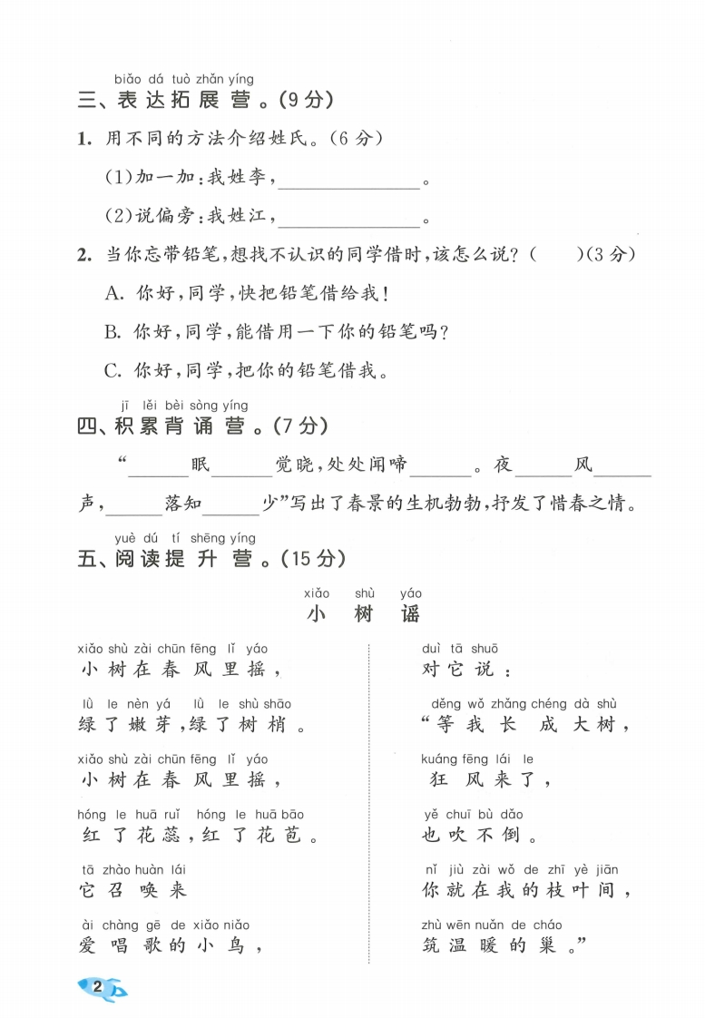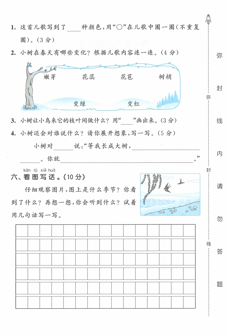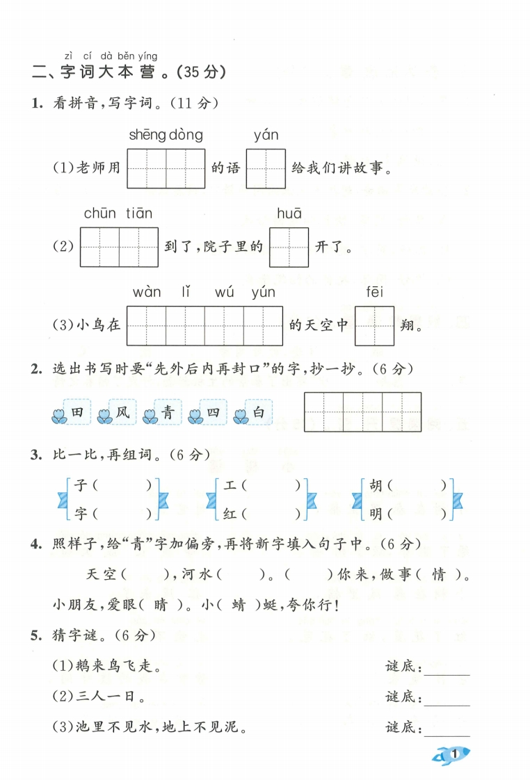 26春部编人教版一年级下册语文第一单元达标测试卷(含答案).pdf985文库10天前更新关注私信4.52MB5页14441426春部编人教版一年级下册语文第一单元达标测试卷(含答案).pdf此内容为付费资源,请付费后查看¥3 限时特惠¥5黄金会员免费钻石会员免费登录购买付费资源 开学季半价抢会员,享受免费下载 点击开通 文章目录 1 封面图 2 文档部分预览截图 3 下载地址 第1页 / 共5页 第2页 / 共5页 第3页 / 共5页 第4页 / 共5页 试读已结束,还剩1页,您可下载完整版后进行离线阅读 版权声明 1 本网站名称: 985文库 2 本站永久网址:https://985wenku.cn 3 本站资源部分来自网络,由老师收集整理,如有侵犯你的权益请联系管理员E-mail:240407401@qq.com 我们会第一时间进行审核删除。 开通网站会员,全站资料免费下载 THE END1-6年级语文同步单元试卷一年级资料 文本预览 26春一年级下册语文单元测试卷部编版(第一单元达标测试卷题号三四五六总分得分器同学们,我们一起去语文乐园吧!弥pin yin xùn lian ying一、拼音训练营。(24分)1.根据《汉语拼音字母表》中字母的顺序连一连。(8分)Y。毁AB.Q封G.F HMN2.把汉字和对应的韵母连一连。(10分)爵霜眼降欢张边团感让凉线angan3.用“/”给加,点字选择正确的读音。(6分)组词(zùzhǔ)孙女(sunshun)下令(Iinling)吃害虫(cichi)☆我在数学课上认图形(xingxin),学计算(suan shuàn)。 查看更多 收起部分 喜欢就支持一下吧点赞14 分享QQ空间微博QQ好友海报分享复制链接收藏