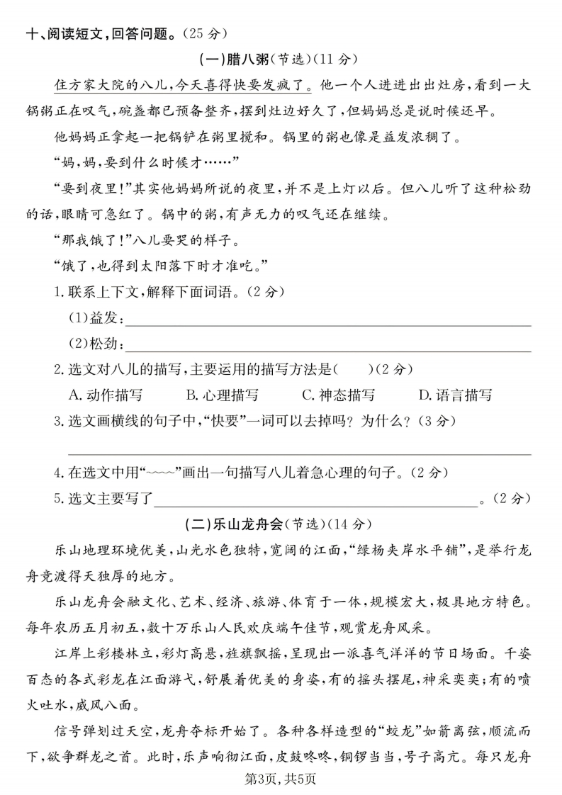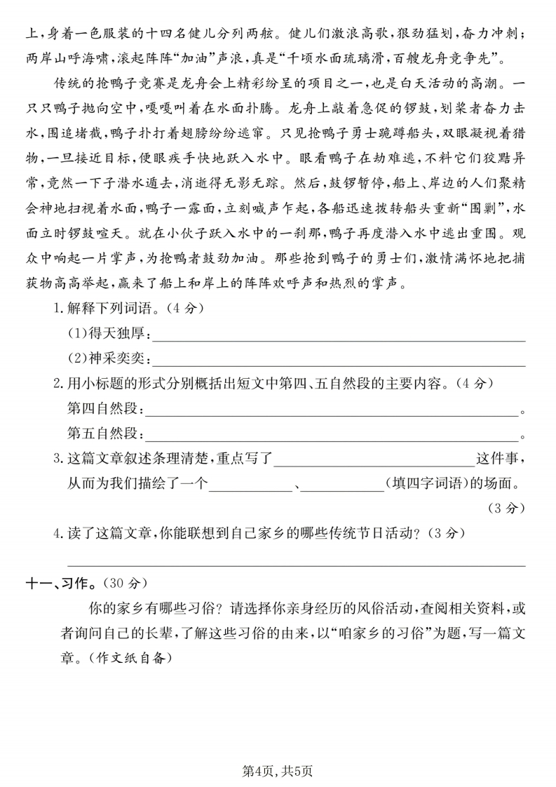 26春部编人教版六年级下册语文第一单元达标测试卷(含答案).pdf985文库10天前更新关注私信4.06MB5页9211526春部编人教版六年级下册语文第一单元达标测试卷(含答案).pdf此内容为付费资源,请付费后查看¥3 限时特惠¥5黄金会员免费钻石会员免费登录购买付费资源 开学季半价抢会员,享受免费下载 点击开通 文章目录 1 封面图 2 文档部分预览截图 3 下载地址 第1页 / 共5页 第2页 / 共5页 第3页 / 共5页 第4页 / 共5页 试读已结束,还剩1页,您可下载完整版后进行离线阅读 版权声明 1 本网站名称: 985文库 2 本站永久网址:https://985wenku.cn 3 本站资源部分来自网络,由老师收集整理,如有侵犯你的权益请联系管理员E-mail:240407401@qq.com 我们会第一时间进行审核删除。 开通网站会员,全站资料免费下载 THE END1-6年级语文同步单元试卷六年级资料 文本预览 六年级下册语文达标测试卷(第一单元测试卷)时间:90分钟满分:105分器题号三四五六七八九总分得分一、卷面书写。(5分)请同学们在答题时认真书写,做到规范、端正、美观,让你的试卷拥有一张清秀、漂亮的面孔!二、看拼音,写词语。(8分)tongxiāozhǎyanIuòtuonong chou毁baitantangchirangangkagi三、比一比,再组词。(4分)拌()饺()腊(脉(伴()较()蜡(泳(四、给下面加点字选择正确解释,填序号。(3分)章:①用于分章节的诗文。②图章。③条目。1.刘邦一到关中,就和关中百姓约法三章。(2.《西游记》这部小说共一百章。()3.他画完这幅画后,又在画的下面签名盖章。()五、先解释词义,再写出诗句意思。(8分)1.盈盈一水间,脉脉不得语。盈盈:脉脉:摇诗句意思:2.中庭地白树栖鸦,冷露无声湿桂花。第1页,共5页 查看更多 收起部分 喜欢就支持一下吧点赞15 分享QQ空间微博QQ好友海报分享复制链接收藏