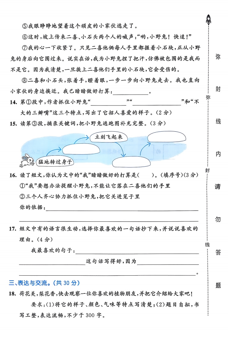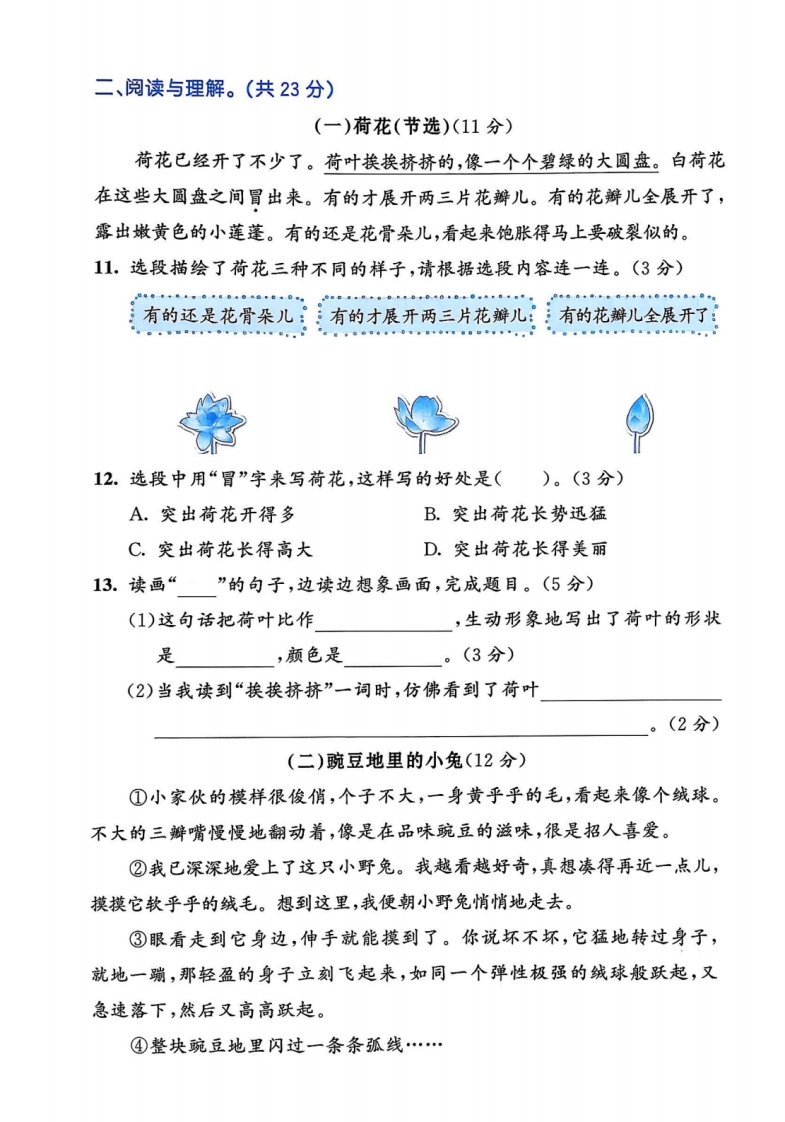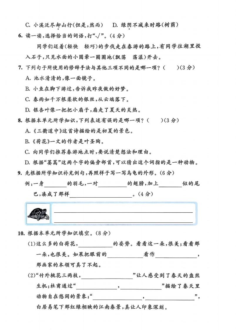 26春部编人教版三年级下册语文第一单元达标测试卷(含答案).pdf985文库10天前更新关注私信3.45MB5页1165726春部编人教版三年级下册语文第一单元达标测试卷(含答案).pdf此内容为付费资源,请付费后查看¥3 限时特惠¥5黄金会员免费钻石会员免费登录购买付费资源 开学季半价抢会员,享受免费下载 点击开通 文章目录 1 封面图 2 文档部分预览截图 3 下载地址 第1页 / 共5页 第2页 / 共5页 第3页 / 共5页 第4页 / 共5页 试读已结束,还剩1页,您可下载完整版后进行离线阅读 版权声明 1 本网站名称: 985文库 2 本站永久网址:https://985wenku.cn 3 本站资源部分来自网络,由老师收集整理,如有侵犯你的权益请联系管理员E-mail:240407401@qq.com 我们会第一时间进行审核删除。 开通网站会员,全站资料免费下载 THE END1-6年级语文同步单元试卷三年级资料 文本预览 26三年级下册语文单元测试卷部编版(第一单元达标测试卷)题号二三等级得分一、积累与运用。(共47分)孙弥1.看拼音,写词语。(7分)wei fengsǎIuò轻拂柳枝,阳光透过枝叶在湖面上。几只huopoyanzijian dao毁的倏地掠过湖面似的尾巴在空中画出封xiansandian xian优美的孤线,那边还有飞倦了的几对,地在上休憩。2.给下列词语中的加,点字选择正确的读音,打“√”。(6分)蜻蜓(tingtin)伶俐(Iinling)纤细(xiangian)旷亮(guangkuang)挨挨挤挤(āiai)蚂蚱(màma)3.有同学抄写了以下词语,其中书写有误的是哪一项?()(3分)线鸳B.赶集广泛D.偶尔4.观察下面的例子,照样子填一填。(4分)例:突、状一(犬)一(军犬)此、旨一()一(说、税一()一(沉、壳一()一(忆、艺一()一()5.下列选项中对加点字词的解释有误的是哪一项?()(3分)A.迟日江山丽(春日)B.蒌蒿满地芦芽短(芦苇的嫩芽) 查看更多 收起部分 喜欢就支持一下吧点赞7 分享QQ空间微博QQ好友海报分享复制链接收藏