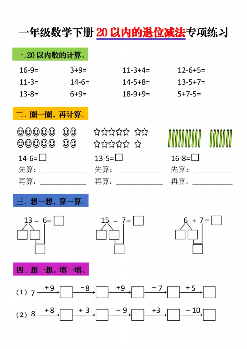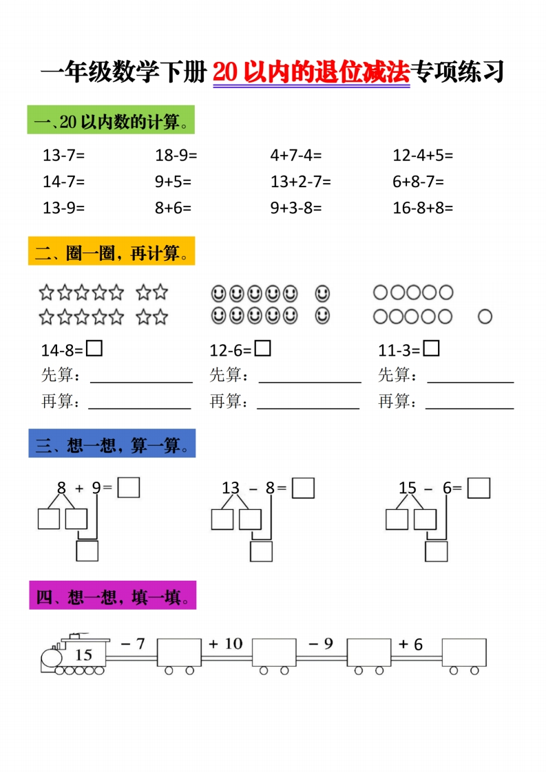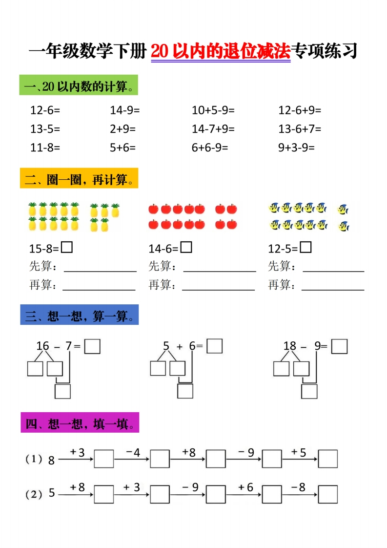 一年级下数学20以内退位减法专项练习985文库20天前更新关注私信2.18MB5页10727一年级下数学20以内退位减法专项练习此内容为付费资源,请付费后查看¥3 限时特惠¥5黄金会员免费钻石会员免费登录购买付费资源 开学季半价抢会员,享受免费下载 点击开通 文章目录 1 封面图 2 文档部分预览截图 3 下载地址 第1页 / 共5页 第2页 / 共5页 第3页 / 共5页 第4页 / 共5页 试读已结束,还剩1页,您可下载完整版后进行离线阅读 版权声明 1 本网站名称: 985文库 2 本站永久网址:https://985wenku.cn 3 本站资源部分来自网络,由老师收集整理,如有侵犯你的权益请联系管理员E-mail:240407401@qq.com 我们会第一时间进行审核删除。 开通网站会员,全站资料免费下载 THE END一年级资料 文本预览 一年级数学下册20以内的退位减法专项练习一、20以内数的计算。15-6=11-3=9+3-6=14-6+9=15-9=6+5=7+8-9=7+6-8=16-7=12-515-8+9=15-8+6=二、圈一圈,再计算。12-9=☐14-5=☐16-8=☐先算:先算:先算:再算:再算:再算:三、想一想,算一算。18-9=☐8=四、想一想,填一填。()6+8☐9☐+7☐5☐+8☐(2)9+9☐+1☐10☐+6□7 查看更多 收起部分 喜欢就支持一下吧点赞7 分享QQ空间微博QQ好友海报分享复制链接收藏