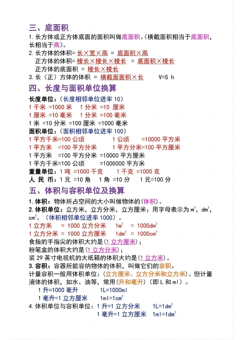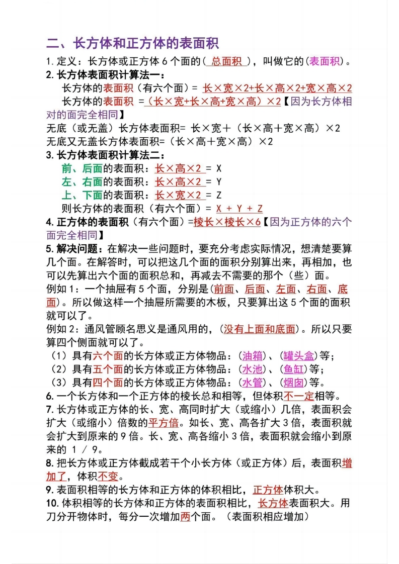 五年级下册数学必背知识点一、长方体和正方体的特征:形体相同点不同点面棱顶点面的形状面的大小棱长关系六个面:一般都是长方体长方形(也有两个相对的面平行的四条正方体6128相对的面是正方面积相等棱长度相等是特殊形)的长方正方体六个面:都是正方六个面的十二条棱6128形面积相等长度都相等1.长方体:上左后右下前①有(6)个面,(相对的面)完全相同;长方体放桌面上,最多只能看到(3)个面。②有(12)条棱,(相对)的棱长长度相等,而且相对的棱互相(平行);12条棱可以分为3组(分别为长、宽、高),每组的4条棱(一样长);长方体的棱长总和=长×4+宽×4+高×4=(长+宽+高)×4③有(⑧)个顶点,每个顶点上的三条棱分别称为长方体的(长,宽,高)。2.正方体:上4厘米左4厘米后右4厘米下前①有(6)个(完全相同)的面;正方体放桌面上,最多只能看到3个面。②有(12)条(长度相等)的棱,每条棱的长度称为正方体的棱长;正方体的总棱长=棱长×12。③有(⑧)个顶点。