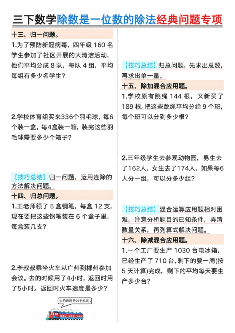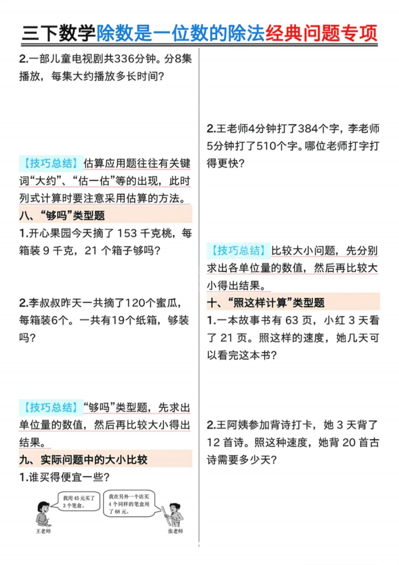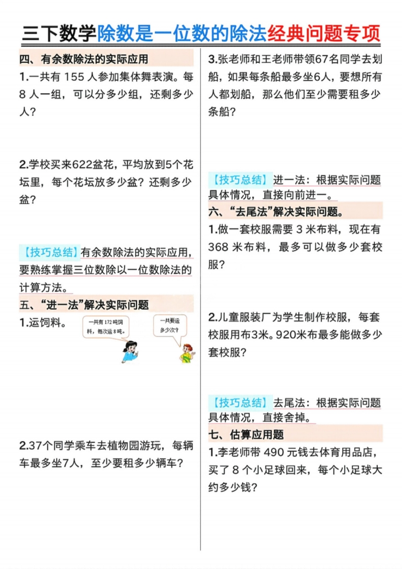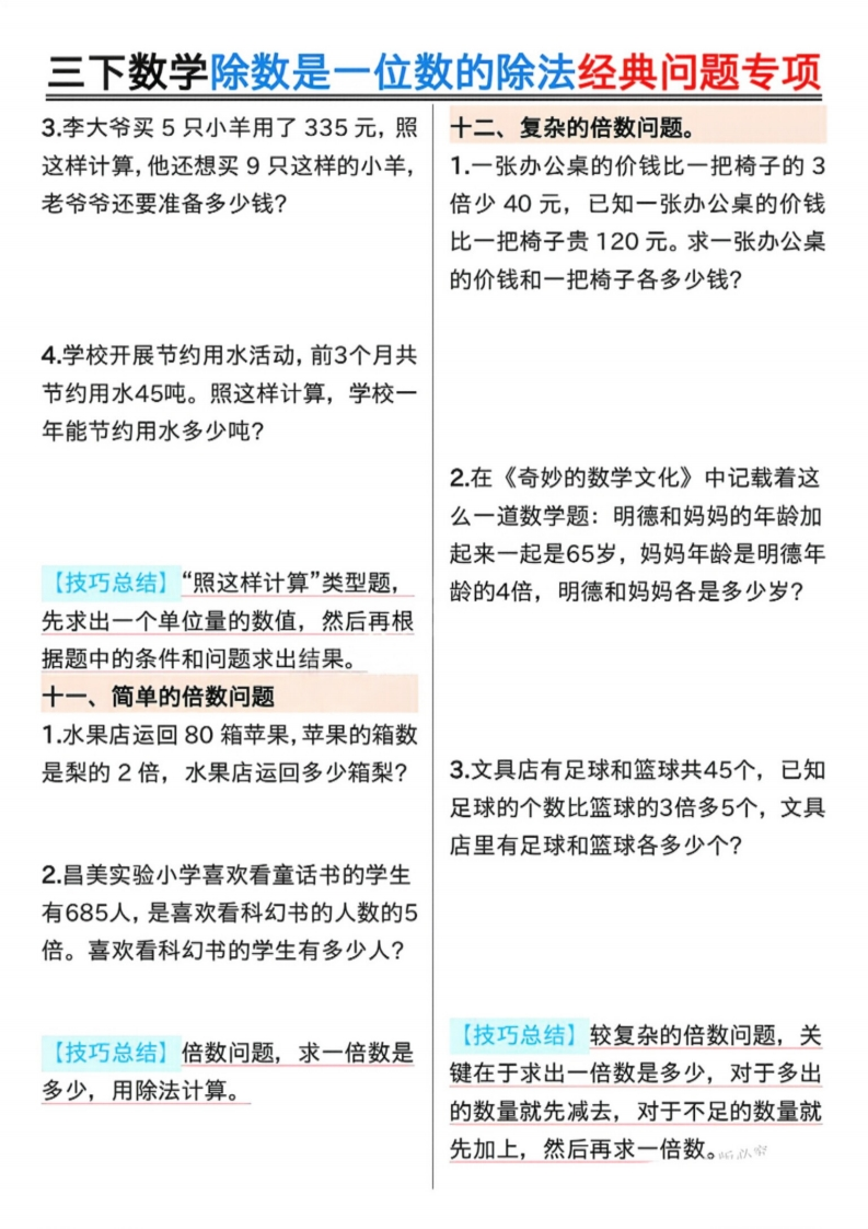 26春三年级下册数学《除数是一位数的除法》专项练习含答案.4191dbc34a72255e1f94960101210084985文库18天前发布关注私信8.02MB20页642926春三年级下册数学《除数是一位数的除法》专项练习含答案.4191dbc34a72255e1f94960101210084此内容为付费资源,请付费后查看¥3 限时特惠¥9.9黄金会员免费钻石会员免费登录购买付费资源已售 1 开学季半价抢会员,享受免费下载 点击开通 文章目录 1 封面图 2 文档部分预览截图 3 下载地址 第1页 / 共20页 第2页 / 共20页 第3页 / 共20页 第4页 / 共20页 第5页 / 共20页 试读已结束,还剩15页,您可下载完整版后进行离线阅读 版权声明 1 本网站名称: 985文库 2 本站永久网址:https://985wenku.cn 3 本站资源部分来自网络,由老师收集整理,如有侵犯你的权益请联系管理员E-mail:240407401@qq.com 我们会第一时间进行审核删除。 开通网站会员,全站资料免费下载 THE END三年级资料 文本预览 三下数学除数是一位数的除法经典问题专项一、倒水问题。二、周期问题。1.用一个杯子装满水向一个空瓶里倒1按下面的方法摆60个三角形,最后水。如果倒进3杯水,连瓶共重440一个三角形是什么颜色?克;如果倒进5杯水,连瓶共重600△△▲▲△▲△△▲▲△▲△△▲▲△▲克。一个空瓶重()克。2有一堆棋子按二黑三白的规律往下排,第47个是什么颜色的棋子?2.一个杯子装满水倒向另一个空瓶里,如果倒进3杯水,连瓶共重440克,如果倒进5杯水,连瓶共重600克,一杯【技巧总结】周期问题,在找到周期水重()克,一个空瓶重()克。后,利用除法计算,余数是几,就是周期里面的第几个。三、除法基础应用题1.花店运来1800朵玫瑰花,每8朵扎一束,一共可以扎成多少束?2水果商店购进苹果288个,平均装在8个纸箱里。每个纸箱装多少个?【技巧总结】倒水问题的解题关键在于通过两次倒入杯数和重量的差,求出两杯水的重量,进而求出每杯水的【技巧总结】除法的基础应用题比较重量。简单,熟练掌握除数是一位数的除法计算方法是关键。 查看更多 收起部分 喜欢就支持一下吧点赞9 分享QQ空间微博QQ好友海报分享复制链接收藏