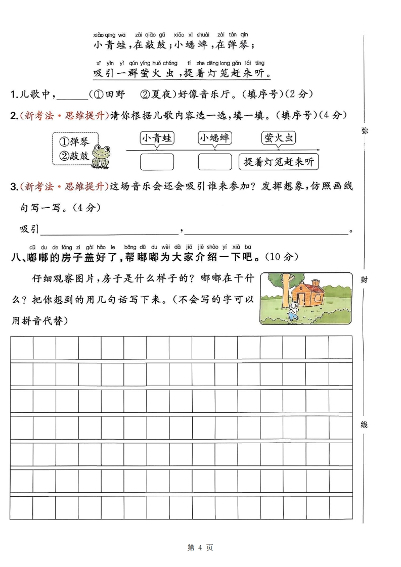 2026学年部编人教1一年级下册第单元单元培优·情境卷⑦时间:60分钟满分:100分心得分:主题情境三只小猪盖房记弥森林里住着三只小猪,他们要分别盖自己的房子。快来完成挑战,收集盖房材料,帮助他们一起盖房子吧!孙第一关·帮圆圆盖稻草房ging nT an shin xu xis chu que shao de da xiao xie pin yin zi mu shou ji dao cao一、请你按顺序写出缺少的大小写拼音字母,收集稻草。(10分)第一组:普普普善普普第二组:救普普普普普普封ging ni yòngquan chu jia dian zi de zheng que du yin bang yuanyuan qing cha dao cao zhong hun ru de二、请你用“○”圈出加点字的正确读音,帮圆圆清除稻草中混入的z6 cto杂草。(6分)降落(Iuòruò)保护(hùfù)凉水(niángliang)猜想(cāichai)禾苗(máomiao)姓氏(sish)愛wan cheng xia mian de lian xi zhu fi yuan yuan gai hao fang zi三、完成下面的练习,助力圆圆盖好房子。(28分)线1.春日建房。读拼音,写字词。(12分)dong tianchun fenghémido过去了,吹绿了吹开了hong huawa在这晴朗云的日子里,圆圆开始搭建新房子。燕子第1页