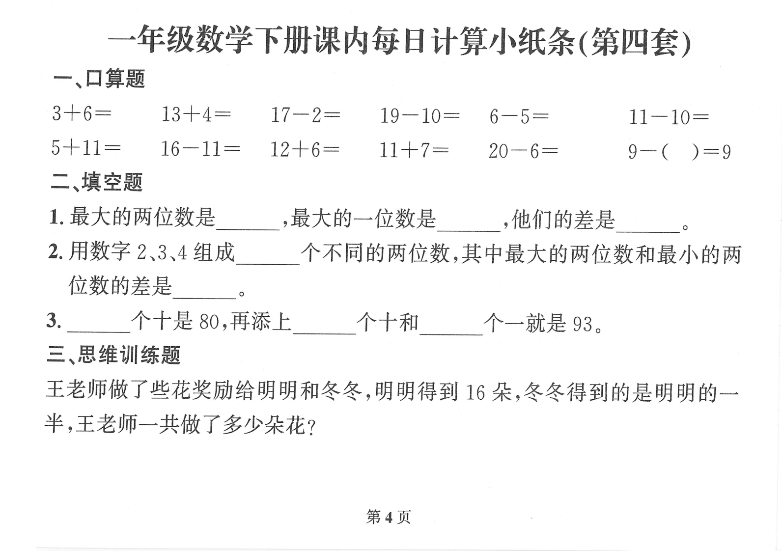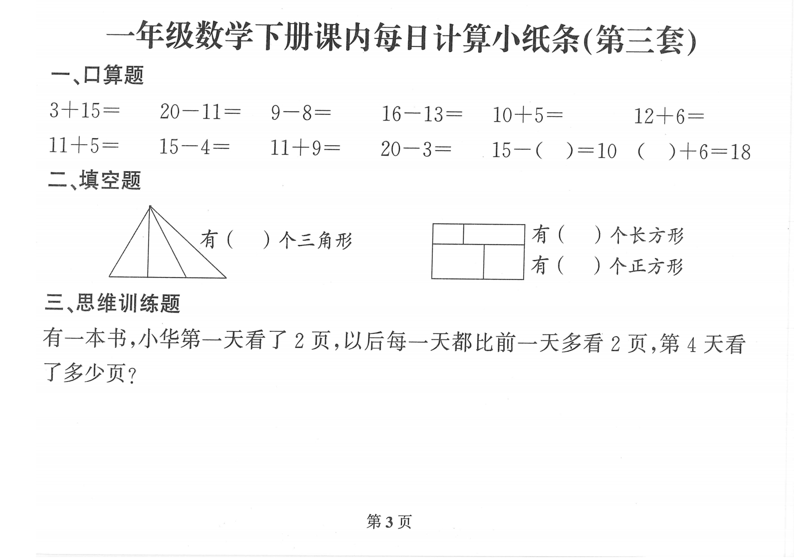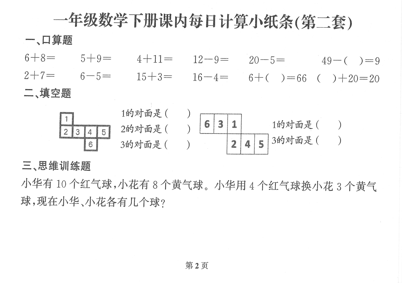 2026一年级数学下册每日一练985文库18天前发布关注私信12.28MB36页110062026一年级数学下册每日一练此内容为付费资源,请付费后查看¥3 限时特惠¥9.9黄金会员免费钻石会员免费登录购买付费资源 开学季半价抢会员,享受免费下载 点击开通 文章目录 1 封面图 2 文档部分预览截图 3 下载地址 第1页 / 共36页 第2页 / 共36页 第3页 / 共36页 第4页 / 共36页 试读已结束,还剩32页,您可下载完整版后进行离线阅读 版权声明 1 本网站名称: 985文库 2 本站永久网址:https://985wenku.cn 3 本站资源部分来自网络,由老师收集整理,如有侵犯你的权益请联系管理员E-mail:240407401@qq.com 我们会第一时间进行审核删除。 开通网站会员,全站资料免费下载 THE END一年级资料 文本预览 一年级数学下册课内每日计算小纸条(第一套)一、口算题18-9=16+5=23-7=21+8=10-9十9=1+6+8=13-4=15-6=4十24=6+5=7+7十9=4+()=13二、填空题有()个三角形有()个正方形有()个正方形三、思维训练题小平家距学校2千米,一次他上学走了1千米,想起忘带铅笔盒,又回家去取。这次他到学校共走了多少千米?第1页 查看更多 收起部分 喜欢就支持一下吧点赞6 分享QQ空间微博QQ好友海报分享复制链接收藏