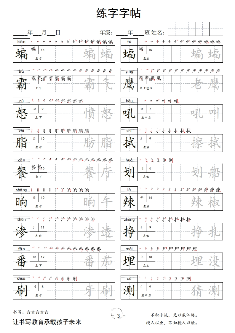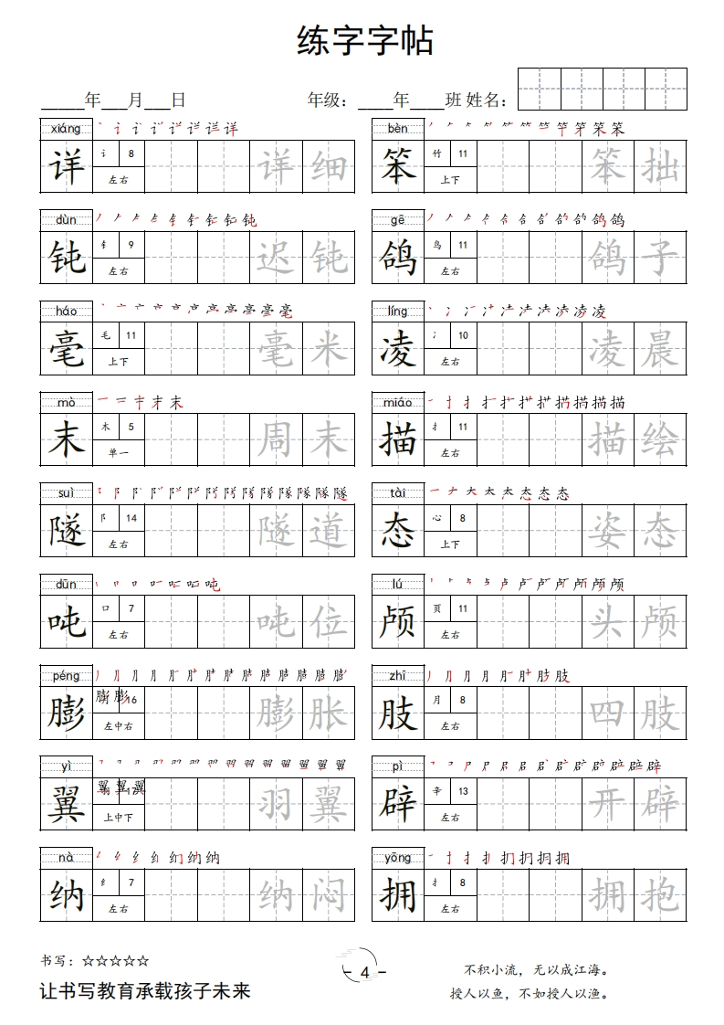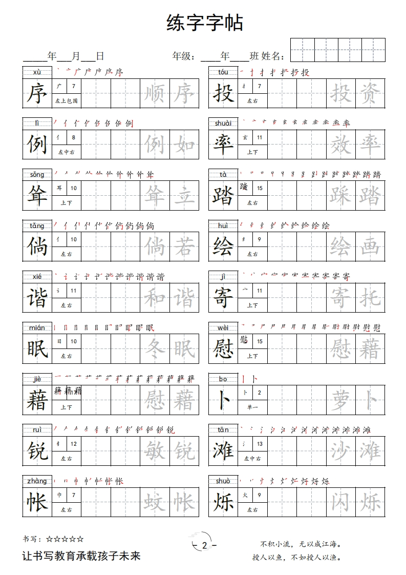 【写字表字帖】四下语文985文库18天前发布关注私信2.97MB14页85714【写字表字帖】四下语文此内容为付费资源,请付费后查看¥3 限时特惠¥9.9黄金会员免费钻石会员免费登录购买付费资源 开学季半价抢会员,享受免费下载 点击开通 文章目录 1 封面图 2 文档部分预览截图 3 下载地址 第1页 / 共14页 第2页 / 共14页 第3页 / 共14页 第4页 / 共14页 试读已结束,还剩10页,您可下载完整版后进行离线阅读 版权声明 1 本网站名称: 985文库 2 本站永久网址:https://985wenku.cn 3 本站资源部分来自网络,由老师收集整理,如有侵犯你的权益请联系管理员E-mail:240407401@qq.com 我们会第一时间进行审核删除。 开通网站会员,全站资料免费下载 THE END四年级资料 文本预览 练字字帖年月日年级:年班姓名:九少华杂杂三千干手和种种秋稀稀杂木6杂乱稀禾12上下左右稀少年ng中虫虫虫虫址蛛蜻蜻蜻ting中虫虫虫”虫二虫千壬蜓蜓蜻12左右蜻蜓蜓左右蜻蜓一d虫虫蝶蝶产户字户守疗宿宿宿蝶11左右蝴蝶宿上下宿舍梨软松伦徐徐徐shu.正矿弦碎疏疏徐左右徐州疏12左右疏忽mao女兰茅茅"yan茅8橡檐搁上下茅屋檐左右屋檐weng八公公谷谷分翁翁翁竺竽笼笼笼翁羽10渔翁笼龙11上下上下灯笼束束赖赖赖子子录录剥赖13左右依赖剥10左右剥削gou干才木利杓构构"shi饣竹的饰构88左右构成饰左右装饰dun显星显”“旷骑蕲瞒feng几凤凤蹲萸蹲蹲4左右蹲守上三包国风凰书写:☆☆☆☆☆不积小流,无以成江海。让书写教育承载孩子未来授人以鱼,不如授人以渔。 查看更多 收起部分 喜欢就支持一下吧点赞14 分享QQ空间微博QQ好友海报分享复制链接收藏