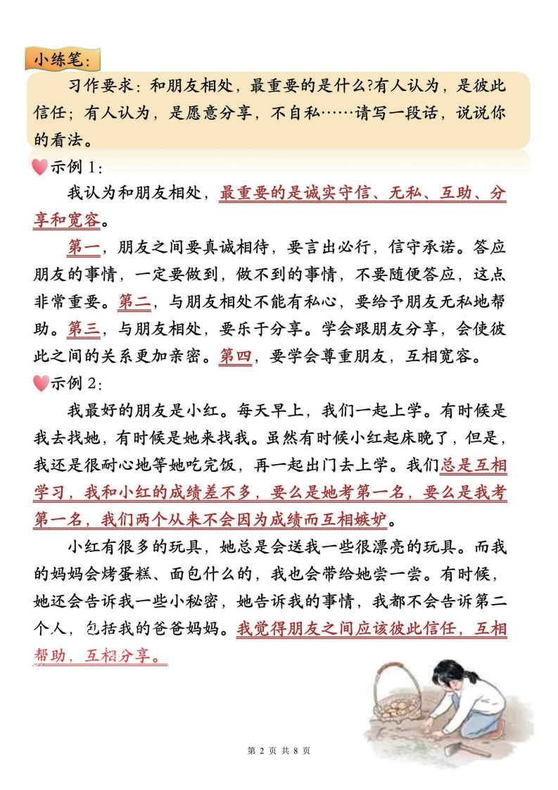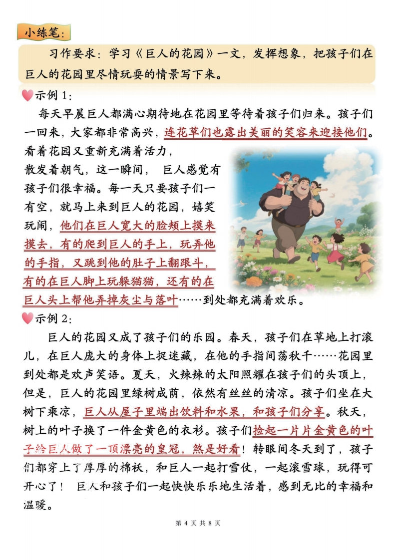 四年级(下)语文期末作文小练笔汇总.pdf985文库18天前发布关注私信6.88MB8页64014四年级(下)语文期末作文小练笔汇总.pdf此内容为付费资源,请付费后查看¥3 限时特惠¥9.9黄金会员免费钻石会员免费登录购买付费资源 开学季半价抢会员,享受免费下载 点击开通 文章目录 1 封面图 2 文档部分预览截图 3 下载地址 第1页 / 共8页 第2页 / 共8页 第3页 / 共8页 第4页 / 共8页 试读已结束,还剩4页,您可下载完整版后进行离线阅读 版权声明 1 本网站名称: 985文库 2 本站永久网址:https://985wenku.cn 3 本站资源部分来自网络,由老师收集整理,如有侵犯你的权益请联系管理员E-mail:240407401@qq.com 我们会第一时间进行审核删除。 开通网站会员,全站资料免费下载 THE END四年级资料 文本预览 四年级下册语文全册小练笔汇总考试神器★期末复习必备小练笔:习作要求:观察附近的一处景物,如校园一角、附近公园里的一个花坛…和同学交流看到了什么,再试着按一定的顺序写下来。例文:我家附近有一条河。那条河像一条长龙,从很远很远的地方奔涌而来,又向很远很远的地方延绵而去。河中的水草各种各样:淫萍、水葫芦、水藻,各有千秋。水草下面,还有鱼儿在嬉戏,它们是快乐的天使,无忧无虑、自由自在,它们时而与同伴嬉闹,时而自娱自乐,时而为争食打闹,时而为胜利庆祝。沿着河岸往前走,一片草坪出现在眼前。春天,这里嫩草青青;夏天,这里蛙声一片:秋天,这里草色渐黄;冬天,这里花木凋零。在这里,最热闹的就是夏天了,一到傍晚,人们就陆续来到这里钓鱼、玩耍、乘凉,河水载着人们的欢笑声,流向很远很远的地方。如果你有空,不妨也来欣赏一下这里的美景,它虽没有名山大川的壮丽,却别有一番风味。 查看更多 收起部分 喜欢就支持一下吧点赞14 分享QQ空间微博QQ好友海报分享复制链接收藏