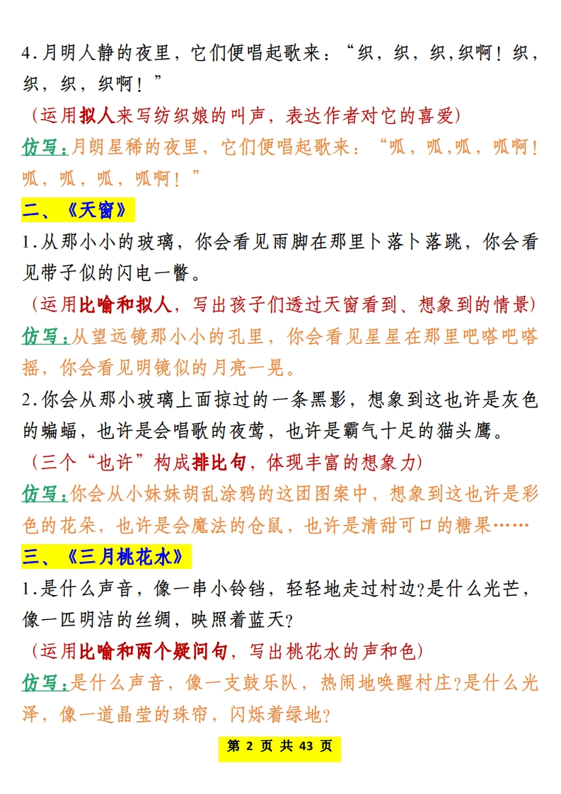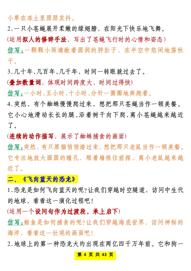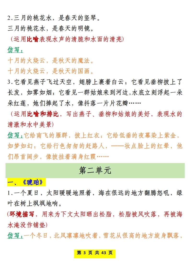 四年级(下)语文仿写课后小练985文库18天前发布关注私信5.68MB43页74811四年级(下)语文仿写课后小练此内容为付费资源,请付费后查看¥3 限时特惠¥9.9黄金会员免费钻石会员免费登录购买付费资源 开学季半价抢会员,享受免费下载 点击开通 文章目录 1 封面图 2 文档部分预览截图 3 下载地址 第1页 / 共43页 第2页 / 共43页 第3页 / 共43页 第4页 / 共43页 试读已结束,还剩39页,您可下载完整版后进行离线阅读 版权声明 1 本网站名称: 985文库 2 本站永久网址:https://985wenku.cn 3 本站资源部分来自网络,由老师收集整理,如有侵犯你的权益请联系管理员E-mail:240407401@qq.com 我们会第一时间进行审核删除。 开通网站会员,全站资料免费下载 THE END四年级资料 文本预览 四年级语文下册寒假预习课文课后小练笔仿写句子第一单元、《乡下人家》1.青、红的瓜,碧绿的藤和叶,构成了一道别有风趣的装饰,比那高楼门前蹲着一对石狮子或是竖着两根大旗杆,可爱多了。(运用对比的手法,体现农家小院的别致风趣)仿写:红、绿的莱,简单的碗和筷,铺开了一桌与众不同的家宴,比那满汉全席摆满碗碟杯盏或是堆着一只大龙虾,亲切多了。2.几场春雨过后,到那里走走,你常常会看见许多鲜嫩的笋,成群地从土里探出头来。(运用拟人写出竹笋成长速度极快)仿写:几场春雨过后,到山间走走,你常常会看见不少山泉的水,欢快地从山涧飞奔而去。3.天边的红霞,向晚的微风,头上飞过的归巢的鸟儿,都是他们的好友。它们和乡下人家一起,绘成了一幅自然、和谐的田园风景画。(分局部描写场景,写出生动的画面感)仿写:飞翔的海鸥,金色的沙滩,礁石激起的白色的浪花,都是大自然的馈赠。它们和奔跑的孩子们一起,构成了海岸线上独特的风景线。第1页共43页 查看更多 收起部分 喜欢就支持一下吧点赞11 分享QQ空间微博QQ好友海报分享复制链接收藏