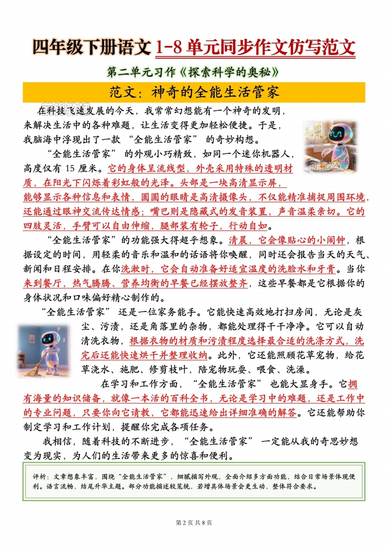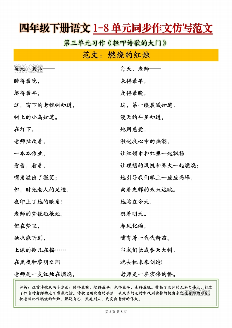 四年级下册语文1-8单元同步作文985文库18天前发布关注私信7.24MB8页7285四年级下册语文1-8单元同步作文此内容为付费资源,请付费后查看¥3 限时特惠¥9.9黄金会员免费钻石会员免费登录购买付费资源 开学季半价抢会员,享受免费下载 点击开通 文章目录 1 封面图 2 文档部分预览截图 3 下载地址 第1页 / 共8页 第2页 / 共8页 第3页 / 共8页 第4页 / 共8页 试读已结束,还剩4页,您可下载完整版后进行离线阅读 版权声明 1 本网站名称: 985文库 2 本站永久网址:https://985wenku.cn 3 本站资源部分来自网络,由老师收集整理,如有侵犯你的权益请联系管理员E-mail:240407401@qq.com 我们会第一时间进行审核删除。 开通网站会员,全站资料免费下载 THE END四年级资料 文本预览 四年级下册语文1-8单元同步作文仿写范文第一单元习作《我的乐园》范文:我的乐园一老家的后院每个入态中都有一座专属的乐园,而我的乐园,是老家那充满生机与童趣的后院。那里的一草一木、一砖一瓦,都承载着我最珍贵的童年回忆。后院的入口处,爬满了翠绿的藤蔓,它们相互缠绕,仿佛在编织着一个绿色的梦幻门帘。穿过这道天然的门帘,首先映入眼帘的是那棵高大粗壮的老枣树。它的枝千向四周伸展,像是张开双臂欢迎每一个到来的人。春天,枣树上开满了淡黄色的小花,散发出阵阵清香,引得蜜蜂、蝴蝶纷纷前来。夏天,茂密的枝叶形成了一片绿荫,为我们遮挡炎炎烈日。秋天,红形形的枣子挂满枝头,就像点缀在树上的小灯笼。篱笆上的牵牛花也不甘示弱,它们争奇斗艳,粉的像霞,紫的像梦,清晨时分,花朵上还挂着晶莹的露珠,在阳光的照耀下闪闪发光。篱笆旁,毛茸茸的三叶草挨挨挤挤,时不时还能发现一两株幸运的四叶草,让人惊喜不已。在这里,我和小伙伴们有玩不完的游戏。捉迷藏是我们的最爱,老枣树粗壮的枝干、堆满杂物的角落、爷爷的旧木箱后面,都是绝佳的藏身之处。记得有一次,我躲在木箱后面,大气都不敢出,听着小伙伴们的脚步声由远及近,又由近到远,紧张得手心都出了汗。还有夏天的夜晚,我们拿着手电筒,在草丛里寻找萤火虫。当看到那些一闪一闪的小光点时,我们兴奋地尖叫着,小心翼翼地把它们装进玻璃瓶里。看着玻璃瓶里的萤火虫,仿佛把天上的星星都装进了口袋,那种喜悦难以言表。除了玩耍,后院还是我的“自然课堂”。我跟着爷爷一起种向日葵,从松土、播种,到浇水、施肥,每一个步骤都认真参与。看着小芽破土而出,一点点长大,最后开出金灿灿的花朵,我感受到了生命的神奇。在这里,我亲近大自然,探索其中的奥秘,收获了知识和成长。每当我感到疲惫或不开心时,只要来到后院,坐在老枣树下,听着树叶沙沙作响,闻着泥土和花草的芬芳,所有的烦恼都会随风飘散。这座小小的后院,是我童年的避风港,是我快乐的源泉,更是我心中永远的乐园。评析:这篇作文紧扣习作要求,内容丰富生动。通过按季节描写后院景色,展现乐园的美丽:列举捉迷藏、捉营火虫等事例,体现乐园的趣味;融入观察自然的收获,点明乐园带来的成长。语言优美,情感真挚,很好地表达了对乐园的喜爱。第1页共8页 查看更多 收起部分 喜欢就支持一下吧点赞5 分享QQ空间微博QQ好友海报分享复制链接收藏