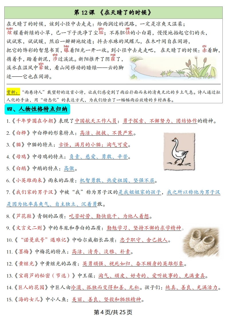 2095新版四年级下册语文全册重,点知识归纳古诗文归纳sl shi tianyuan za xingsu xin shi x刘gongdian四时田园杂兴(鲜兰平发)宿新市徐公店涩晖独步学花songfan cheng dasong yang wan IT[宋]范成大[宋]杨万里商]柱甫mei zi jTn huangxing z fei梅子金黄杏子肥,li luo sho sho yi jing shenhuang shT tqian jang shuldong篱落疏疏一径深,黄师塔前江水东,mai hua xue bai cai hua xTshu tou xin 10 wei cheng yin麦花雪白菜花稀。树头新绿未成阴。养完懒因香很觉。日笑禽落芜尖置,er tong ji zouzhuthuang die儿童急走追黄蝶,桃花”簇异无主,wei you qrng ting jia die feifei ru cai hua wu chu xun惟有蜻蜓蛱蝶飞。飞人菜花无处寻。ke ai shenhong ai qian hong可爱深红爱浅红?赏析:这首诗写初夏江南的田国景赏析:这首诗是描写农村早春风赏析:这首诗描绘了黄师塔前江水色。诗中用梅子黄、杏子肥、麦花光,诗人把景物与人物融为一体描东流,春天的景象在微风中显得慵懒困倦。整首诗通过白描手法,展白、莱花稀,写出了夏季南方农村绘,别有情趣。现出春日江畔自然而美好的景致,景物的特点,有花有果,有色有形。充满生活情趣。蜂du zuo jing ting shanfu rong lou song xin jian独坐敬亭山芙蓉楼送辛渐tang luo yintang wangchang ling[唐]罗隐周李台[唐]王昌龄bu lun ping di yu shan janzhong niao gao fei jinhan yu lian jiang ye nu wu不论平地与山尖,众鸟高飞尽,寒雨连江夜入吴,wu xian fengguang jin bei zhan我尝独去闲。ping mingsong ke chi shan go无限风光尽被占。平明送客楚山孤。采得省花成霎岩,xiang kan liang bu yanluo yang qTn you ru xiang wen相看两不厌,洛阳亲友如相问,wei shui xin ku wei shui ianyl pian bIng xin zai yu hu为谁辛苦为谁甜。只宥毅睪出。一片冰心在玉壶。赏析:通过对送别朋友时周围环境赏析:通过描写蜜蜂采花酿蜜供人享赏析:表达了诗人李白在经历了长期的描绘,既表达了诗人与朋友之间受的自然现象,象征性地反映了劳动的漂泊流离之后,面对大自然的孤独与的深厚情谊,也表达了诗人坚定不者不能享受其劳动成果的社会现象,自我慰藉。这首诗通过描绘诗人独自坐移的初心:虽然身处逆境之中,但表达了对劳动人民的同情和对不劳在敬亭山上的情景,抒发了诗人内心的仍然初心不改,保持着纯洁正直的而获者的痛恨和不满」孤独感和怀才不遇的愤懑之情。品质。第1页/共25页