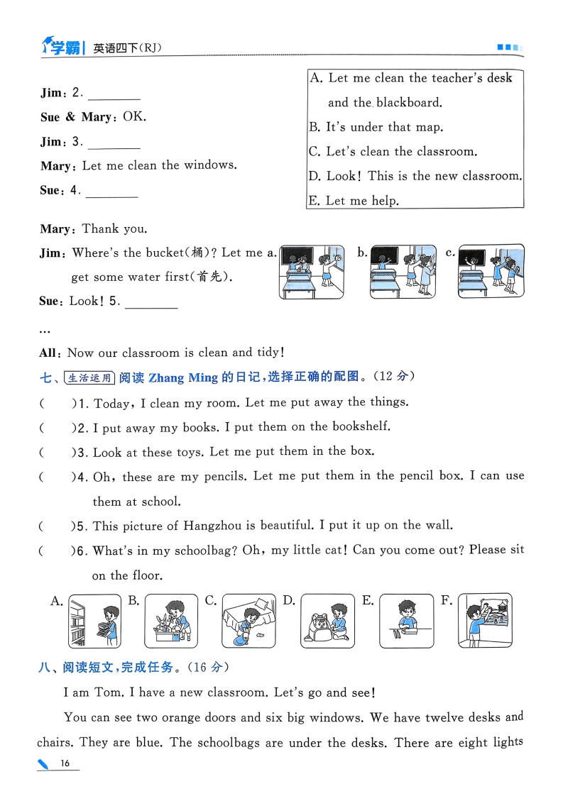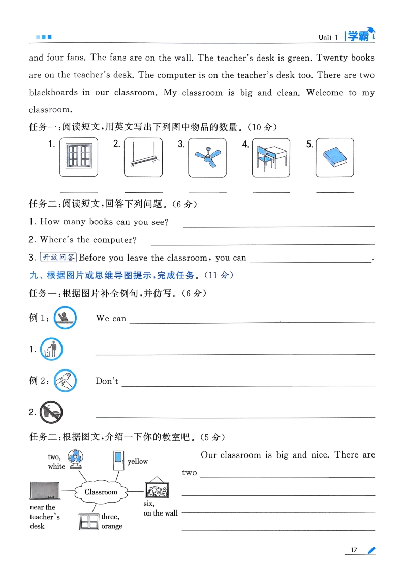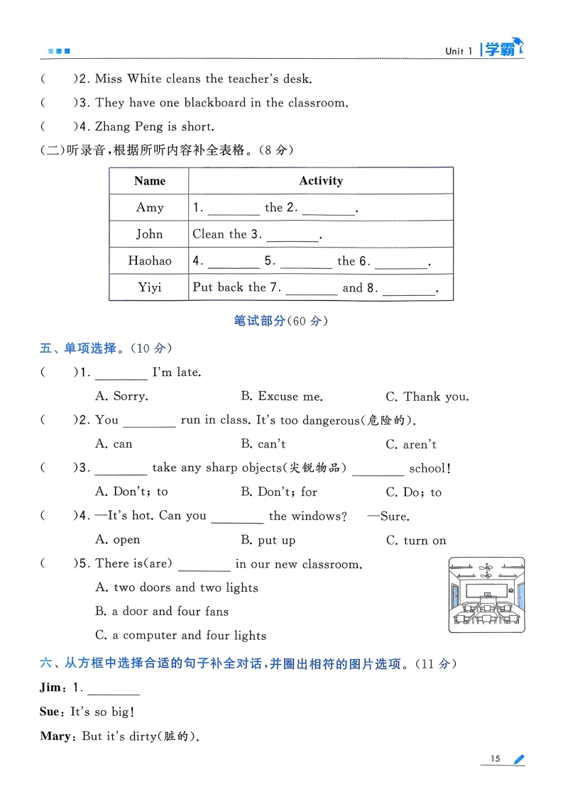 学霸|英语四下(RU)■■数Unit1提优卷(时间:60分钟满分:100分)听力部分(40分)一、听录音,选出与你所听内容相符的图片。(听两遍)(6分))1.AB)2.A.B.AD)3.AB.)4.A.B.)5.AB)6.A二、听录音,选择对应的问答句。(听两遍)(10分)()1.A.It's yellow.B.No.It's a chair.C.Many desks.()2.A.It's on the floor.B.It's my book.C.It's blue.()3.A.I can sing songs.B.I can clean the desks.C.I like my classroom.()4.A.Who is it?B.What are these?C.What's this?()5.A.Can you clean your room?B.Can I have some eggs?C.Can I draw on the chair?三、听录音,根据所听顺序给教室里的事物排序(在圆圈内填写数字),并涂上相应的颜色。(听两遍)(12分)Matt has a new classroom.Let's go and have a look.四、听录音,根据所听内容完成下列任务。(听两遍)(12分)(一)听录音,判断下列句子正(T)误(F)。(4分)()1.The students are in the classroom.14