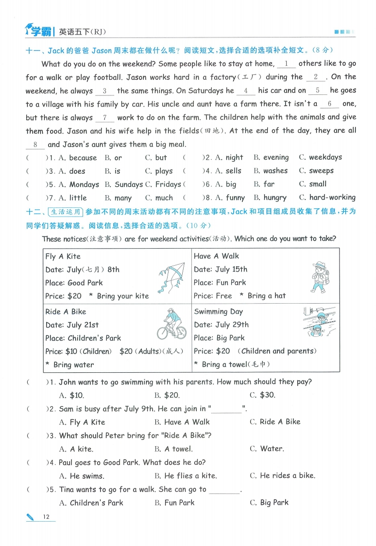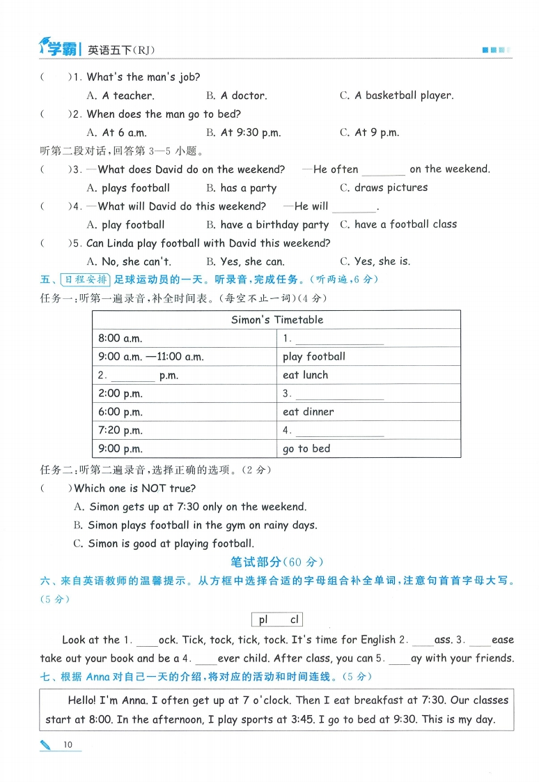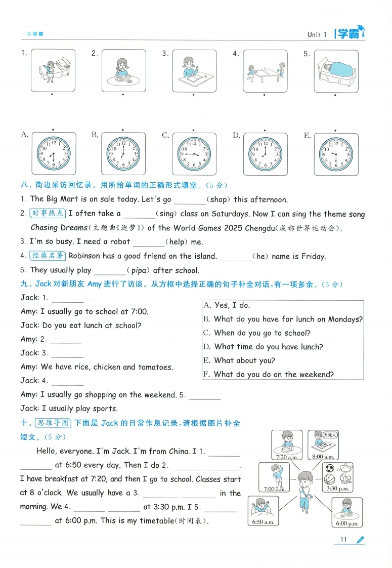 透湿湿Unit 11学霸Unit1提优卷(时间:60分钟满分:100分)谁的一天最充实?谁的一天最有意义?谁的一天最有趣?是同学?是警察?是医生?是老师?还是…?Jαck和项目组的小伙伴们带着这些问题,进行了访谈、记录和整理。听力部分(40分)一、听朋友们述说。听录音,请找出相应的图片。(听两遍,6分))1.AB.)2.A.B)3.AB.)4.A.B.)5.A)6.A.B.二、采访好友Bob。听录音,用数字给下列图片排序。(听两遍,8分)三、教师访谈录。听录音,选择正确的应答语。(听两遍,10分)()1.A.It's 8 o'clock.B.It's in the morning.C.At 8 o'clock.)2.A.I often read books.B.I can play the pipa.C.I don't play games.()3.A.I'm hard-working.B.I often play sports.C.I like playing music.()4.A.you're right!B.Me neither.C.That sounds like a lot of fun.)5.A.At 7:20 in the morningB.At 12:00 at noon.C.At 6:30 in the evening.四、街边随机采访录。听录音,选择正确的答案。(听两遍,10分)听第一段对话,回答第1一2小题。92