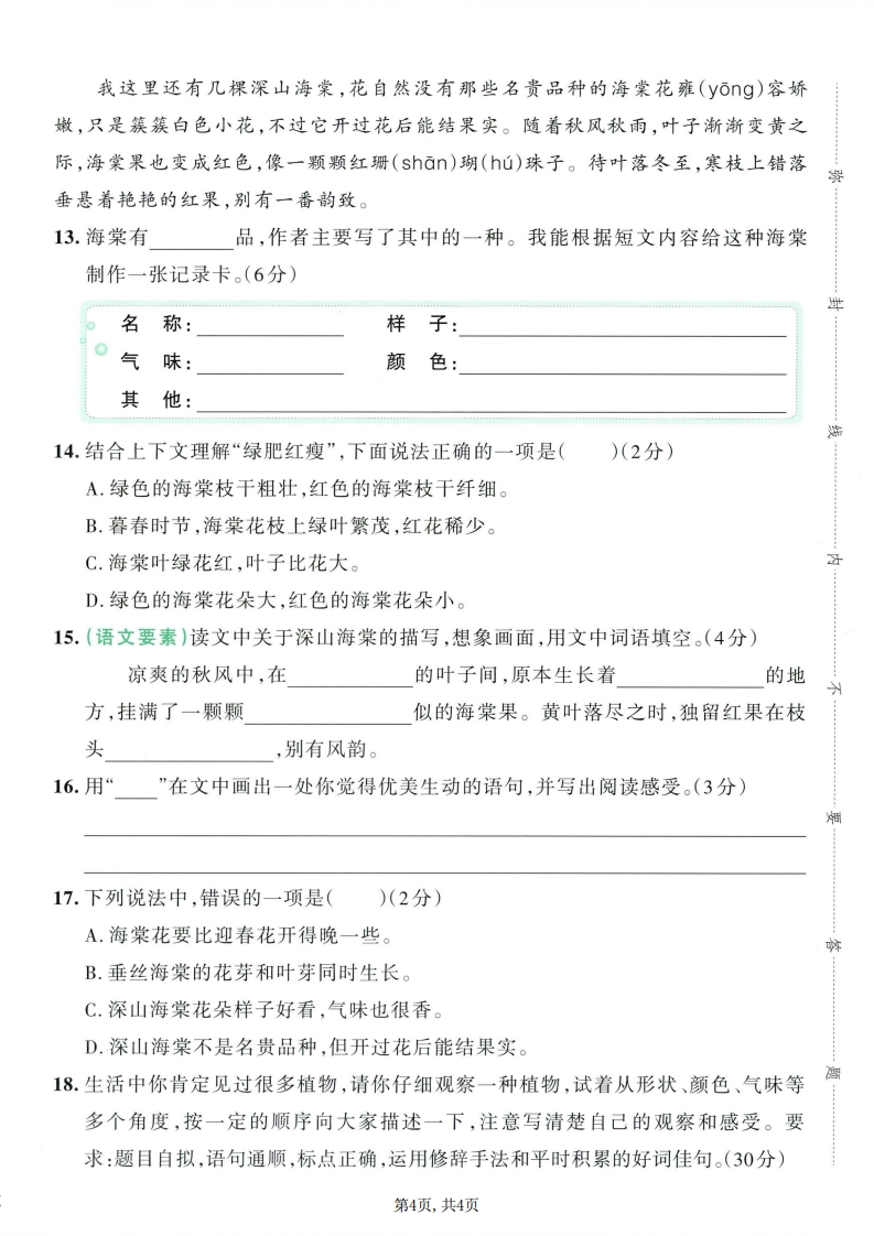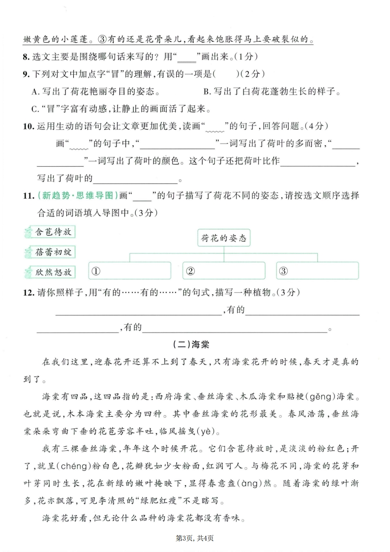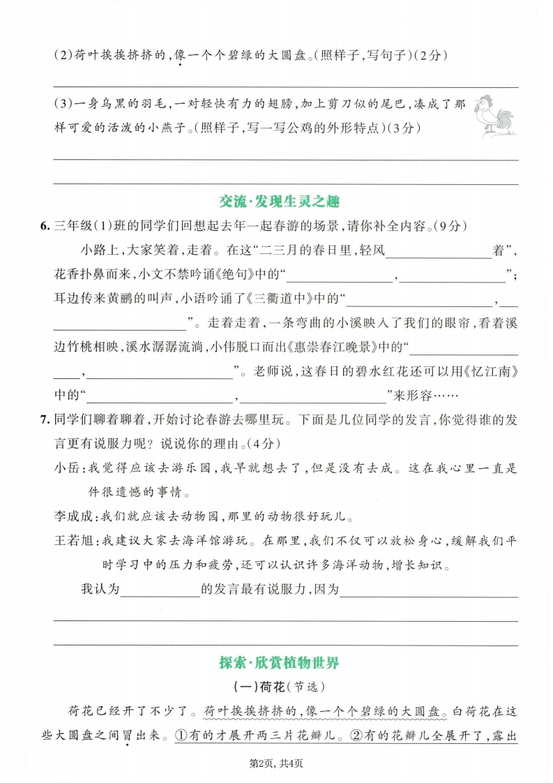 26春三年级下册语文第一单元综合素养评价985文库15天前发布关注私信7.30MB5页1493926春三年级下册语文第一单元综合素养评价此内容为付费资源,请付费后查看¥3 限时特惠¥9.9黄金会员免费钻石会员免费登录购买付费资源已售 1 开学季半价抢会员,享受免费下载 点击开通 文章目录 1 封面图 2 文档部分预览截图 3 下载地址 第1页 / 共5页 第2页 / 共5页 第3页 / 共5页 第4页 / 共5页 试读已结束,还剩1页,您可下载完整版后进行离线阅读 版权声明 1 本网站名称: 985文库 2 本站永久网址:https://985wenku.cn 3 本站资源部分来自网络,由老师收集整理,如有侵犯你的权益请联系管理员E-mail:240407401@qq.com 我们会第一时间进行审核删除。 开通网站会员,全站资料免费下载 THE END三年级资料 文本预览 小学学霸冲A卷·语文三年级下·RJ第一单元综合素养评价智能批改时间:90分钟满分:100分视频讲解学校正在选拔“可爱生灵观察员”,请你积极参与,展示你发现的“可爱生灵”。观察·亲近可爱生灵蛇1.读分享内容,用“”画去加点字的错误读音。(4分)孙(1)曾(zngcéng)祖父说,大自然给(gi)予了他无穷的力量。(2)一只蚂(mǎmà)蚁爬上了电线杆(gangǎn)。(3)我用笔杆(gangǎn)拨弄着草丛里的蚂(mǎmà)蚱。(4)挨(āii)了一天饿的仓鼠们紧紧挨(āii)在一起。2.读分享内容,根据拼音写字词。(7分)爸爸带着我去湿地公园写生。我看见芦苇随wi()风起舞;yuan yang毁)在一边休憩;远处有一群丹顶鹩,像gǎnj()似的còu()在一起,uěr()有几只飞起。爸爸凭着自己的jiy()画出它们飞翔的姿shi(),我们都rong()入了大自然的yishù()画中。3.(名校期末真题)读句子,用“V”选出合适的词语。(3分)》(1)一阵风吹来,湖面上碧波(荡漾飘荡)。(2)这只猫脚步(轻巧轻快),鼻子(灵巧灵敏),每次都能捉住老鼠。4.读句子,选择合适的四字词语填空。(不能重复)(6分)旷亮无比光彩夺目波光粼粼伶俐可爱翩翩起舞五彩缤纷我看到的湖面上泛起一圈圈圆晕,柔嫩的柳条在风中的天空中,无数的风筝上下翻飞;不远处的草地上有一群的孩子,他们奔跑着,欢笑着,为这一幅的图画又增添了几分色彩。器5.(名校期末真题)按要求完成句子练习。(7分)(1)一池的荷花在风中摇摆。(改写句子,把荷花当作人来写)(2分)第1页,共4页 查看更多 收起部分 喜欢就支持一下吧点赞9 分享QQ空间微博QQ好友海报分享复制链接收藏