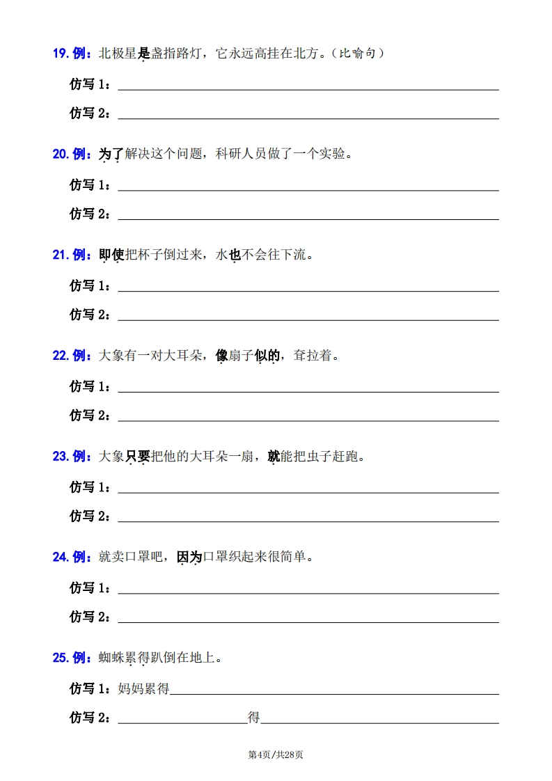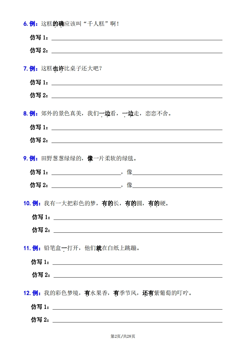 26春二年级下册语文句子专项拔高训练100题(六大专项含答案28页)985文库13天前发布关注私信1.05MB28页13181326春二年级下册语文句子专项拔高训练100题(六大专项含答案28页)此内容为付费资源,请付费后查看¥3 限时特惠¥9.9黄金会员免费钻石会员免费登录购买付费资源 开学季半价抢会员,享受免费下载 点击开通 文章目录 1 封面图 2 文档部分预览截图 3 下载地址 第1页 / 共28页 第2页 / 共28页 第3页 / 共28页 第4页 / 共28页 试读已结束,还剩24页,您可下载完整版后进行离线阅读 版权声明 1 本网站名称: 985文库 2 本站永久网址:https://985wenku.cn 3 本站资源部分来自网络,由老师收集整理,如有侵犯你的权益请联系管理员E-mail:240407401@qq.com 我们会第一时间进行审核删除。 开通网站会员,全站资料免费下载 THE END未分类 文本预览 二年级下册语文句子专项拔高训练100题(句子六大专项)专项一句子仿写包括重点字词仿写、关联词仿写、修辞手法仿写、句式仿写等。仿写的句子与例句在结构、内容、修锌、字数等方面要差不多。比如例句是比喻句,那仿写的也一定要是比喻句。1.例:春天像个害羞的小姑娘。仿写1:像仿写2:像2.例:小草从地下探出头来,那是春天的眉毛吧?仿写1:那是吧?仿写2:那是」吧?3.例:解冻的小溪叮叮咚咚地流淌着。(仿写拟声词)仿写1:可爱的小鸟地叫着。仿写2:绵绵的细雨地下着。4.例:门前开着,大片五颜六色的鲜花。山坡上池塘里小河边教室里5.例:一棵绿油油的小柏树栽好了,就像战士一样笔直地站在那里。仿写1:就像一样仿写2:就像样第1页/共28页 查看更多 收起部分 喜欢就支持一下吧点赞13 分享QQ空间微博QQ好友海报分享复制链接收藏