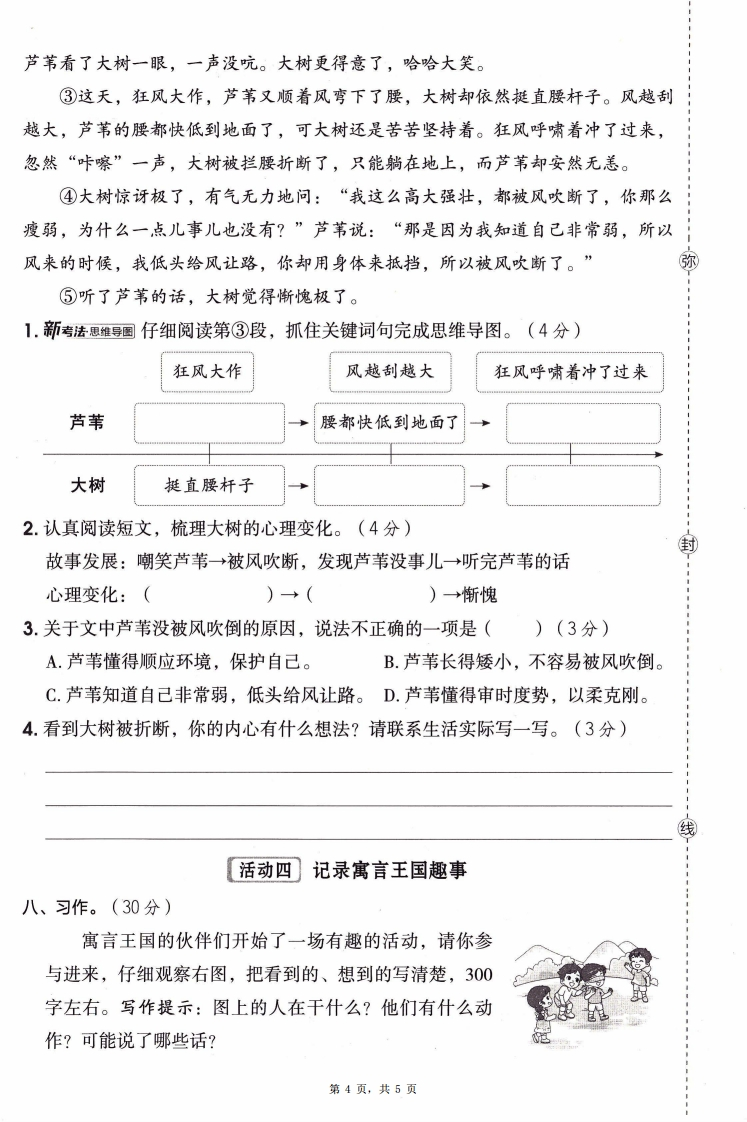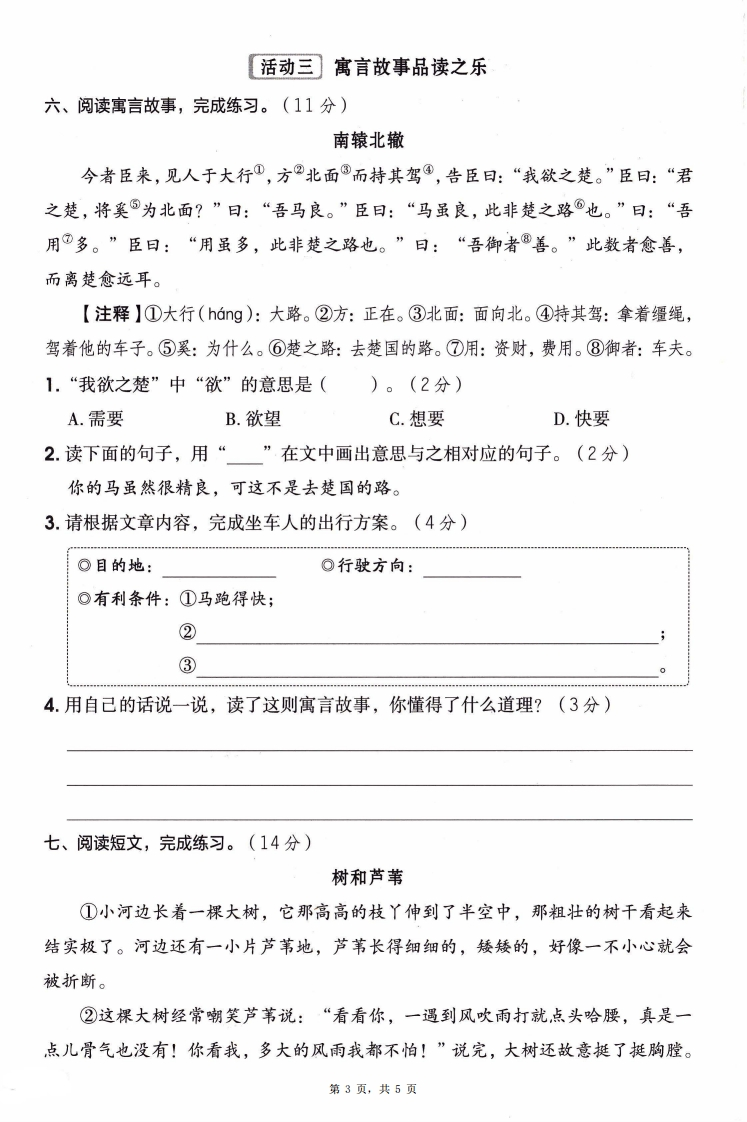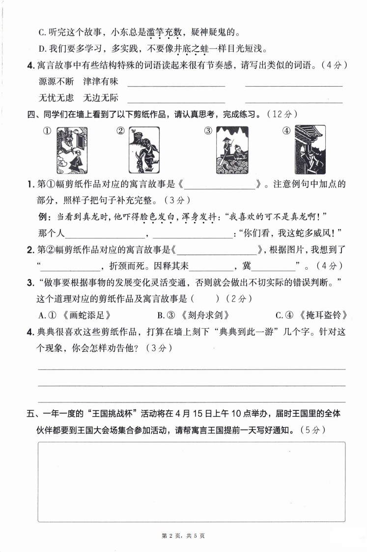 26春三年级下册语文第二单元主题情境卷含答案985文库10天前更新关注私信2.17MB5页1055826春三年级下册语文第二单元主题情境卷含答案此内容为付费资源,请付费后查看¥3 限时特惠¥9.9黄金会员免费钻石会员免费登录购买付费资源 开学季半价抢会员,享受免费下载 点击开通 文章目录 1 封面图 2 文档部分预览截图 3 下载地址 第1页 / 共5页 第2页 / 共5页 第3页 / 共5页 第4页 / 共5页 试读已结束,还剩1页,您可下载完整版后进行离线阅读 版权声明 1 本网站名称: 985文库 2 本站永久网址:https://985wenku.cn 3 本站资源部分来自网络,由老师收集整理,如有侵犯你的权益请联系管理员E-mail:240407401@qq.com 我们会第一时间进行审核删除。 开通网站会员,全站资料免费下载 THE END1-6年级语文同步单元试卷三年级资料 文本预览 26学年三年级下册语文主题情境卷时间:80分钟(第三单元)满分:100分寓言故事短小精悍,带给我们启迪。让我们一起走进寓言王国,感受寓言的魅力!活动一轻叩寓言王国大门一、请美观、工整地抄写下面的语句,作为寓言王国的入场券。(3分)生活也同寓言一样,不是以它的长短来衡量,而是以它的内容来衡量。二、寓言王国的大门已经开启,请阅读墙上的文字,完成练习。(15分)寓言传古今。那shǒuzhūdàitù()的宋人,成了流传千古的笑话。装成xùn liang()模样的狼,企图用hua yan qiǎoyi()蒙骗的shan liang)的山羊,诡计被识破后便èhěnhěn()地威胁,山羊却冷静回复:“iern()会来shou shi()你的。”jing měibiézhl()的鹿角差,点儿让鹿送了命,难看的腿却让鹿狮口tao sheng封()。寓言王国的大门里,一个个小小的故事,启迪着人生的智慧。:1.根据拼音,在括号里正确书写词语。(12分)2.加点字“模”是一个多音字,它在“模样”中读;它还有另一个读音可组词(3分)活动二寓言王国畅游之旅三、寓言王国历史悠久,同学们在参观时遇到一些问题,请帮忙解决。(10分)1.下列出自寓言故事的词语中,加点字的读音全部正确的一项是()(2分)A.耕耘(gng)希冀(y)B.匀称(cheng)相机(xiàng)线C.遵循(dn)撒谎(sā)D.衰老(ai)狡猾(hua)2.理解字义是读懂寓言的基础,下列加点字的解释有误的一项是()(2分)的A.田中有株(树桩)B.兔走触株(跑)C.因释其耒而守株(解释)D.冀复得兔(希望)3.下列出自寓言故事的成语运用不恰当的一项是()(2分)A.乐乐修改作文时加了很多无用的话,真是画蛇添足。B.生活是美好的,不要因为一些小小的失败而杞人忧天。第1页,共5页 查看更多 收起部分 喜欢就支持一下吧点赞8 分享QQ空间微博QQ好友海报分享复制链接收藏