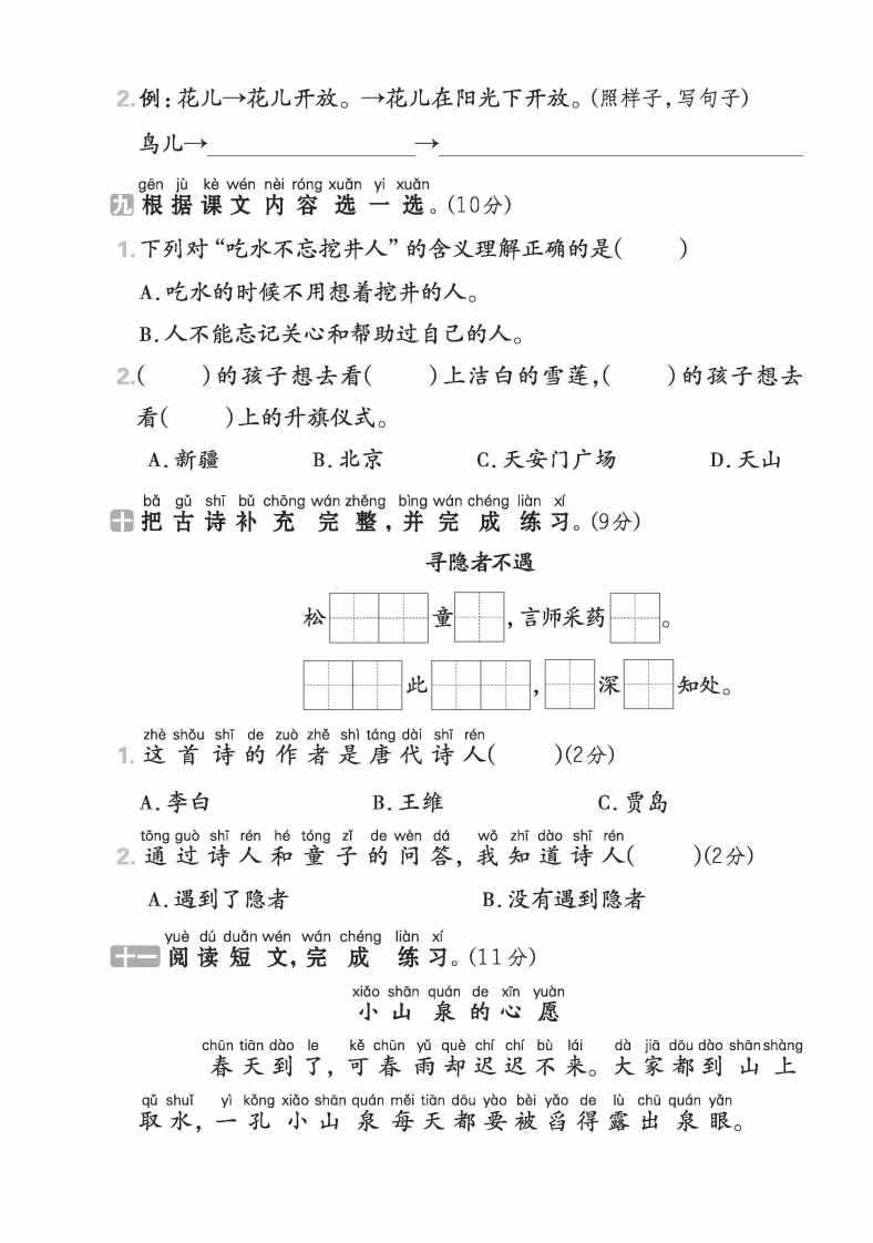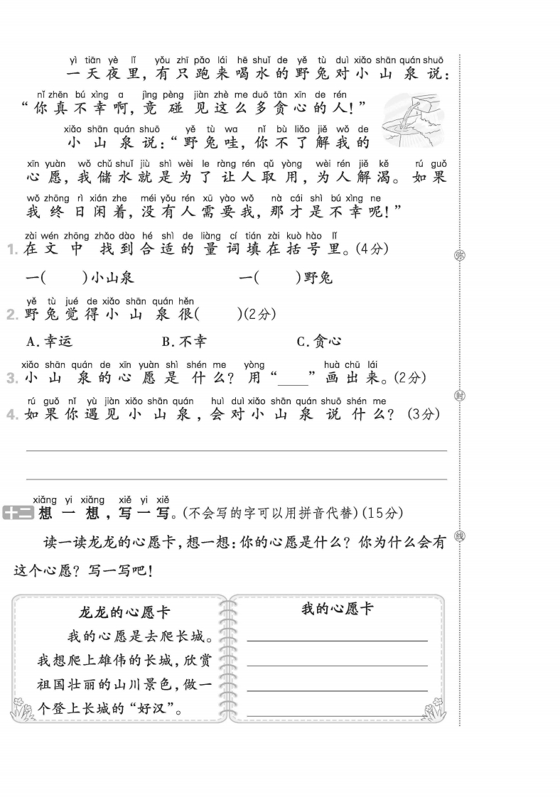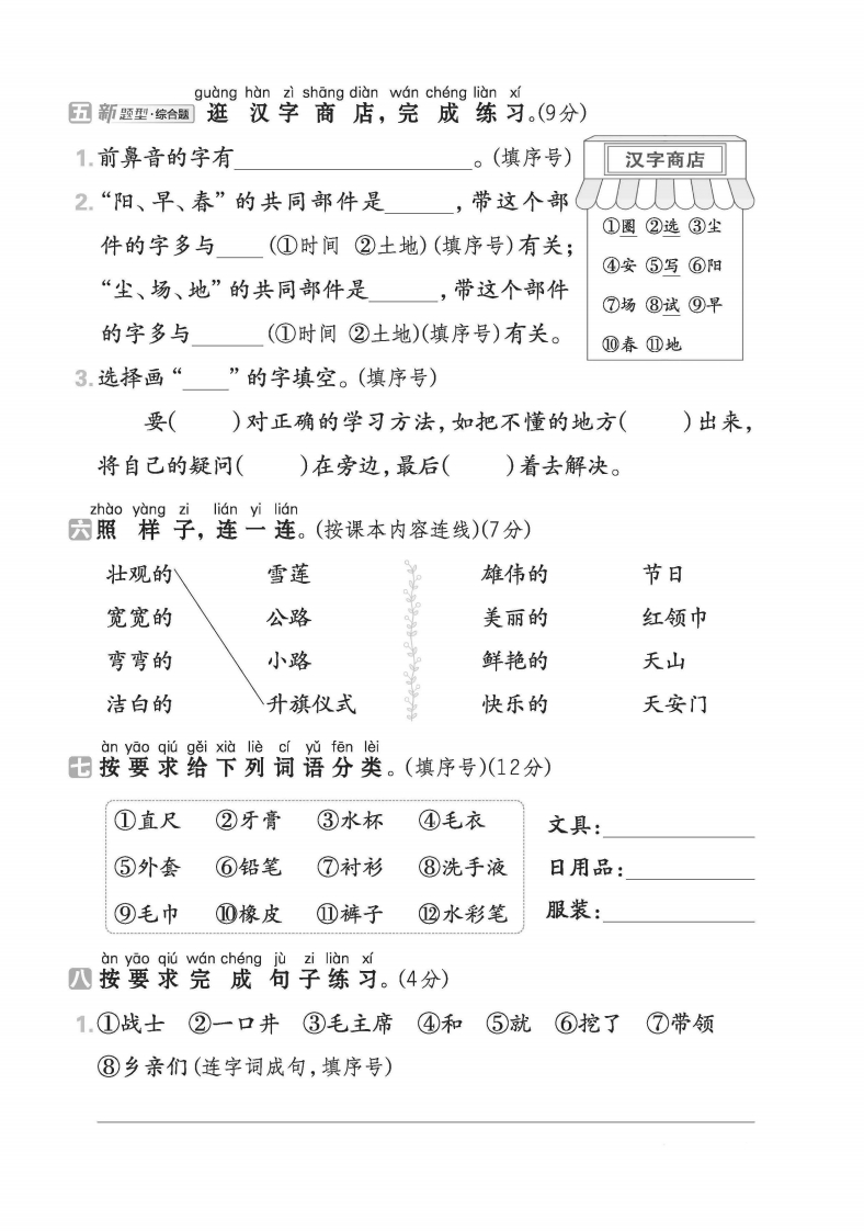 一年级第二单元综合素养测评〈A卷语文下(R)基础巩固与综合运用时阿:60分钟满分:100分an han yu pin yin zi mǔbiao de shùn xu tian yi tian按《汉语拼音字母表》的顺序填一填。(5分)Hbgěi jia dicǎn zi xuǒnz6zhèna que de diúyindǎ给加点字选择正确的读音,打“√”。(6分)热爱(rèIè)诉说(sùshù)公共(gnggong)涂画(tdyod))洁白(G1jie)乡亲(qinqing)kan pin yinězcf目看拼音,写字词。(8分)到renkěshur jinggong chǎndǎnghòu fangyang guangbei jingguang洒在天安门场上,人们四处走动,不huide线时有可爱小鸟从头顶飞过。xuǎn zi tian kong四选字填空。(4分)1.我主动要求帮助同学,老师说我有()意。主2.我和家人()在一起,很开心。住3.来()边散步的人都很爱护这里的环境。人红4.我用()色画笔给消防员叔叔画贺卡。