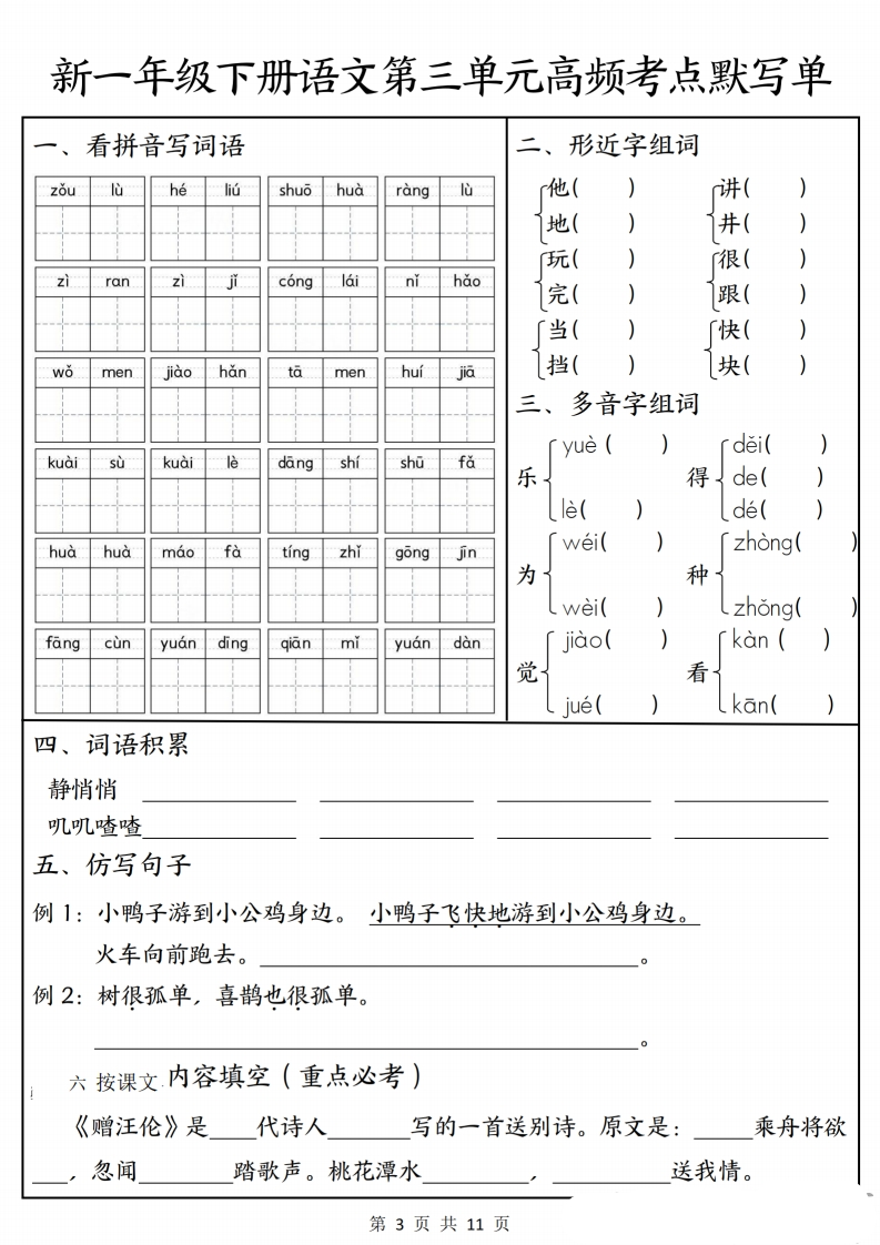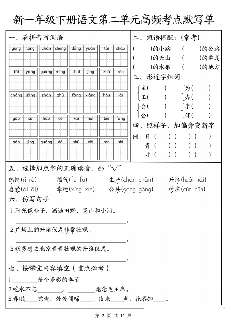 26春一年级下册语文1-4单元高频考点默写单含答案985文库7天前更新关注私信4.06MB6页1450626春一年级下册语文1-4单元高频考点默写单含答案此内容为付费资源,请付费后查看¥3 限时特惠¥9.9黄金会员免费钻石会员免费登录购买付费资源 开学季半价抢会员,享受免费下载 点击开通 文章目录 1 封面图 2 文档部分预览截图 3 下载地址 第1页 / 共6页 第2页 / 共6页 第3页 / 共6页 第4页 / 共6页 试读已结束,还剩2页,您可下载完整版后进行离线阅读 版权声明 1 本网站名称: 985文库 2 本站永久网址:https://985wenku.cn 3 本站资源部分来自网络,由老师收集整理,如有侵犯你的权益请联系管理员E-mail:240407401@qq.com 我们会第一时间进行审核删除。 开通网站会员,全站资料免费下载 THE END一年级资料未分类 文本预览 新一年级下册语文第一单元高频考,点默写单一、看拼音写词语二、描写春天的词语:(常考)chunyud6ngxuěchuifenghuaduo()()大地()物复苏柳绿()()()歌()舞()()融化泉()叮咚qifeirukǒushenmeduome()()齐放()()争鸣三、形近字组词「人()「么(gǔ1ǎoerhushuangshouyuyanL入(L公()土()左()qingchunqingshuiqingtianhemiaoL王()在(四、反义词出一()降一()好一(gingjinshengrixiězihongse左一()浊一()古一()双一()少一()有一()五、汉字变魔术xingdongwaniwulunmingtian弓+长=()小+土=(木+子=(言+午=()wenhuakǎche日+青=()古+月=(pianmianhezuò口+天=(子+小=(云+力=(日+寸=(六、对号入座晴情睛清请心()()坐()问()水()天眼()七、仿写句子例:1你姓什么?我姓陈。什么陈?耳东陈。他姓什么?他姓章。2.我们的祖国多么广大。八、按课文内容填空(重点必考)1.吹落,降,飘,这说的就是一年里、四个季节的天气。2.他姓?他姓张。张?张。胡,吴,徐,许。第1页共11页 查看更多 收起部分 喜欢就支持一下吧点赞6 分享QQ空间微博QQ好友海报分享复制链接收藏