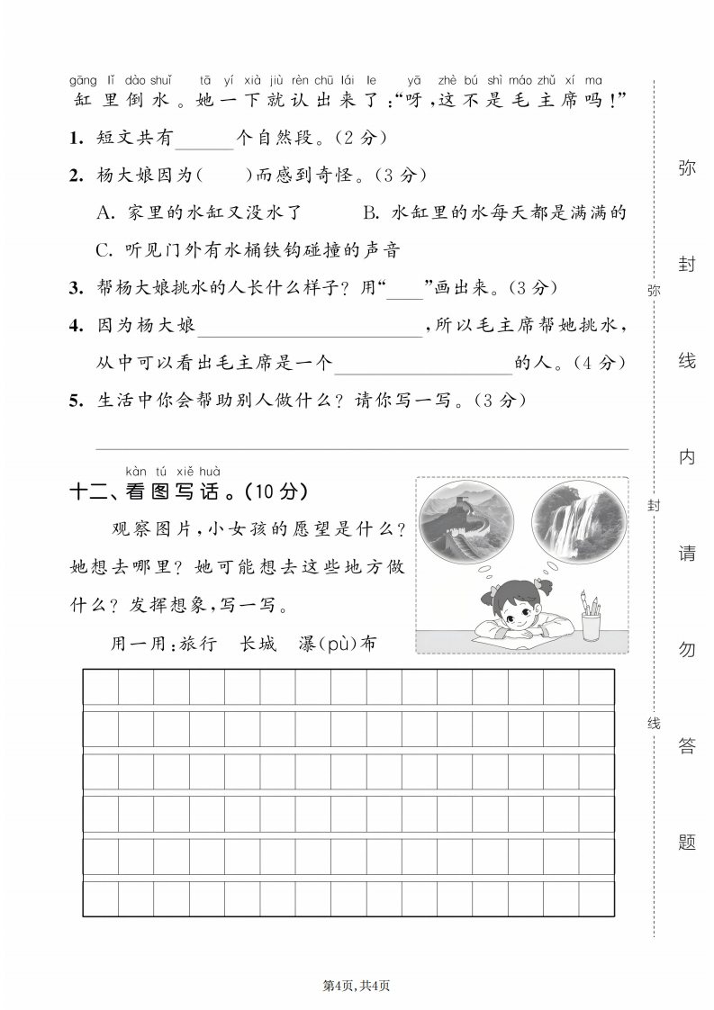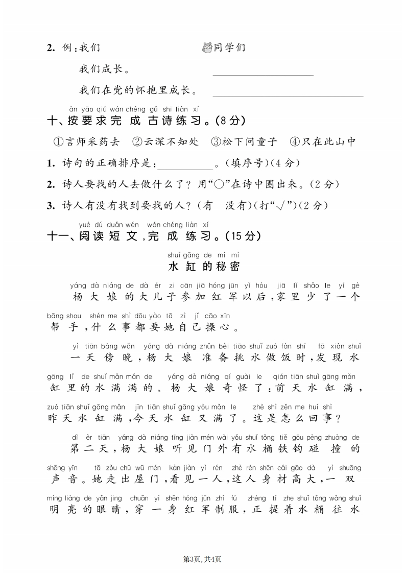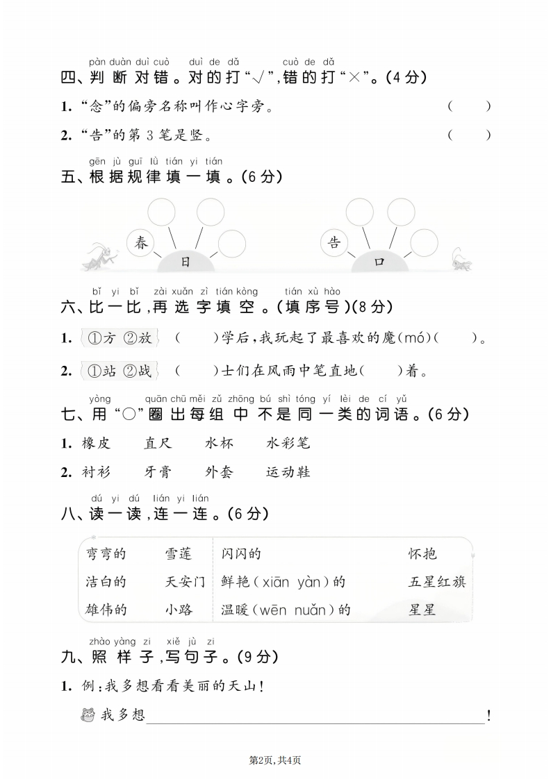 26年一年级下册语文单元达标检测卷第二单元达标检测卷时间:60分钟满分:100分题号三四五六七九十二总分得分nzhao yi zhao lian yi lian弥一、找一找,连一连。(8分)BRMkan pin yinxiězici毁二、看拼音,写字词。(12分)gong chan dangtaiyangde封就像照亮了我们生活。zhùchang jiang馨2.我在边上的一个村子里。renxiěhui3.我们只有真字,才取得进步。线yònggei jia dian zi xuan ze zheng que de du yin三、用“/”给加点字选择正确的读音。(8分)幸福(xinxing)非常(fihuT)摇怀抱(bā0bào)想念(xdngxiang)走路(zǒuZhǒu)试一试(shsi)北京(jinjing)美丽(ini)第1页,共4页
