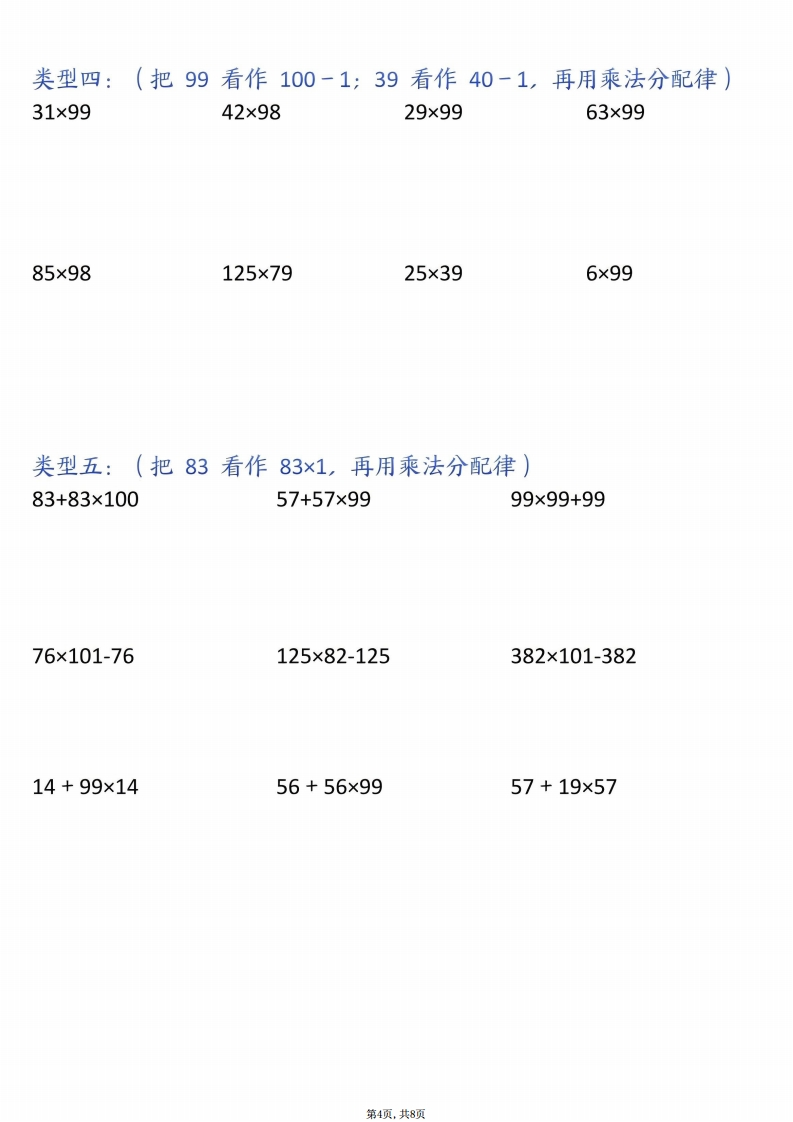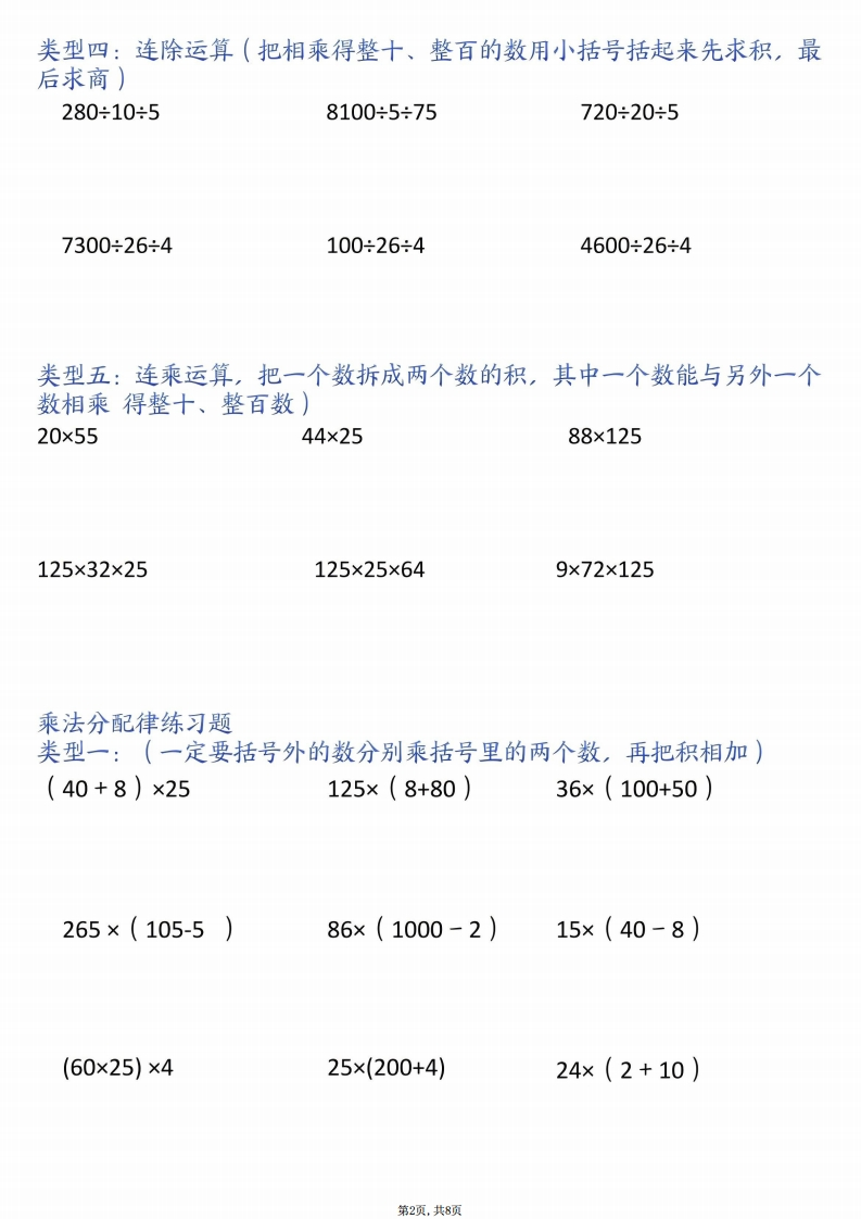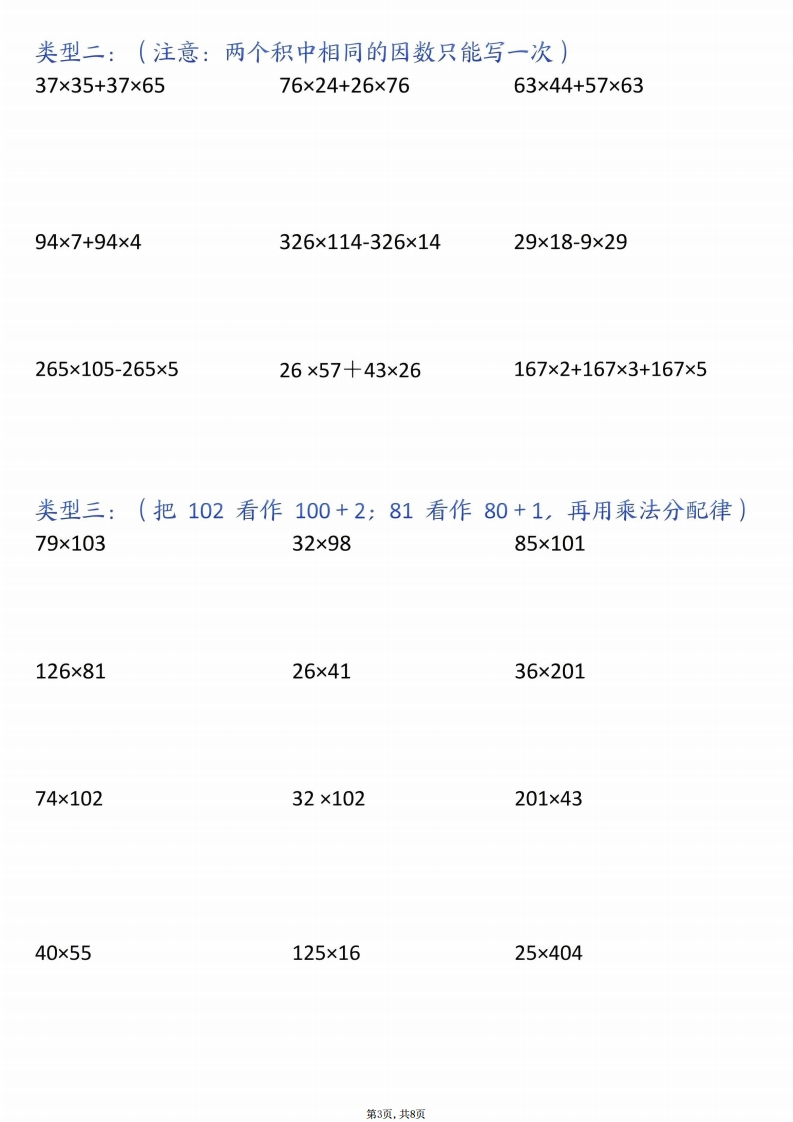 26春四年级下册数学《运算分配律》专项练习含答案985文库2小时前更新关注私信3.08MB8页6051426春四年级下册数学《运算分配律》专项练习含答案此内容为付费资源,请付费后查看¥3 限时特惠¥9.9黄金会员免费钻石会员免费登录购买付费资源 开学季半价抢会员,享受免费下载 点击开通 文章目录 1 封面图 2 文档部分预览截图 3 下载地址 第1页 / 共8页 第2页 / 共8页 第3页 / 共8页 第4页 / 共8页 试读已结束,还剩4页,您可下载完整版后进行离线阅读 版权声明 1 本网站名称: 985文库 2 本站永久网址:https://985wenku.cn 3 本站资源部分来自网络,由老师收集整理,如有侵犯你的权益请联系管理员E-mail:240407401@qq.com 我们会第一时间进行审核删除。 开通网站会员,全站资料免费下载 THE END四年级资料 文本预览 四年级下册数学运算分配律专项练习类型一:连加运算(把相加得整十、整百的数用小括号括起来先求和)827+16+86120+82+260369+30+33356+261+141+246136+40+66+12127+55+75+47类型二:连减运算(把后两个减数相加得整十、整百的数用小括号括起来先求和,最后求差)】646-181-246703-55-47601-138-64473-164-38655-200-112891-133-269类型三:连乘运算(把相乘得整十、整百的数用小括号括起来先求积)26×15×4126×20×828×5×2529×5×2514×125×4×851×60×6×5第1页,共8页 查看更多 收起部分 喜欢就支持一下吧点赞14 分享QQ空间微博QQ好友海报分享复制链接收藏