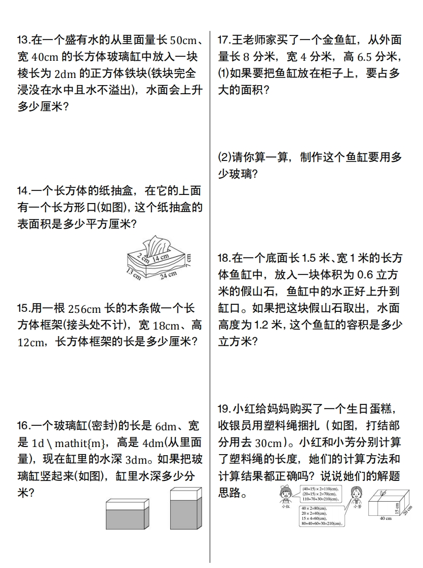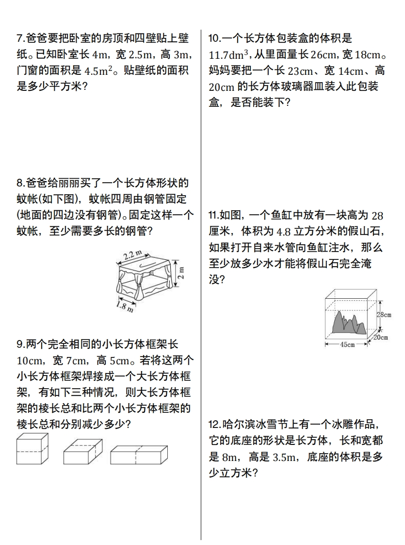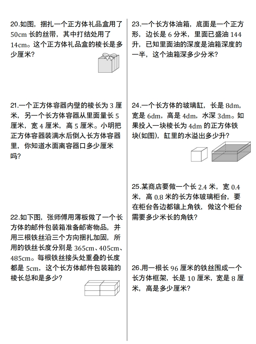 五年级下册数学专项提升练习长方体正方体学校:姓名:班级:1如图是一个密封的长方体容器,里面4.挖一个长8m、宽6m、深2m的蓄水深24cm。如果以这个容器的左侧面水池。如果给这个蓄水池的四周和底为底,把长方体容器竖起来,这时水部抹上水泥,抹水泥部分的面积是多深多少分米?少平方米,这个蓄水池最多能蓄水多少吨?(1m3的水重1t)4 dm2.下面是一块带有折痕的纸板,将它按折痕折成一个无盖的长方体盒子,5.有一块长方形铁皮(如图),从四个角开口向上,给这个长方体盒子的外面各剪去一个边长为2厘米的正方形,贴上广告纸,贴广告纸的面积至少是再折叠焊接成一个无盖的长方体盒子。多少平方厘米?(单位:厘米)焊接后这个无盖的长方体盒子的容积是多少立方厘米?12厘米6.把一块长16cm,宽4cm,高8cm的长方体铁块熔化后铸成一块正方体3.一瓶橙汁有1升,小华每次喝200铁块,这块正方体铁块的棱长是多少毫升,喝了3次,剩下的还可以喝几厘米?次?